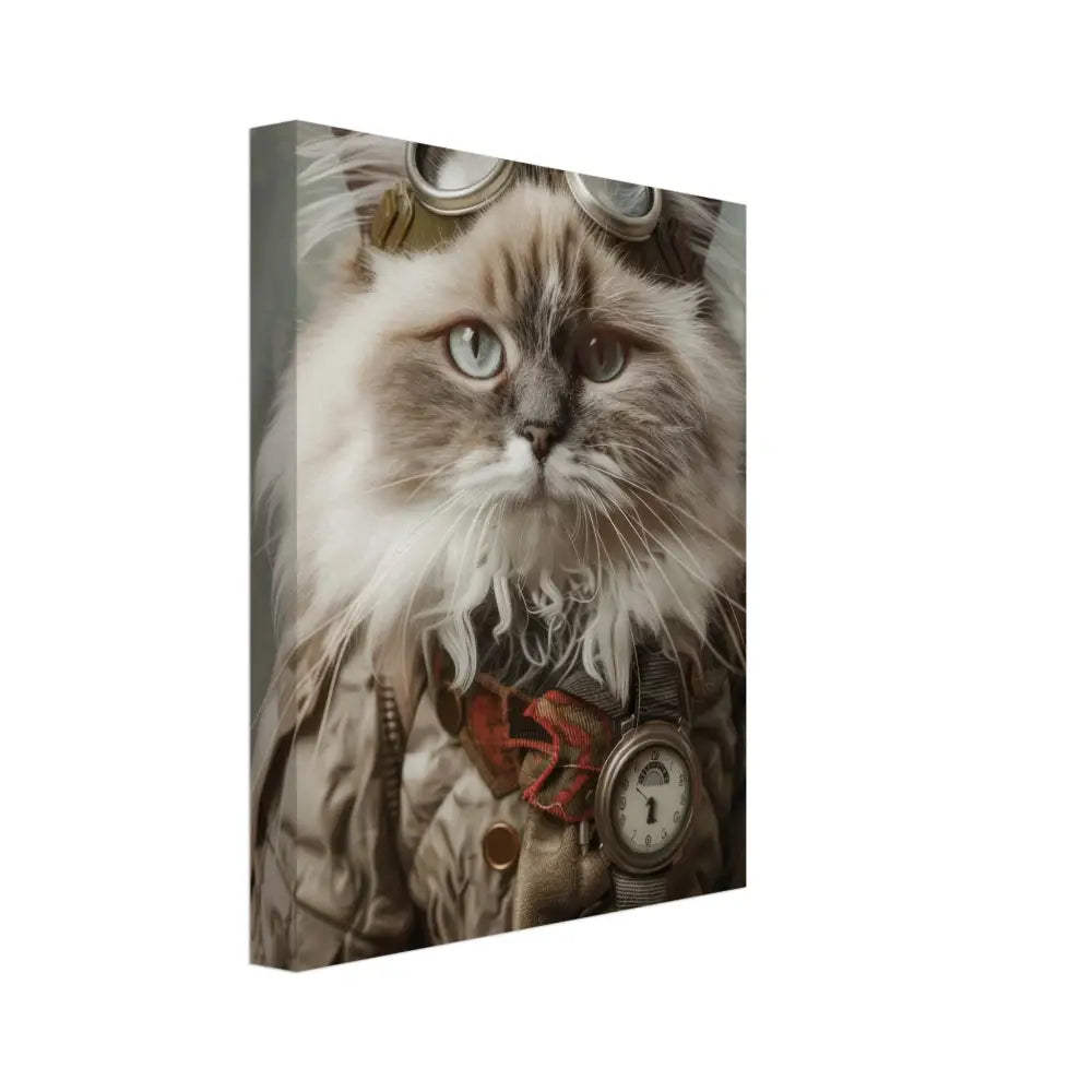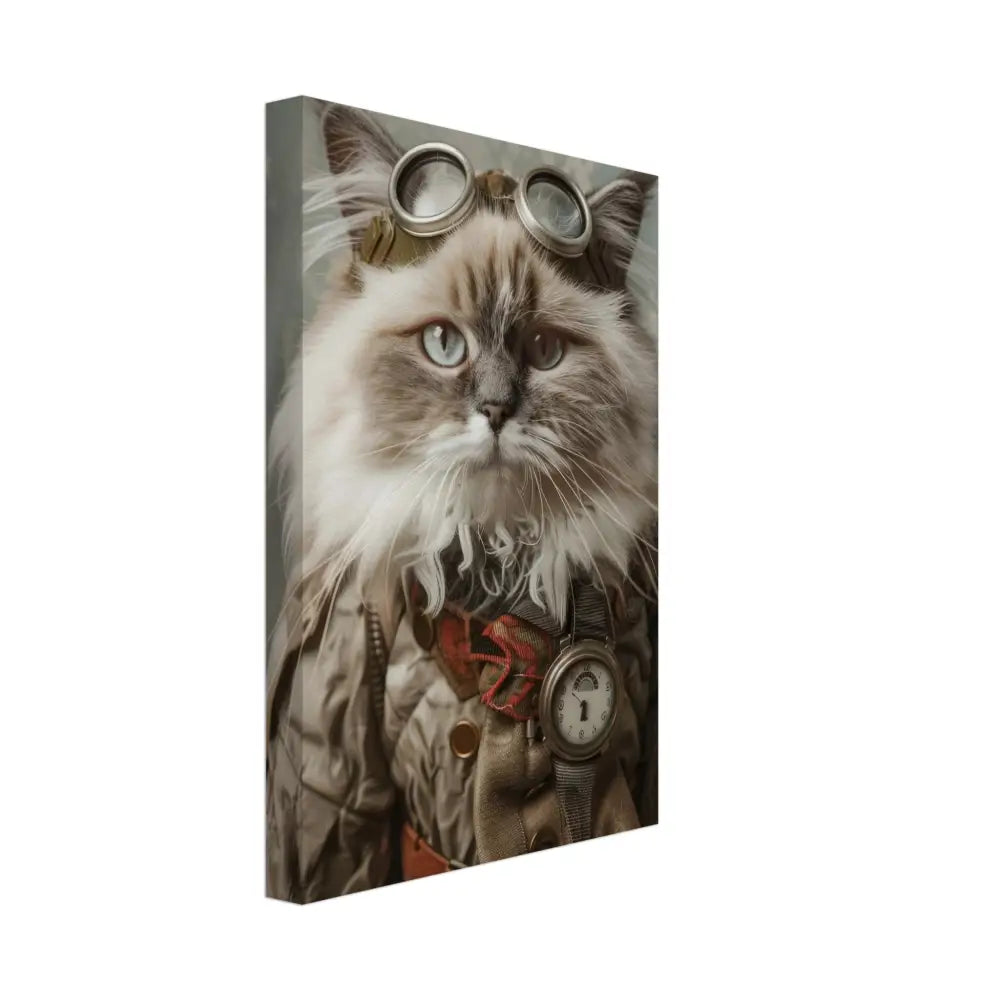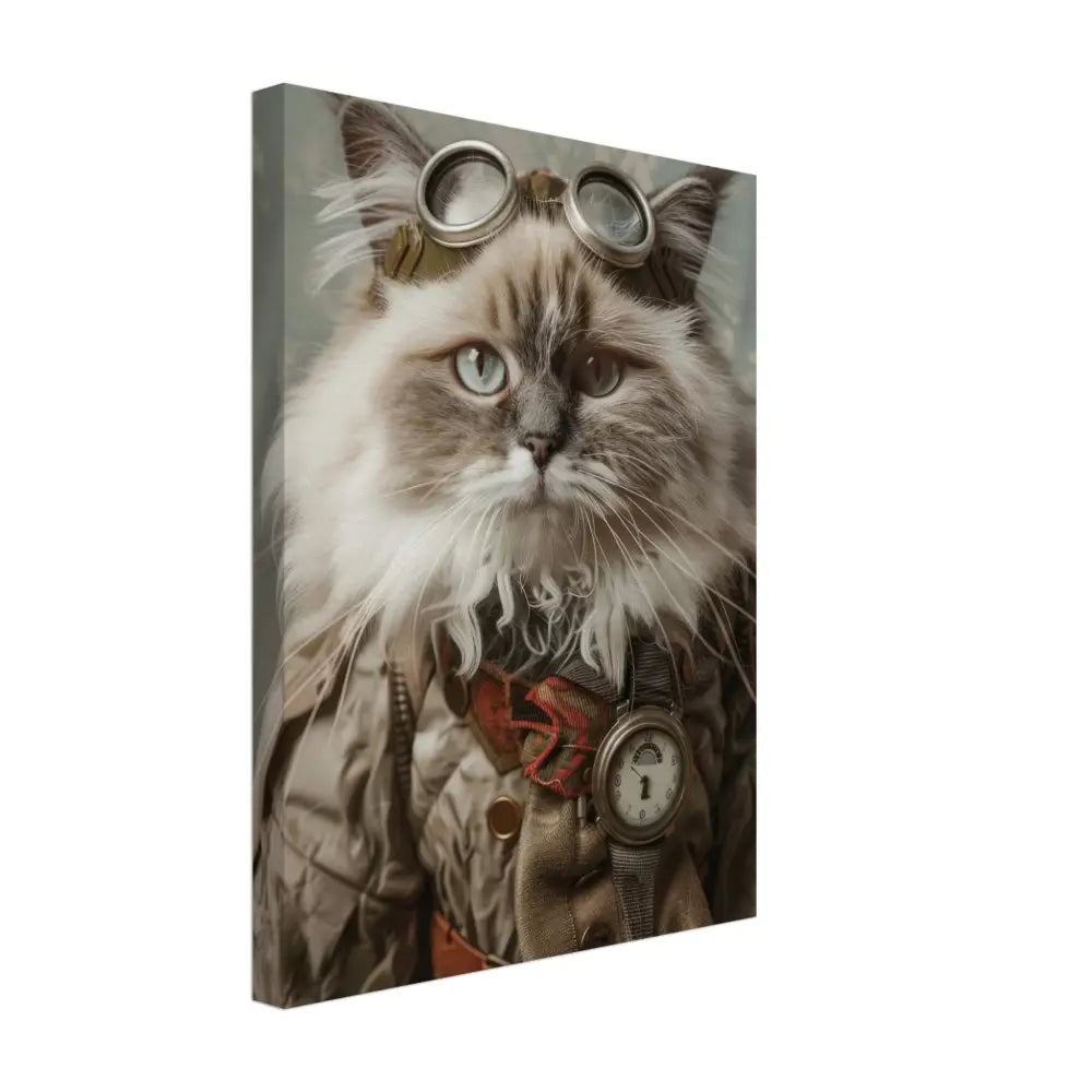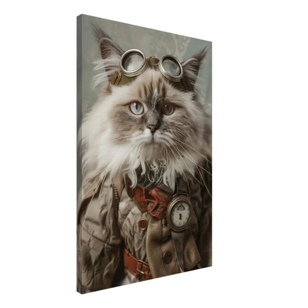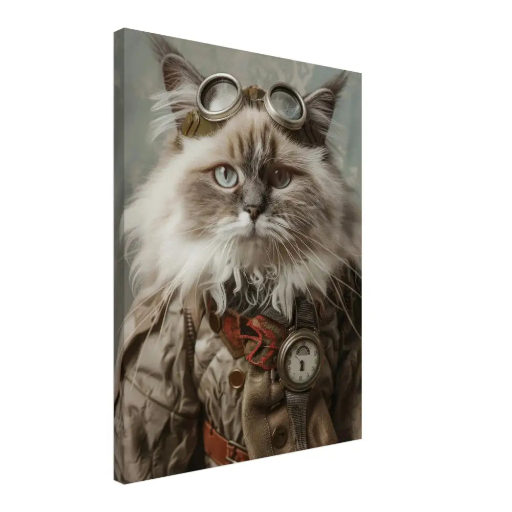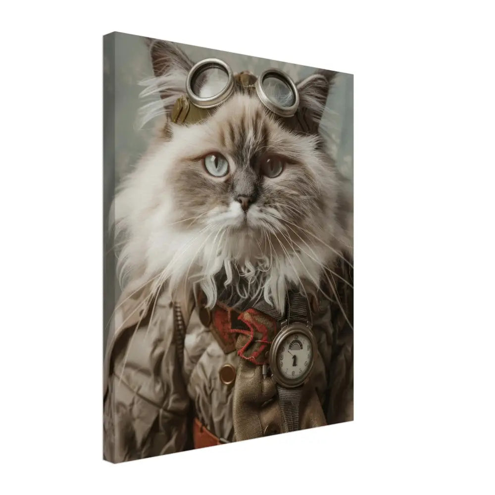Dit schilderij toont een kat, gekleed in een prachtige vintage steampunk outfit. Hij draagt een gedetailleerde jas met een bronskleurige tint en subtiele stiksels. Om zijn nek hangt een antieke zilveren klok, die zijn verfijnde stijl benadrukt. Op zijn hoofd prijkt een paar grote, retro-futuristische brillen met metalen details in een gepatineerde zilvertint, wat hem een fascinerende, mechanistische uitstraling geeft. Zijn voorpoten zijn geaccentueerd met elegante, grijze bontachtige manchetjes. Op de achtergrond is een romantisch bloemenbehang te zien, wat bijdraagt aan de nostalgische sfeer van het geheel.