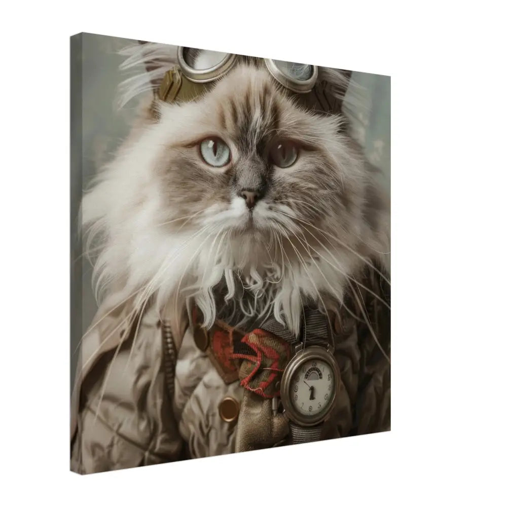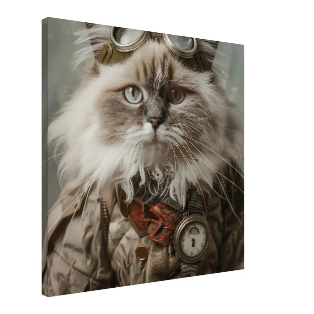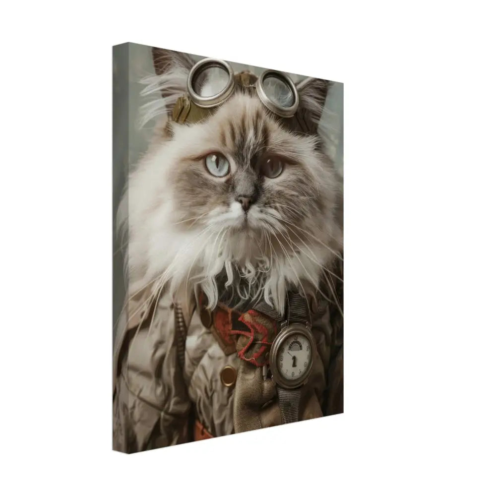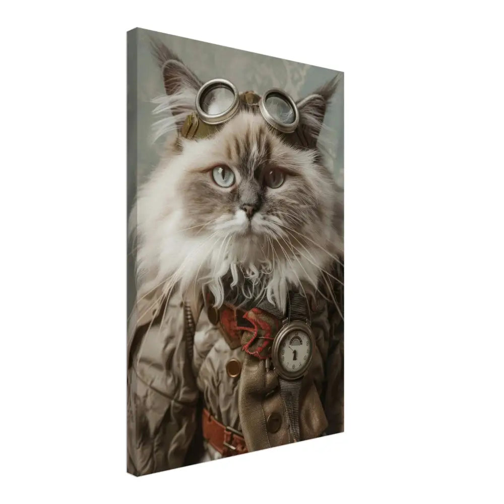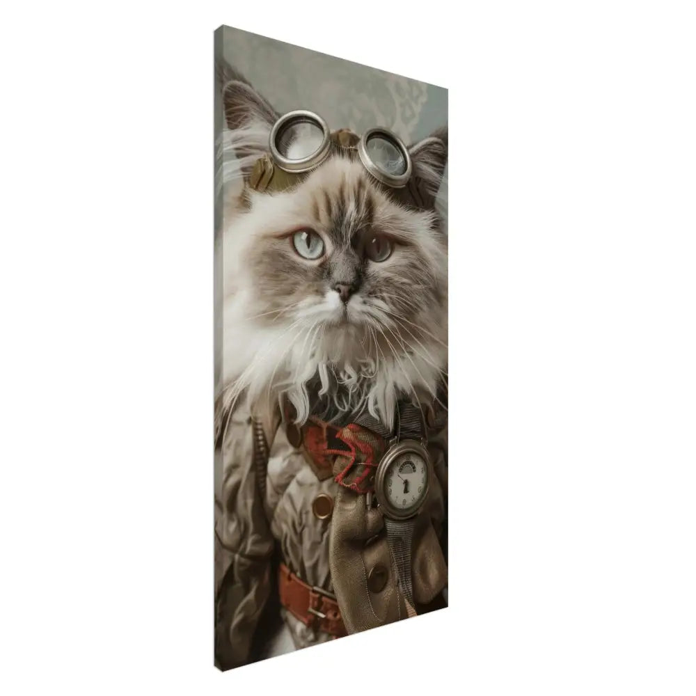 Dit schilderij toont een kat, gekleed in een prachtige vintage steampunk outfit. Hij draagt een gedetailleerde jas met een bronskleurige tint en subtiele stiksels. Om zijn nek hangt een antieke zilveren klok, die zijn verfijnde stijl benadrukt. Op zijn hoofd prijkt een paar grote, retro-futuristische brillen met metalen details in een gepatineerde zilvertint, wat hem een fascinerende, mechanistische uitstraling geeft. Zijn voorpoten zijn geaccentueerd met elegante, grijze bontachtige manchetjes. Op de achtergrond is een romantisch bloemenbehang te zien, wat bijdraagt aan de nostalgische sfeer van het geheel.