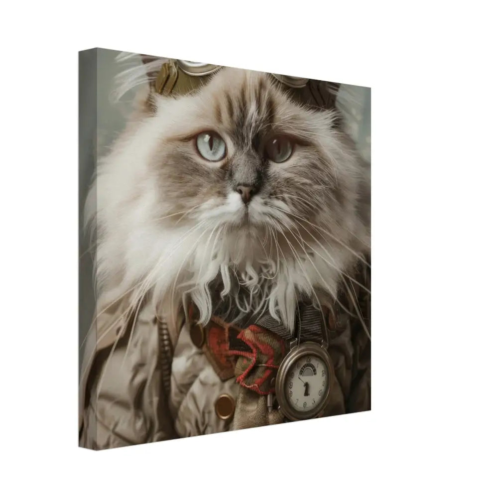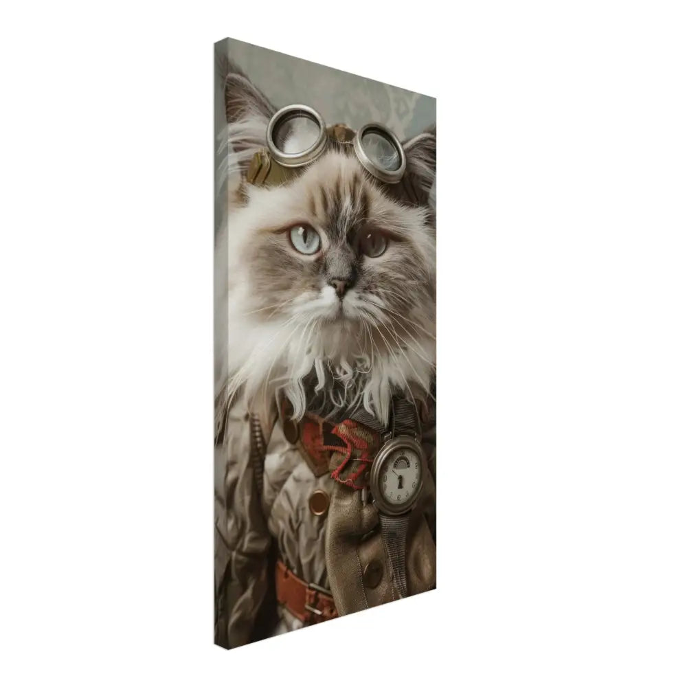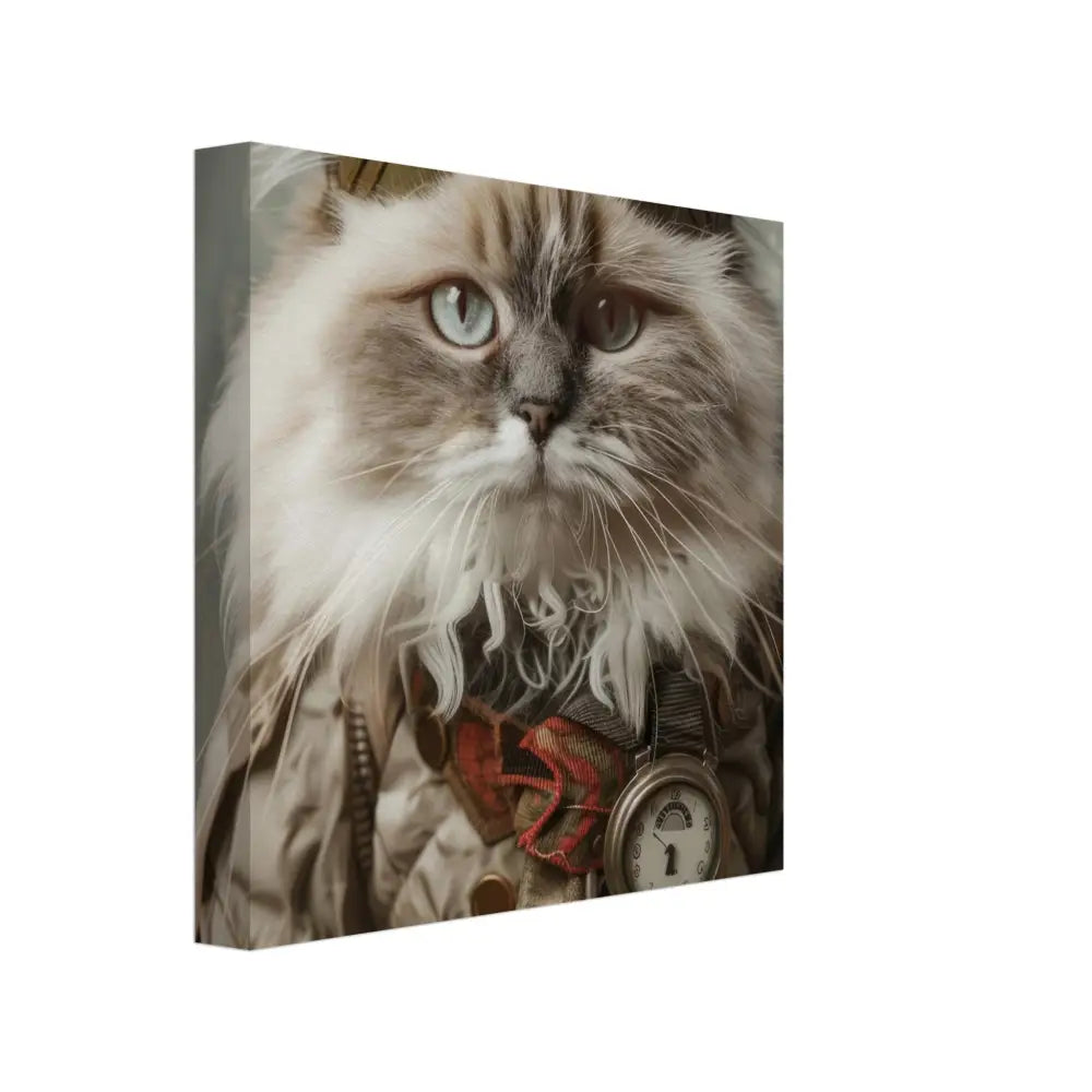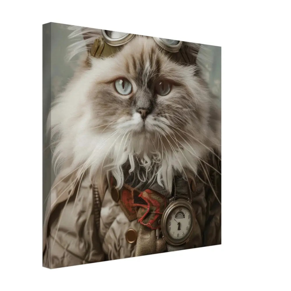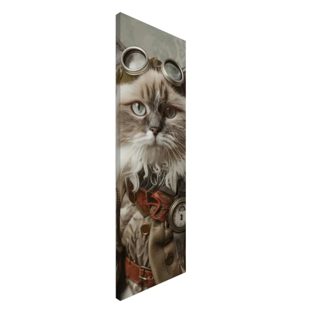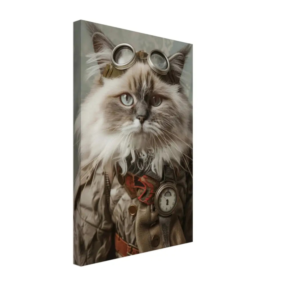 Dit schilderij toont een kat, gekleed in een prachtige vintage steampunk outfit. Hij draagt een gedetailleerde jas met een bronskleurige tint en subtiele stiksels. Om zijn nek hangt een antieke zilveren klok, die zijn verfijnde stijl benadrukt. Op zijn hoofd prijkt een paar grote, retro-futuristische brillen met metalen details in een gepatineerde zilvertint, wat hem een fascinerende, mechanistische uitstraling geeft. Zijn voorpoten zijn geaccentueerd met elegante, grijze bontachtige manchetjes. Op de achtergrond is een romantisch bloemenbehang te zien, wat bijdraagt aan de nostalgische sfeer van het geheel.