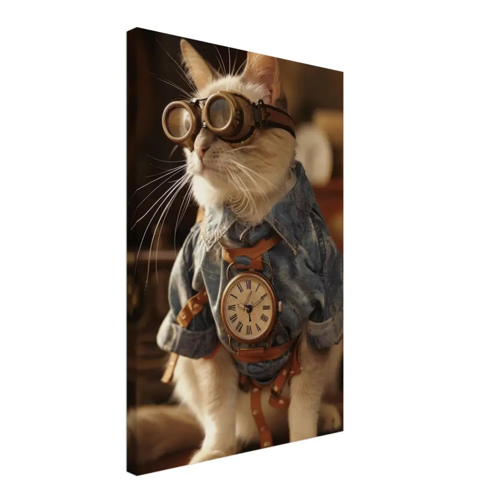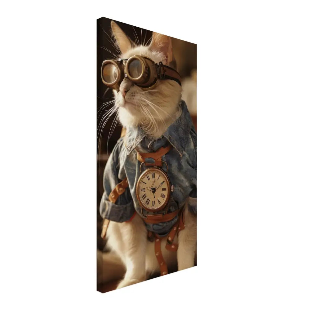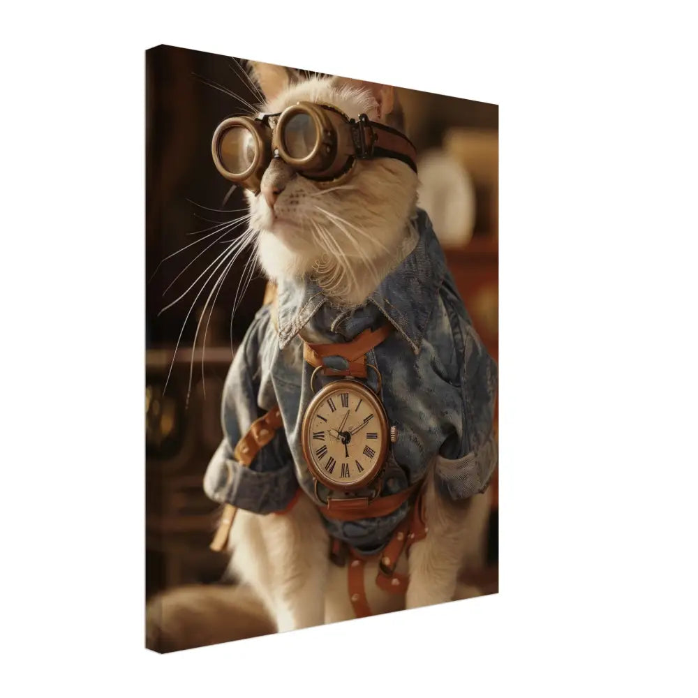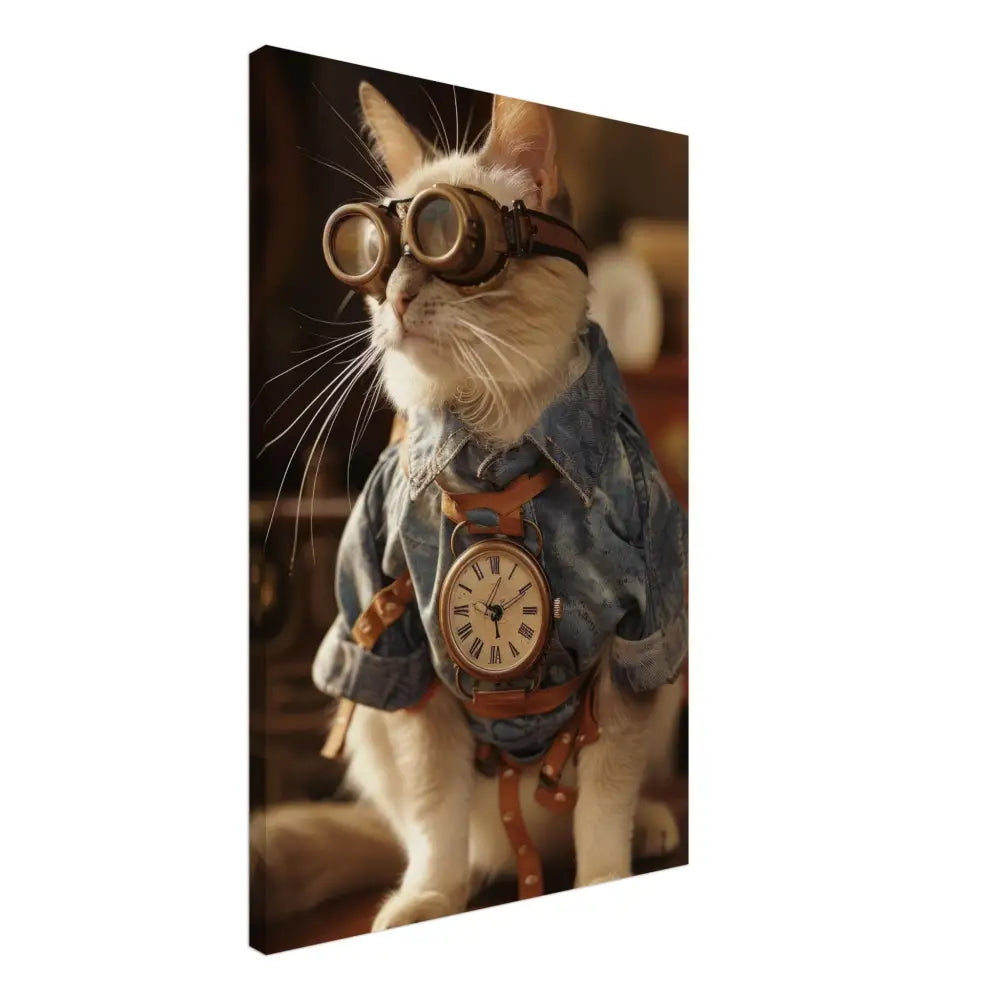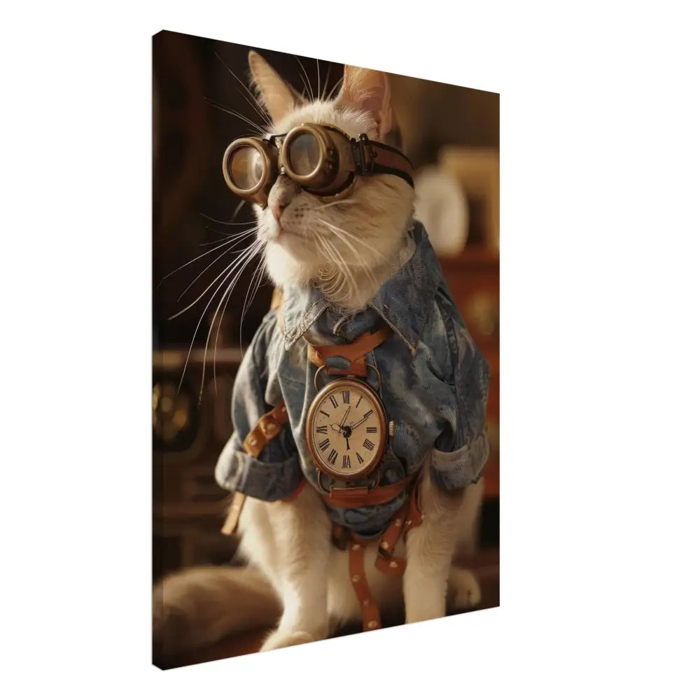 Dit schilderij toont een kat, gekleed in een prachtige vintage steampunk outfit. Hij draagt een stijlvolle, blauw-denim jas met lichte slijtagedetails en leren accenten. Om zijn nek hangt een antieke bronzen klok met een elegante romeinse wijzerplaat, wat zijn uitstraling van zowel elegantie als avontuur versterkt. Zijn kop wordt gesierd door een paar markante, retro-futuristische brillen met robuuste metalen details in een bronzen tint, die zijn nieuwsgierige, ontdekkingsreiziger-aard benadrukken. Extra accessoires zoals de leren riempjes en de contrasterende stiksels maken zijn outfit compleet. De achtergrond heeft een warme, rustieke tint, die de vintage sfeer van het geheel versterkt.