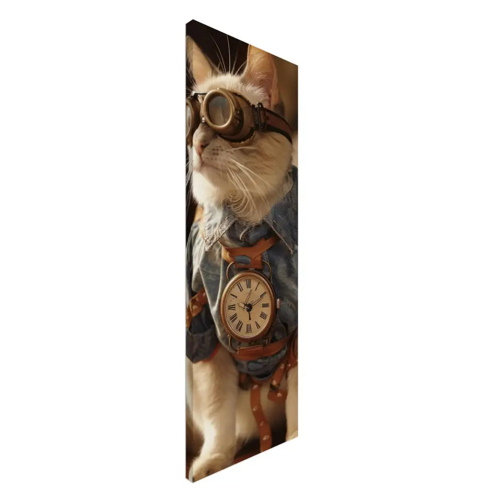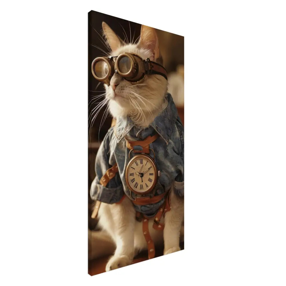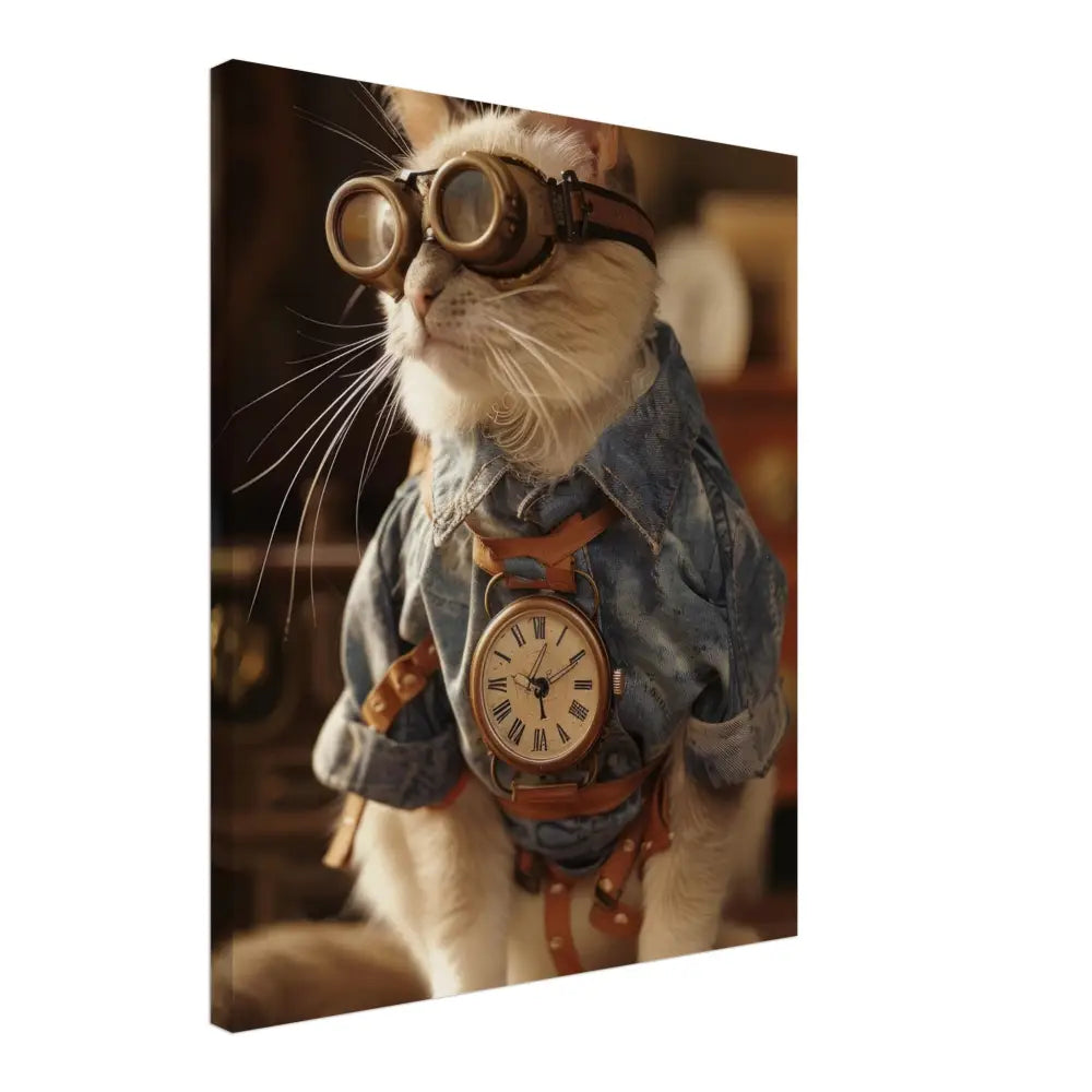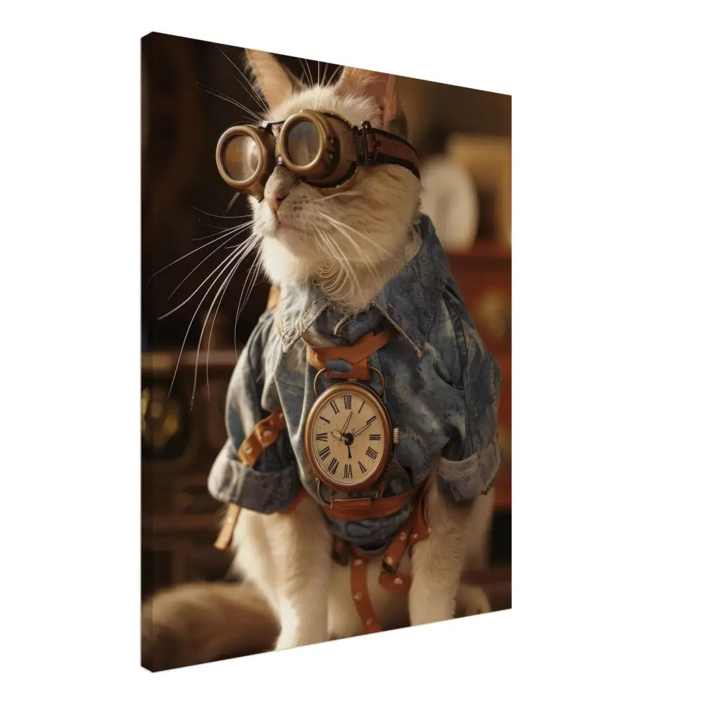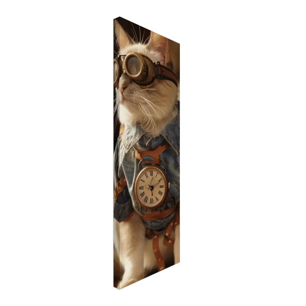 Dit schilderij toont een kat, gekleed in een prachtige vintage steampunk outfit. Hij draagt een stijlvolle, blauw-denim jas met lichte slijtagedetails en leren accenten. Om zijn nek hangt een antieke bronzen klok met een elegante romeinse wijzerplaat, wat zijn uitstraling van zowel elegantie als avontuur versterkt. Zijn kop wordt gesierd door een paar markante, retro-futuristische brillen met robuuste metalen details in een bronzen tint, die zijn nieuwsgierige, ontdekkingsreiziger-aard benadrukken. Extra accessoires zoals de leren riempjes en de contrasterende stiksels maken zijn outfit compleet. De achtergrond heeft een warme, rustieke tint, die de vintage sfeer van het geheel versterkt.