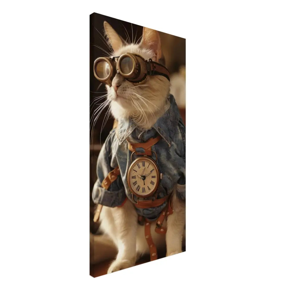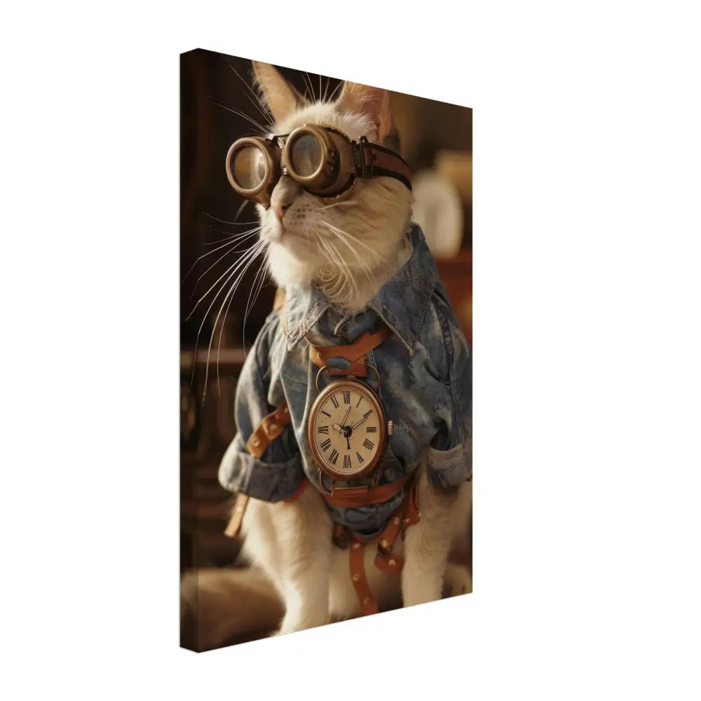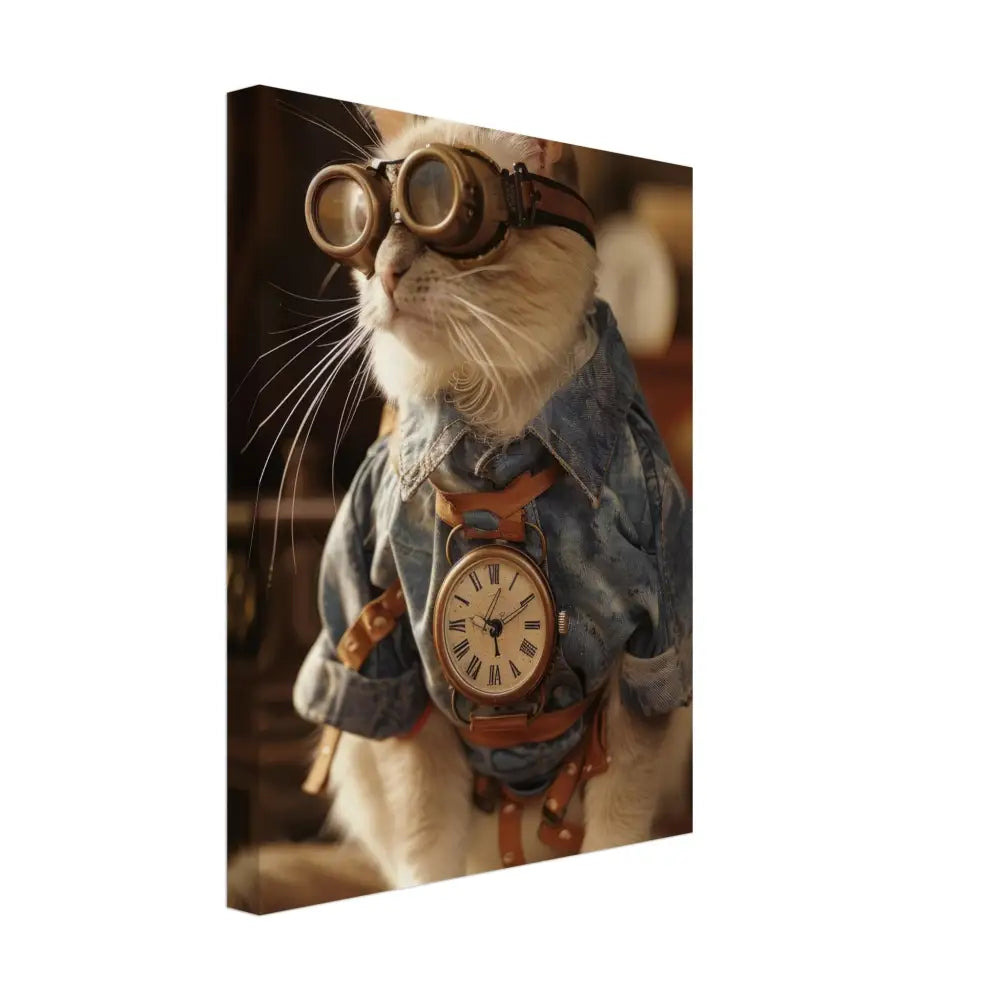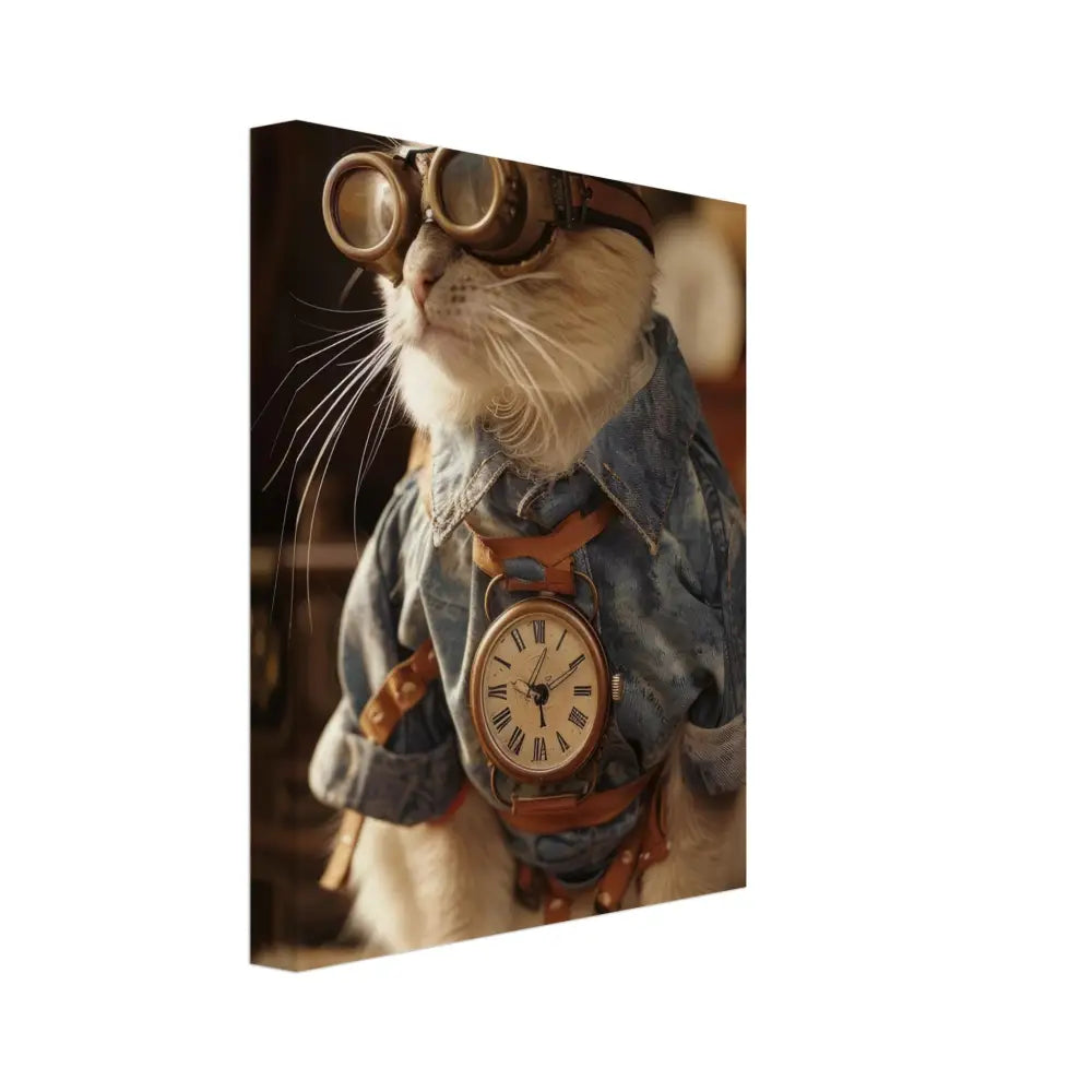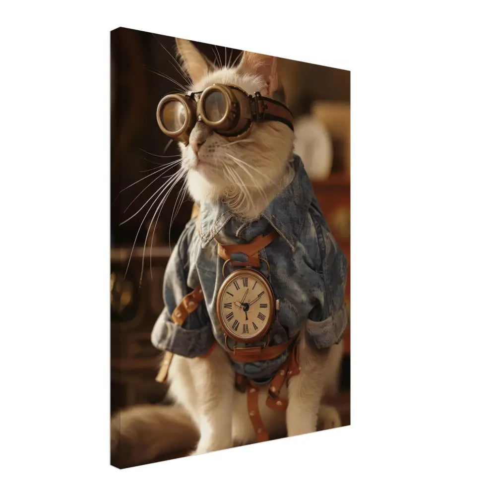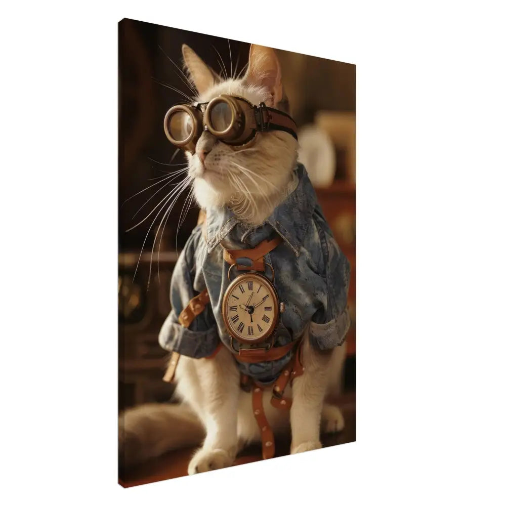 Dit schilderij toont een kat, gekleed in een prachtige vintage steampunk outfit. Hij draagt een stijlvolle, blauw-denim jas met lichte slijtagedetails en leren accenten. Om zijn nek hangt een antieke bronzen klok met een elegante romeinse wijzerplaat, wat zijn uitstraling van zowel elegantie als avontuur versterkt. Zijn kop wordt gesierd door een paar markante, retro-futuristische brillen met robuuste metalen details in een bronzen tint, die zijn nieuwsgierige, ontdekkingsreiziger-aard benadrukken. Extra accessoires zoals de leren riempjes en de contrasterende stiksels maken zijn outfit compleet. De achtergrond heeft een warme, rustieke tint, die de vintage sfeer van het geheel versterkt.