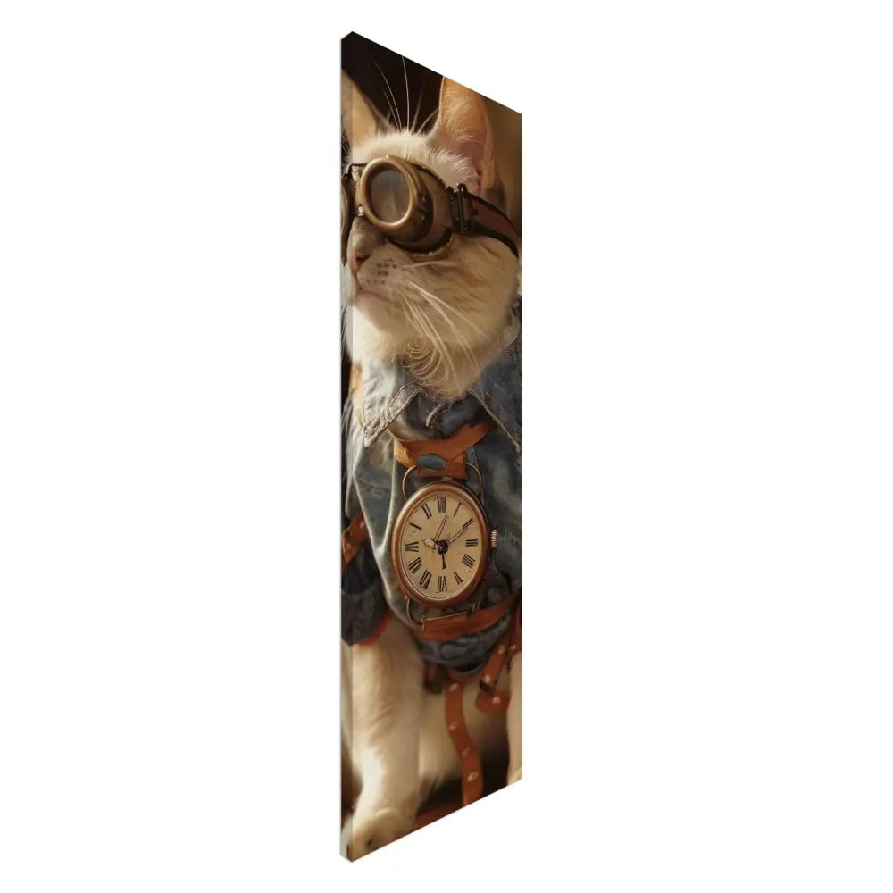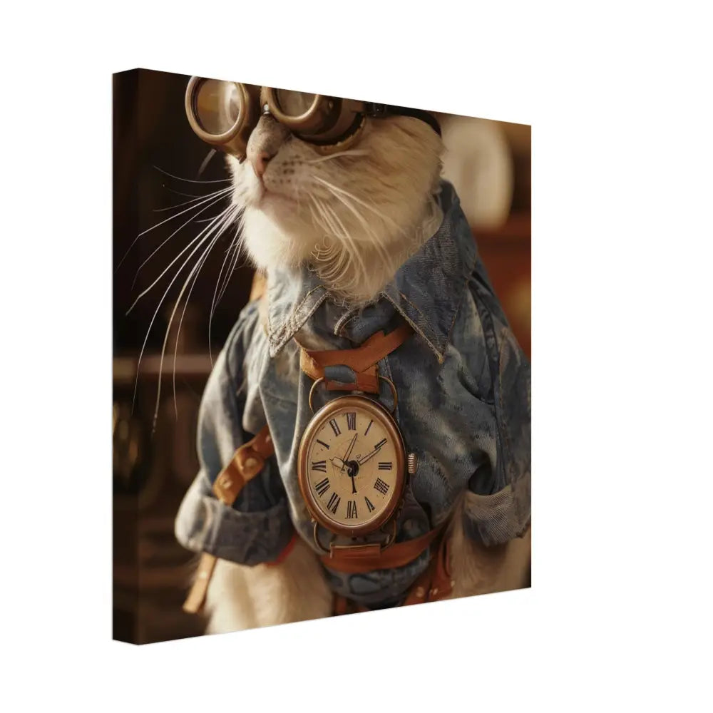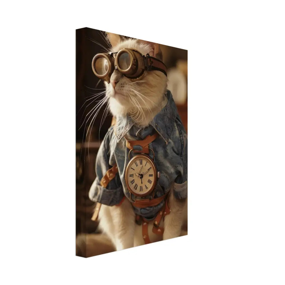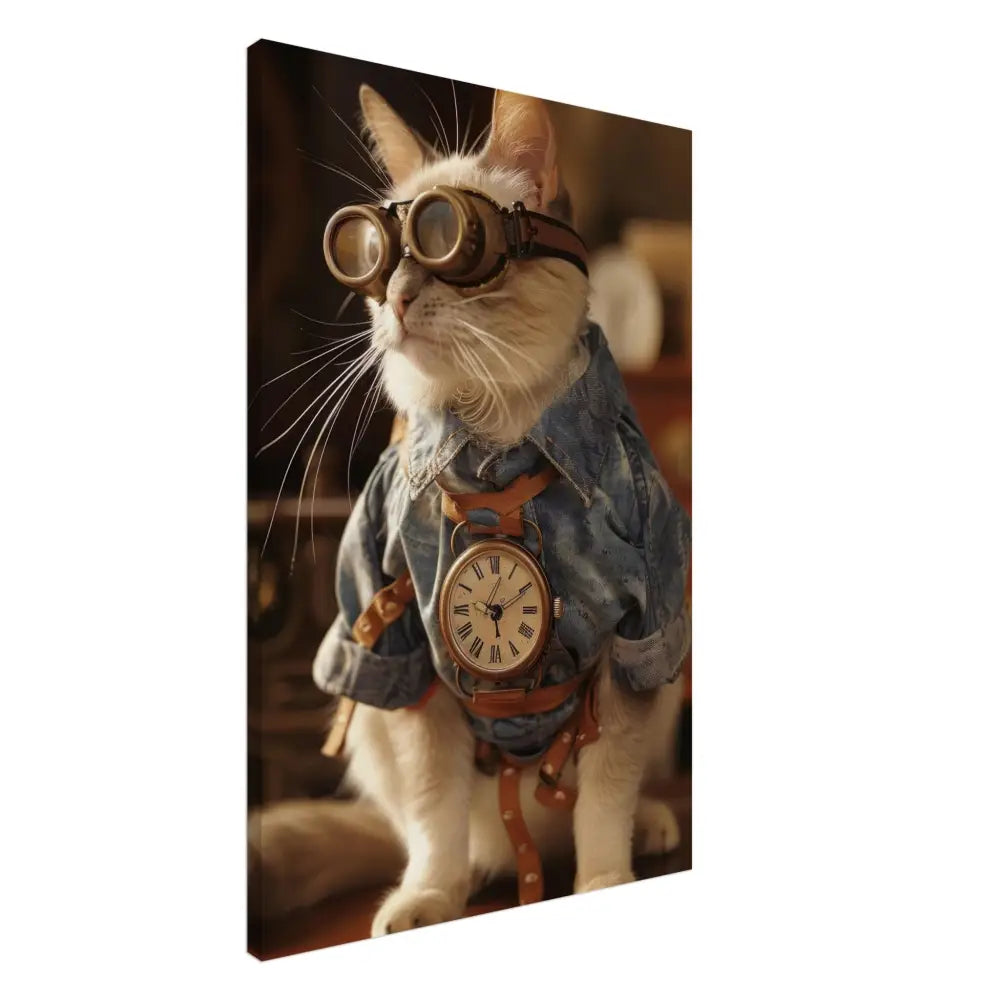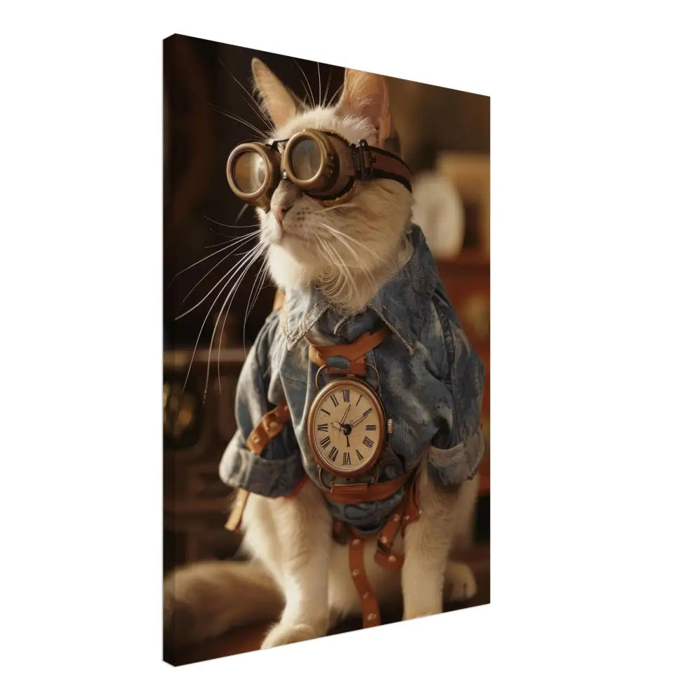 Dit schilderij toont een kat, gekleed in een prachtige vintage steampunk outfit. Hij draagt een stijlvolle, blauw-denim jas met lichte slijtagedetails en leren accenten. Om zijn nek hangt een antieke bronzen klok met een elegante romeinse wijzerplaat, wat zijn uitstraling van zowel elegantie als avontuur versterkt. Zijn kop wordt gesierd door een paar markante, retro-futuristische brillen met robuuste metalen details in een bronzen tint, die zijn nieuwsgierige, ontdekkingsreiziger-aard benadrukken. Extra accessoires zoals de leren riempjes en de contrasterende stiksels maken zijn outfit compleet. De achtergrond heeft een warme, rustieke tint, die de vintage sfeer van het geheel versterkt.