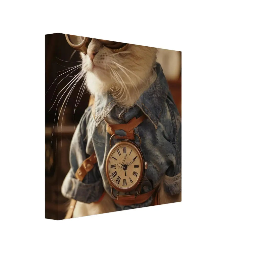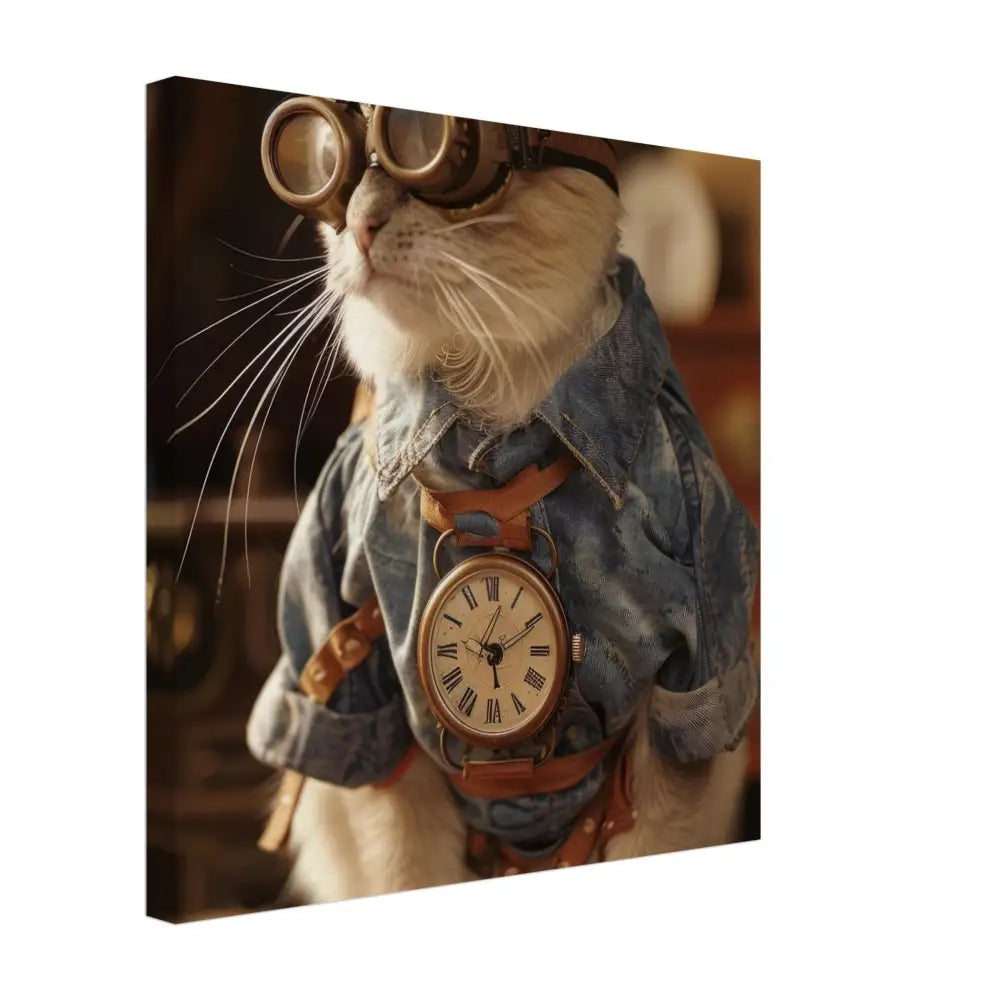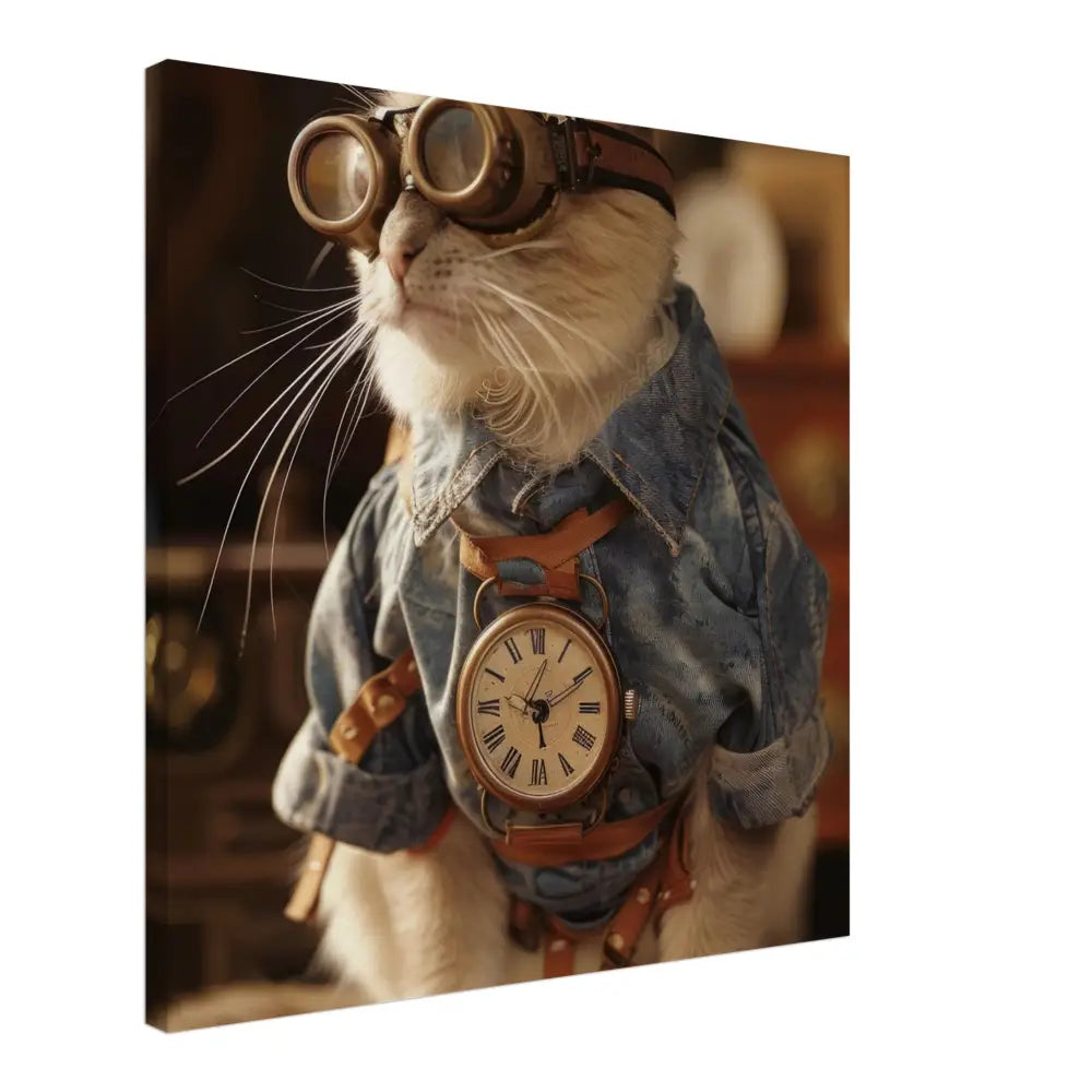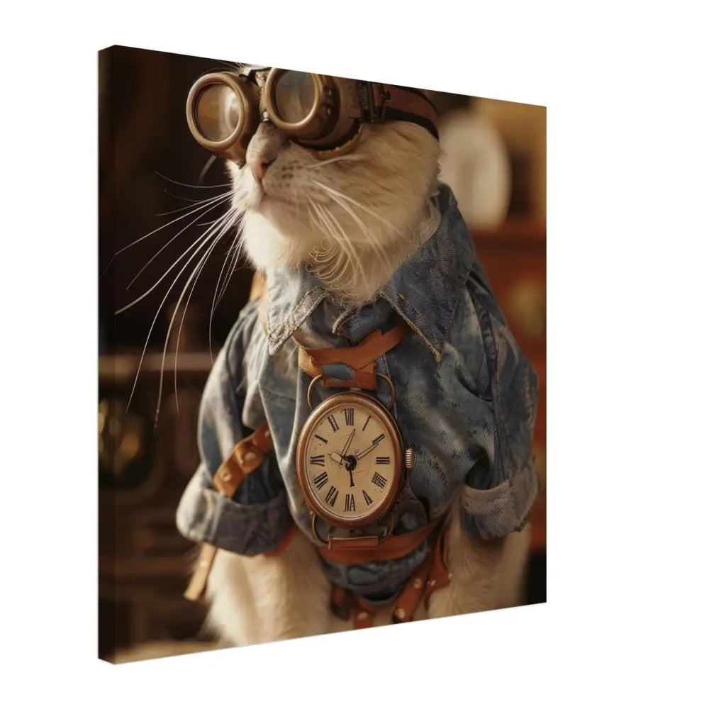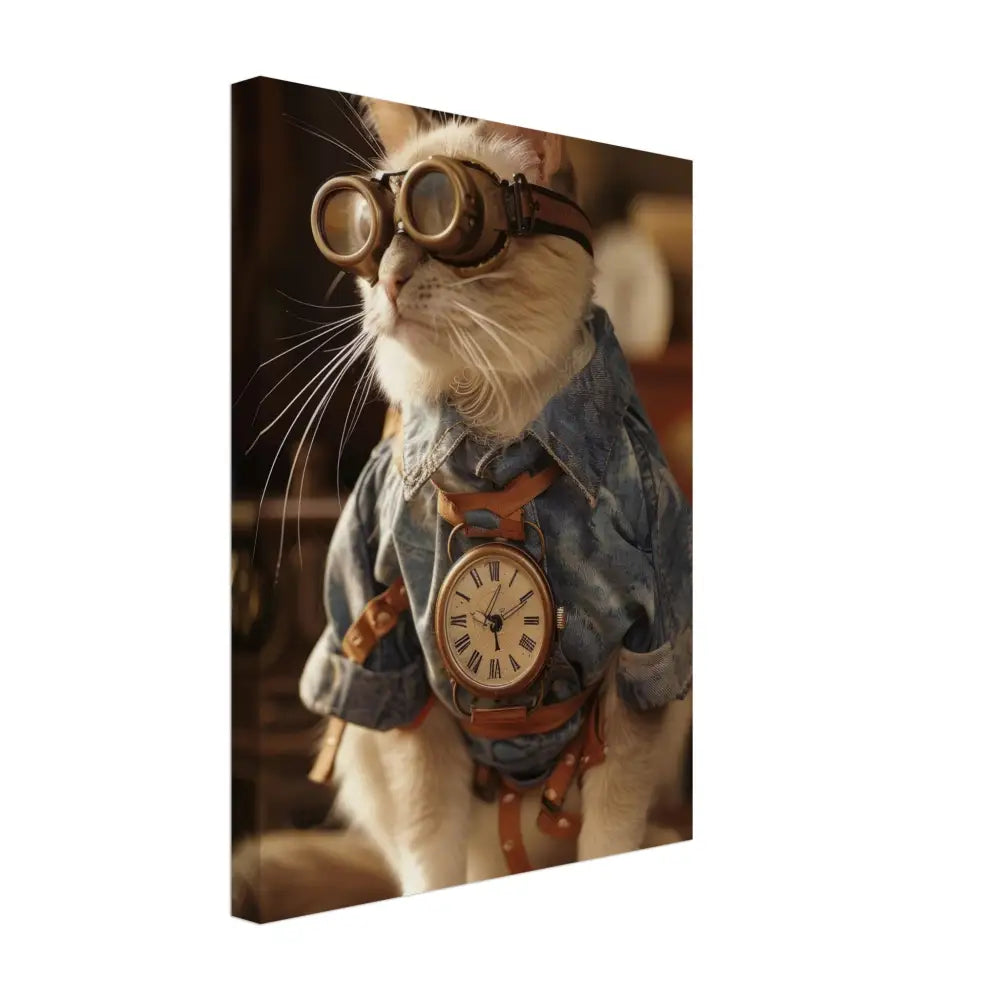 Dit schilderij toont een kat, gekleed in een prachtige vintage steampunk outfit. Hij draagt een stijlvolle, blauw-denim jas met lichte slijtagedetails en leren accenten. Om zijn nek hangt een antieke bronzen klok met een elegante romeinse wijzerplaat, wat zijn uitstraling van zowel elegantie als avontuur versterkt. Zijn kop wordt gesierd door een paar markante, retro-futuristische brillen met robuuste metalen details in een bronzen tint, die zijn nieuwsgierige, ontdekkingsreiziger-aard benadrukken. Extra accessoires zoals de leren riempjes en de contrasterende stiksels maken zijn outfit compleet. De achtergrond heeft een warme, rustieke tint, die de vintage sfeer van het geheel versterkt.