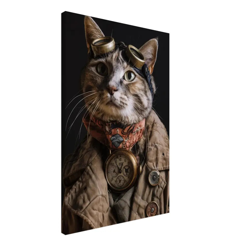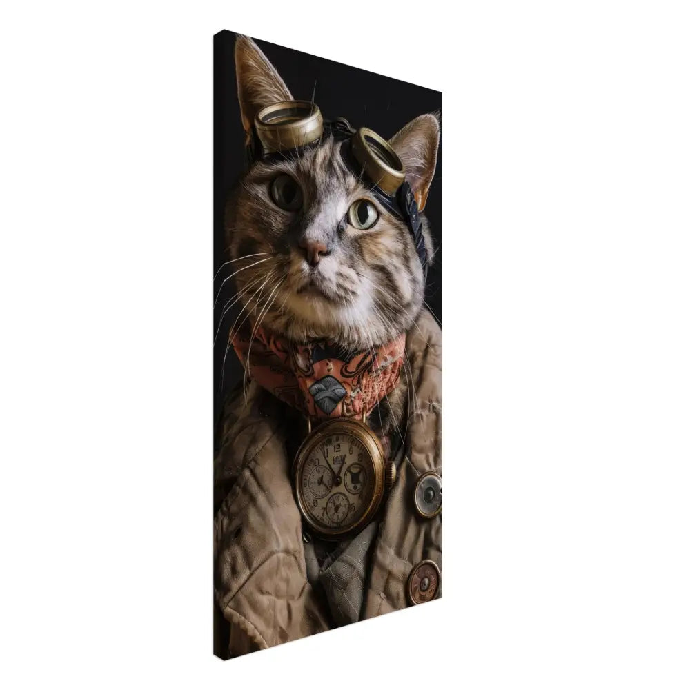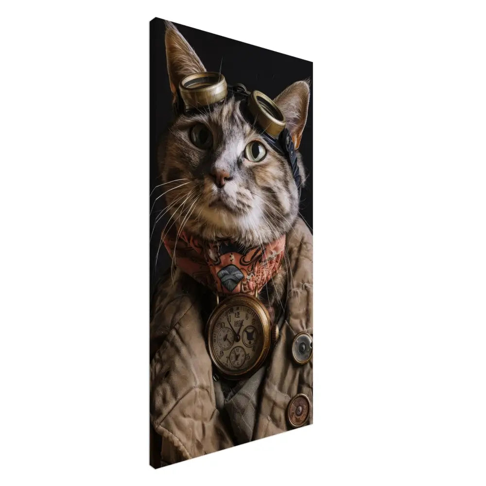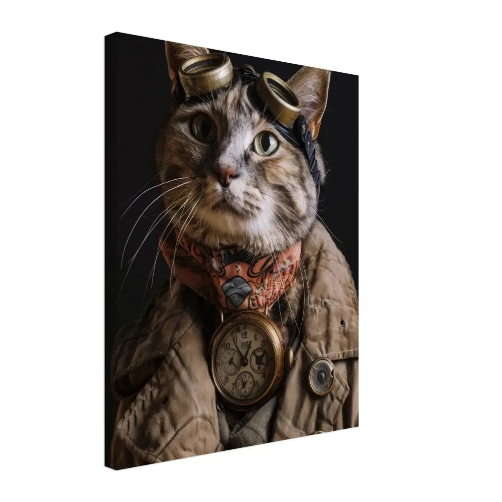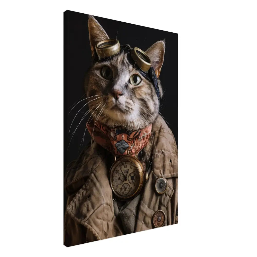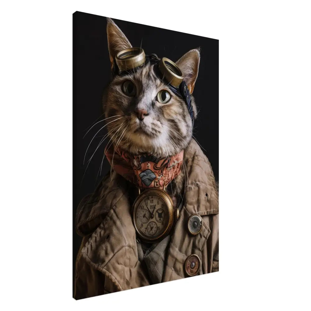 Dit schilderij toont een kat, gekleed in een prachtige vintage steampunk outfit. Hij draagt een stijlvolle, beige jas met subtiele patronen en rijke accenten. Om zijn nek hangt een antieke bronzen klok, die zijn gedistingeerde uitstraling versterkt. Zijn kop wordt gesierd door een paar opvallende retro-futuristische brillen met metalen details in goudkleur, wat hem de uitstraling van een avontuurlijke tijdreiziger geeft. Zijn pootjes zijn voorzien van elegante, leerachtige manchetjes die het geheel afmaken. De achtergrond is donker, waardoor de details van de kleding en accessoires van de kat nog meer opvallen.