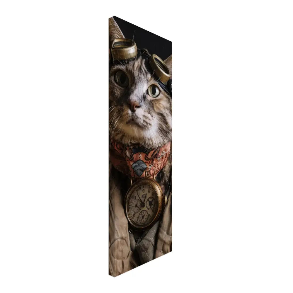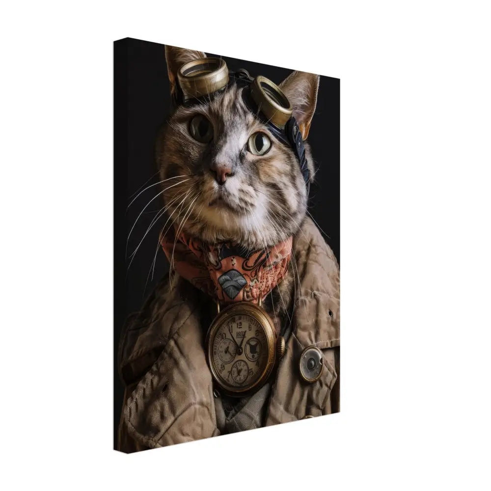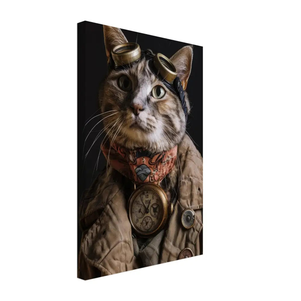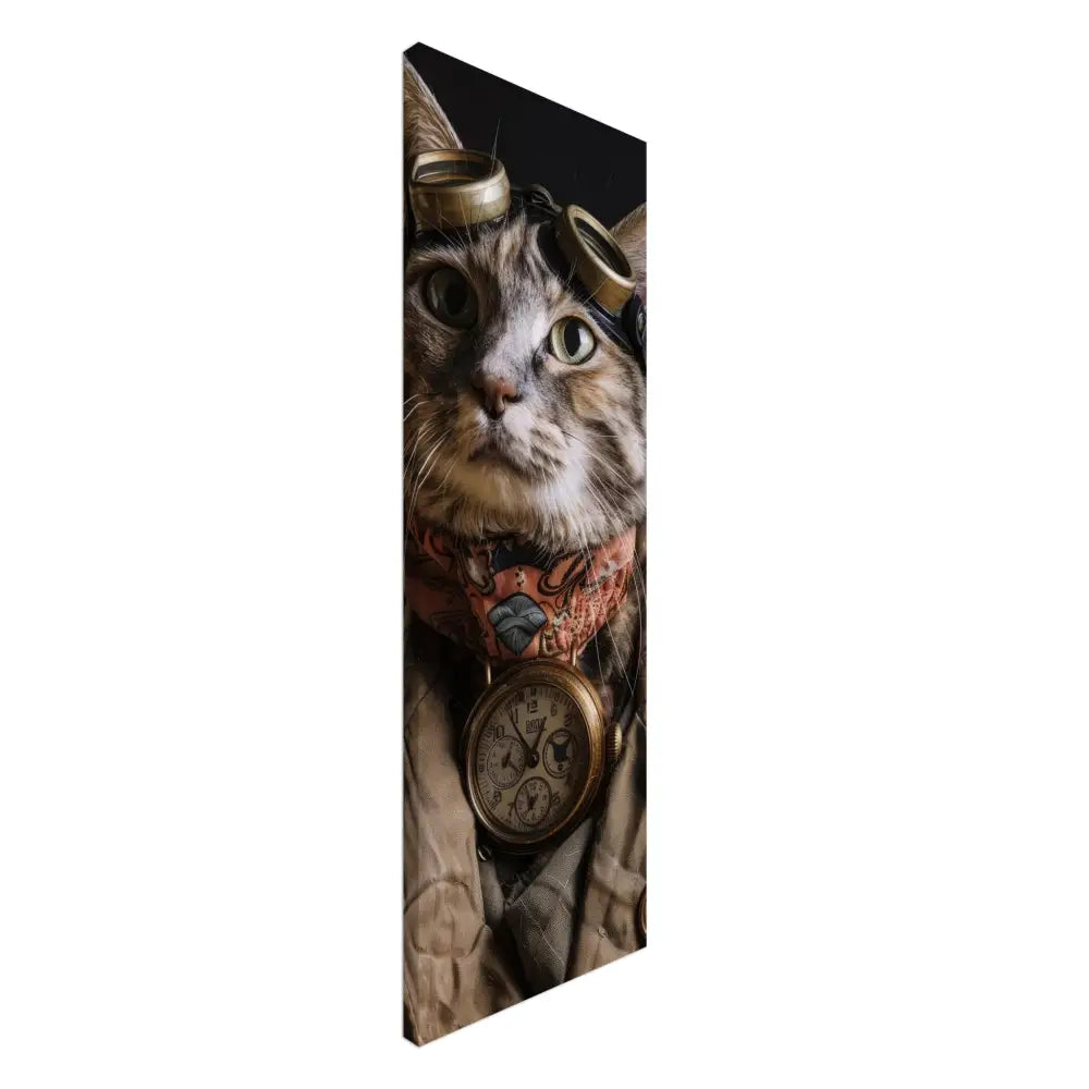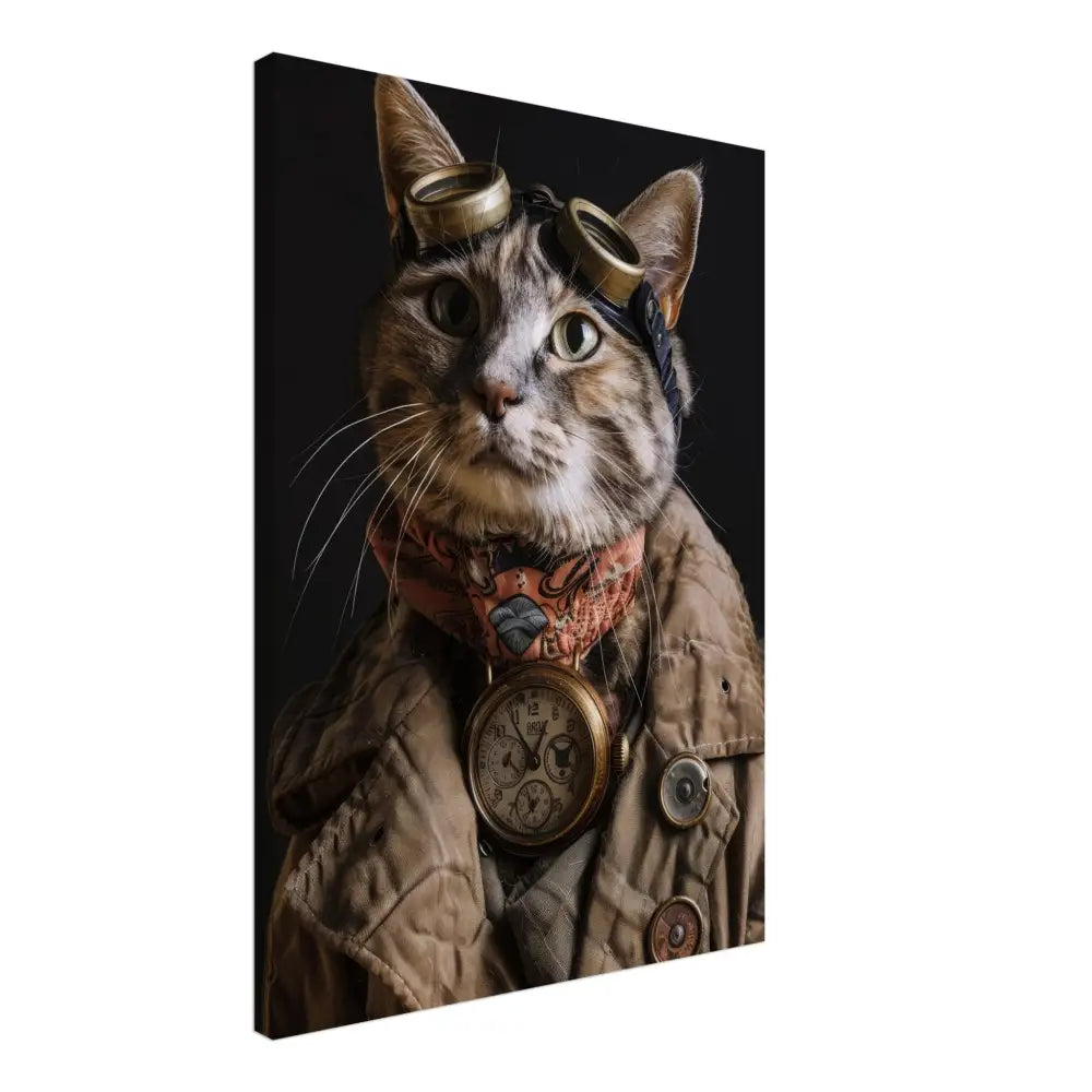 Dit schilderij toont een kat, gekleed in een prachtige vintage steampunk outfit. Hij draagt een stijlvolle, beige jas met subtiele patronen en rijke accenten. Om zijn nek hangt een antieke bronzen klok, die zijn gedistingeerde uitstraling versterkt. Zijn kop wordt gesierd door een paar opvallende retro-futuristische brillen met metalen details in goudkleur, wat hem de uitstraling van een avontuurlijke tijdreiziger geeft. Zijn pootjes zijn voorzien van elegante, leerachtige manchetjes die het geheel afmaken. De achtergrond is donker, waardoor de details van de kleding en accessoires van de kat nog meer opvallen.
