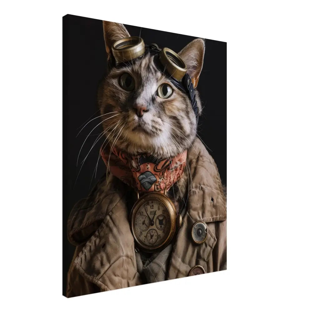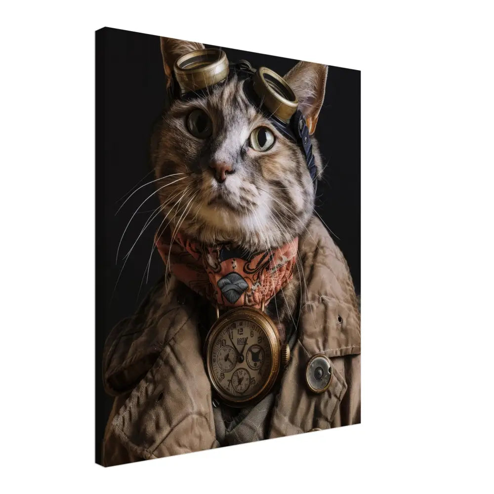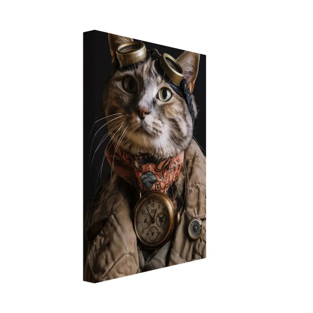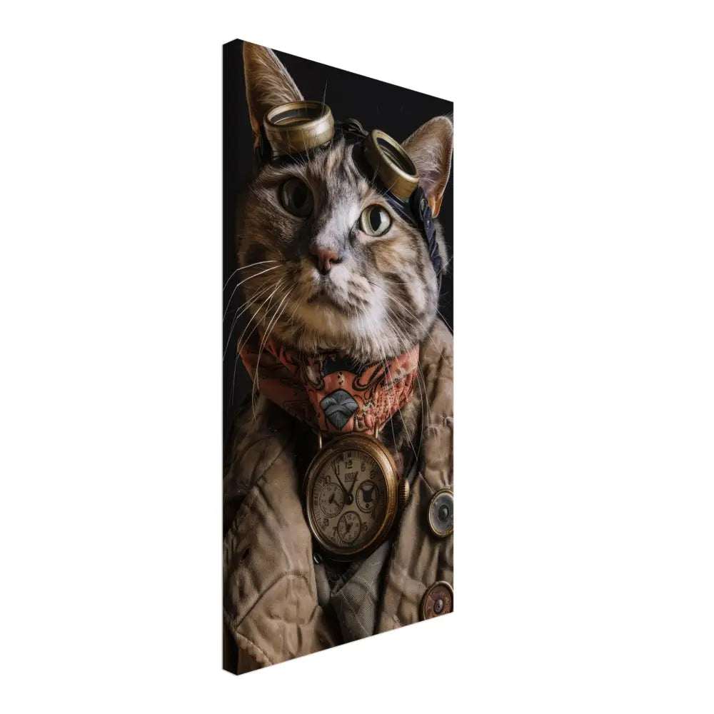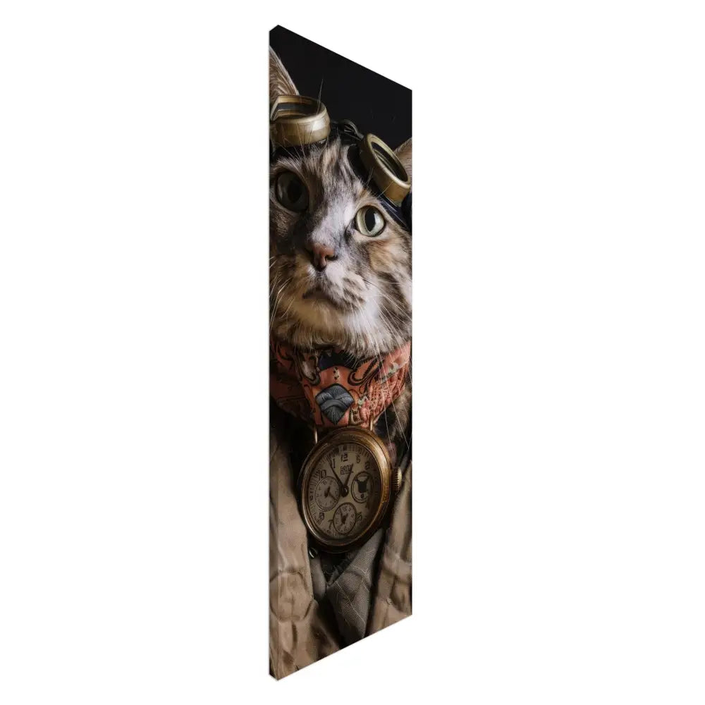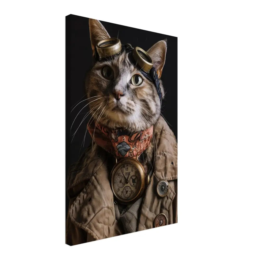 Dit schilderij toont een kat, gekleed in een prachtige vintage steampunk outfit. Hij draagt een stijlvolle, beige jas met subtiele patronen en rijke accenten. Om zijn nek hangt een antieke bronzen klok, die zijn gedistingeerde uitstraling versterkt. Zijn kop wordt gesierd door een paar opvallende retro-futuristische brillen met metalen details in goudkleur, wat hem de uitstraling van een avontuurlijke tijdreiziger geeft. Zijn pootjes zijn voorzien van elegante, leerachtige manchetjes die het geheel afmaken. De achtergrond is donker, waardoor de details van de kleding en accessoires van de kat nog meer opvallen.