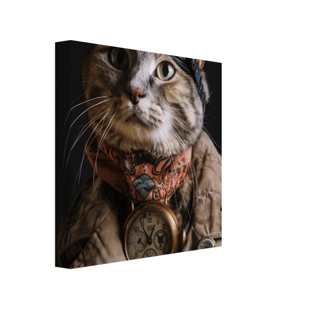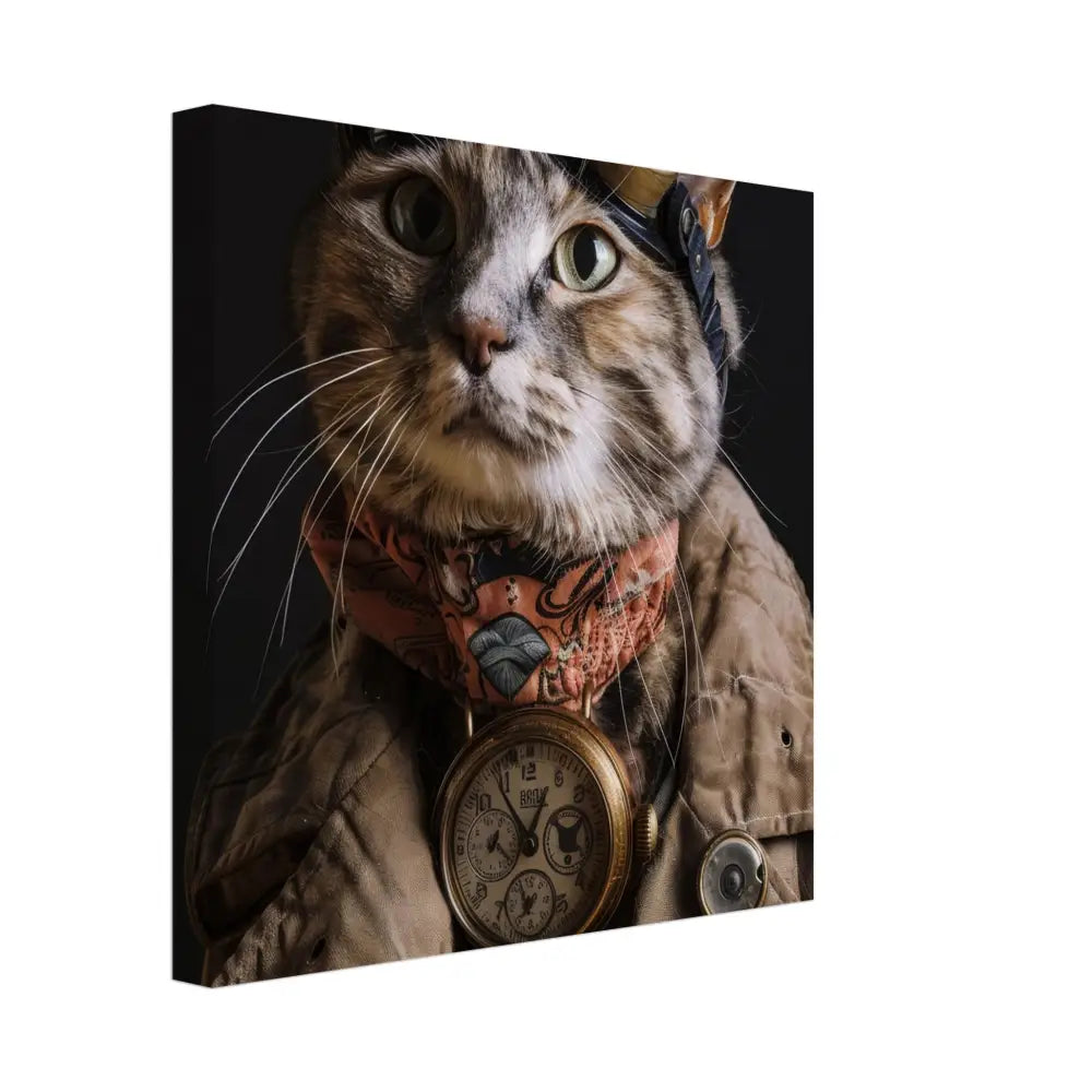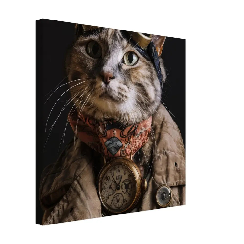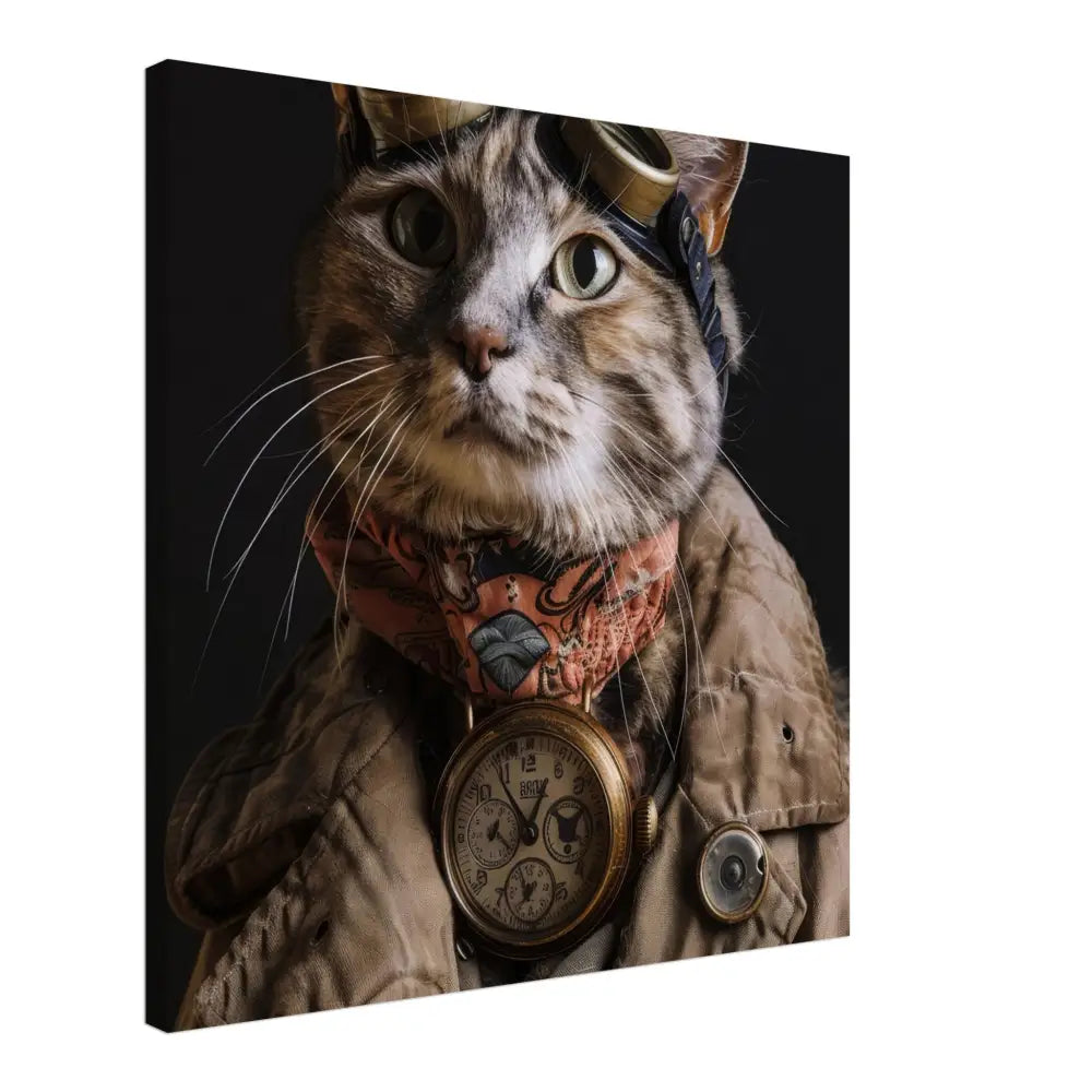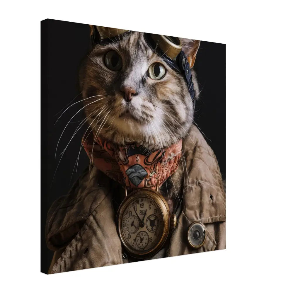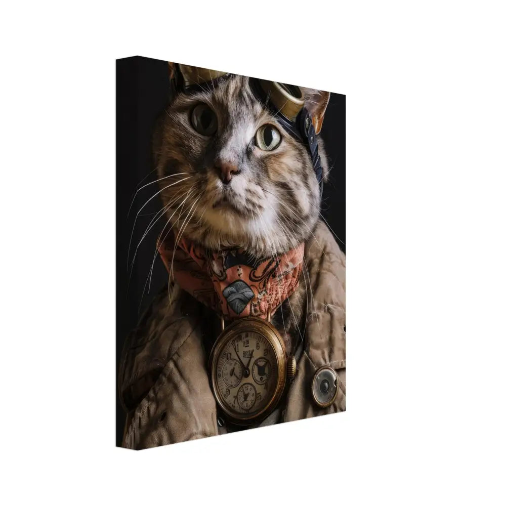 Dit schilderij toont een kat, gekleed in een prachtige vintage steampunk outfit. Hij draagt een stijlvolle, beige jas met subtiele patronen en rijke accenten. Om zijn nek hangt een antieke bronzen klok, die zijn gedistingeerde uitstraling versterkt. Zijn kop wordt gesierd door een paar opvallende retro-futuristische brillen met metalen details in goudkleur, wat hem de uitstraling van een avontuurlijke tijdreiziger geeft. Zijn pootjes zijn voorzien van elegante, leerachtige manchetjes die het geheel afmaken. De achtergrond is donker, waardoor de details van de kleding en accessoires van de kat nog meer opvallen.