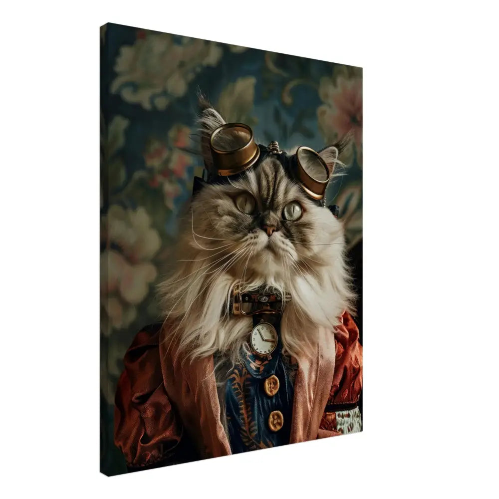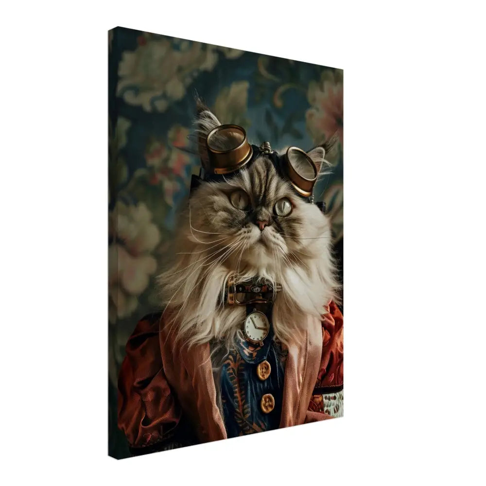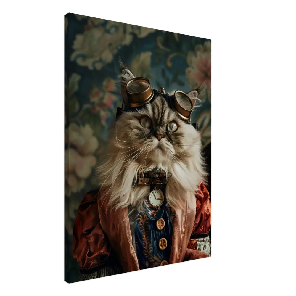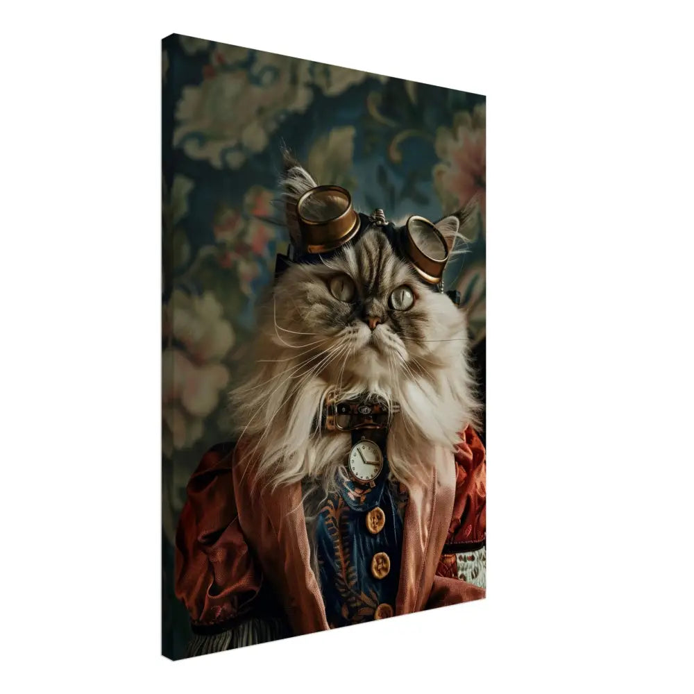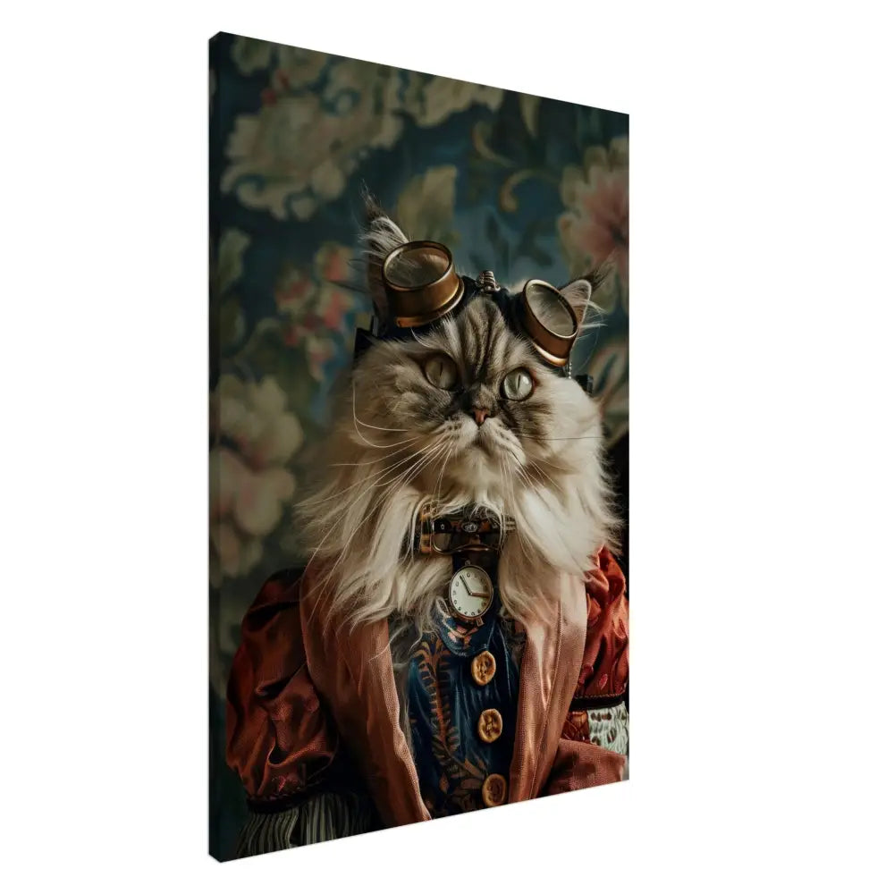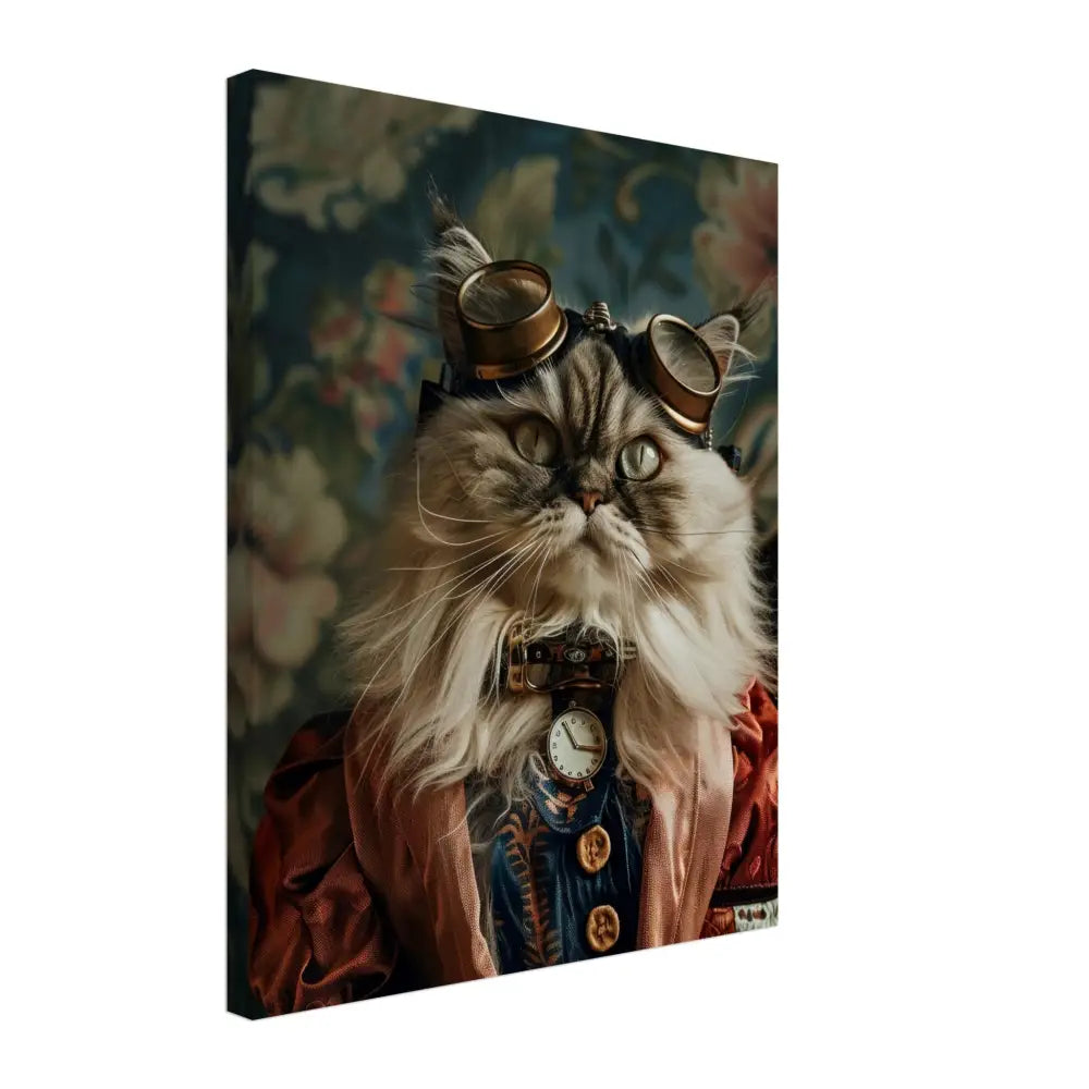 Dit schilderij toont een imposante kat, gekleed in een prachtige vintage steampunk outfit. Hij draagt een sierlijke, koperkleurige jas met ingewikkelde patronen en fluwelen accenten. Om zijn nek hangt een antieke zilverkleurige klok, die zijn aristocratische uitstraling versterkt. Zijn kop wordt gesierd door een paar grote, retro-futuristische brillen met metalen details in bronskleur, waardoor hij eruitziet als een avontuurlijke tijdreiziger. Zijn pootjes zijn voorzien van elegante, grijze bontachtige manchetjes die het geheel afmaken. De afbeelding van deze kat is romantisch door het mooie bloemenbehang op de achtergrond.