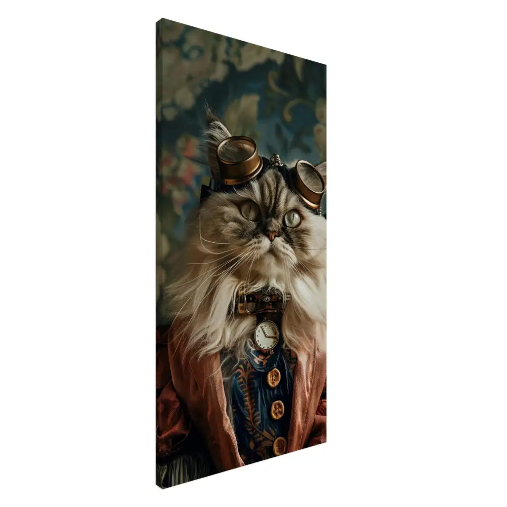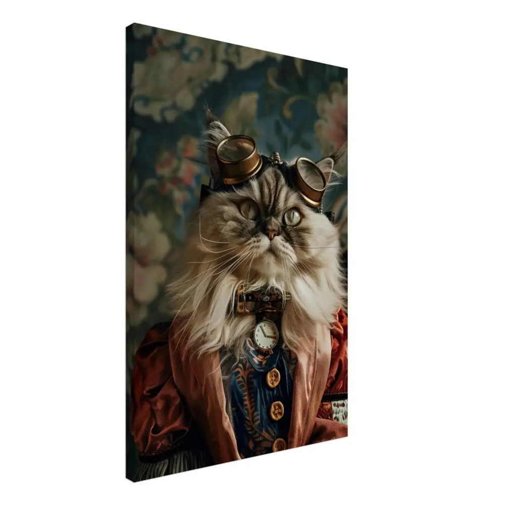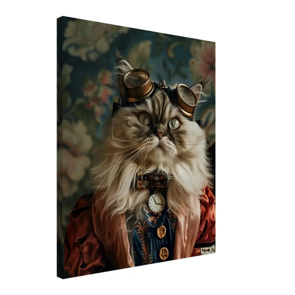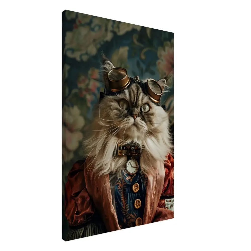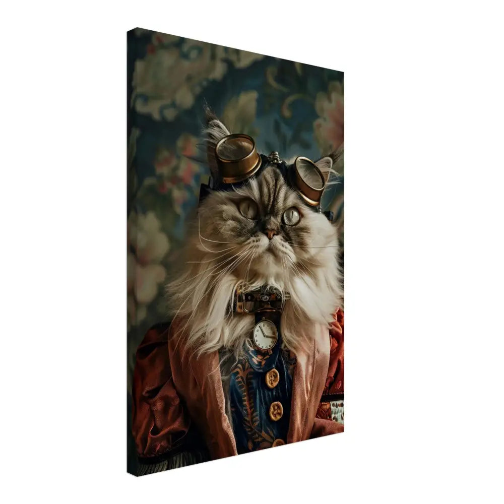 Dit schilderij toont een imposante kat, gekleed in een prachtige vintage steampunk outfit. Hij draagt een sierlijke, koperkleurige jas met ingewikkelde patronen en fluwelen accenten. Om zijn nek hangt een antieke zilverkleurige klok, die zijn aristocratische uitstraling versterkt. Zijn kop wordt gesierd door een paar grote, retro-futuristische brillen met metalen details in bronskleur, waardoor hij eruitziet als een avontuurlijke tijdreiziger. Zijn pootjes zijn voorzien van elegante, grijze bontachtige manchetjes die het geheel afmaken. De afbeelding van deze kat is romantisch door het mooie bloemenbehang op de achtergrond.