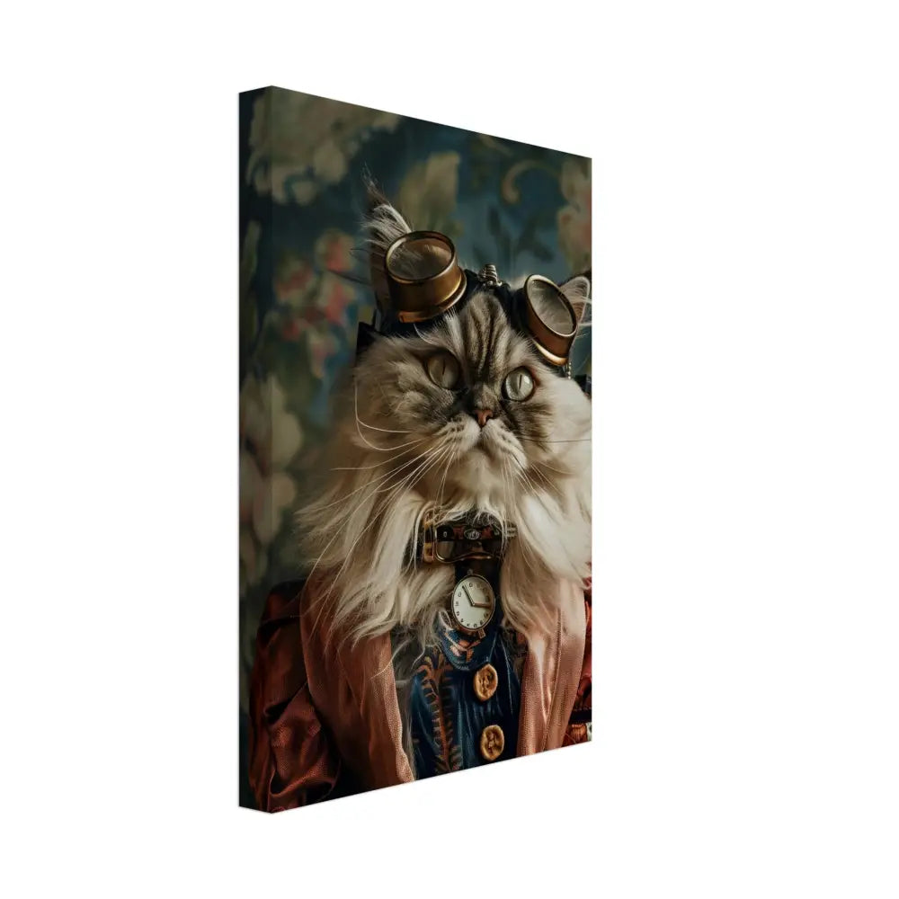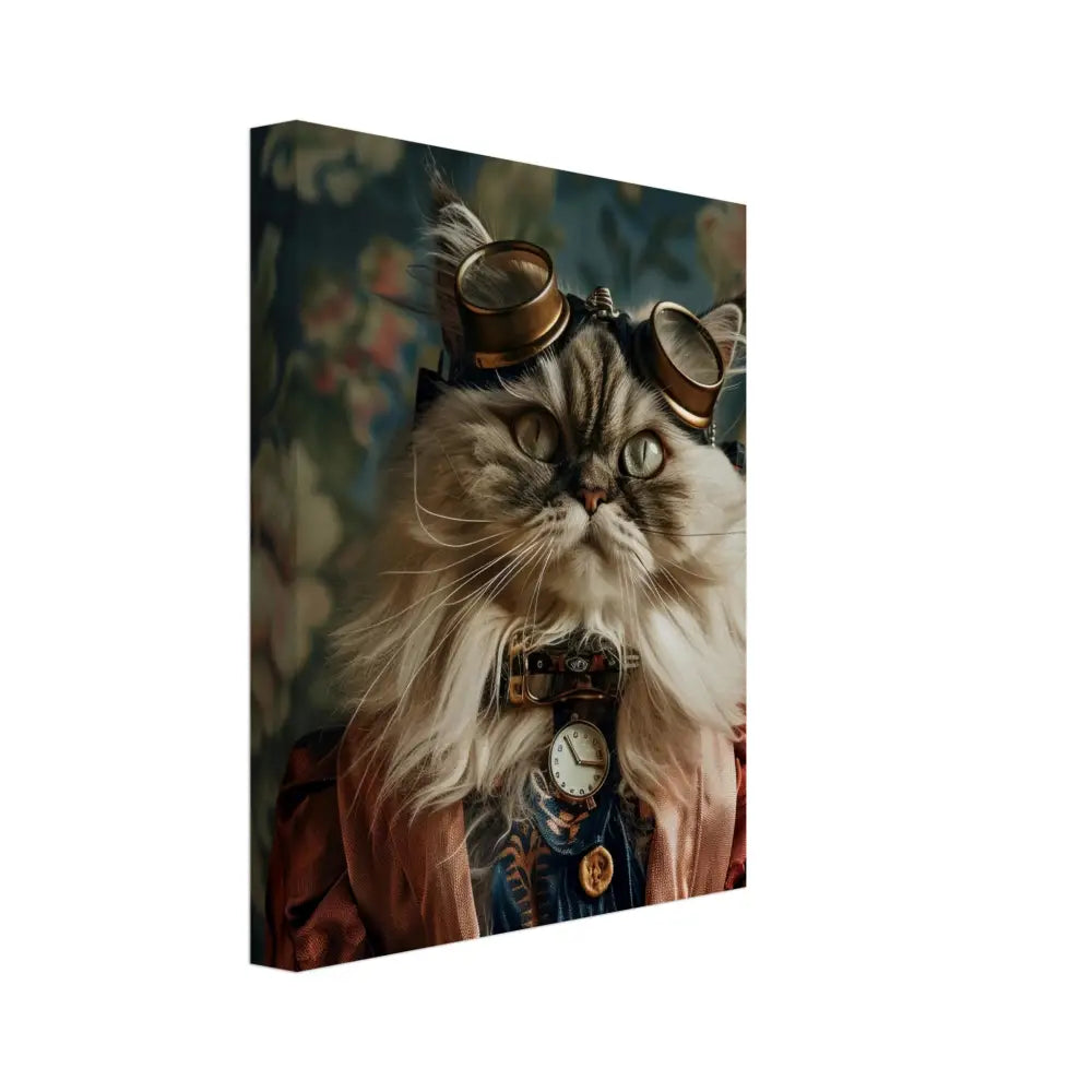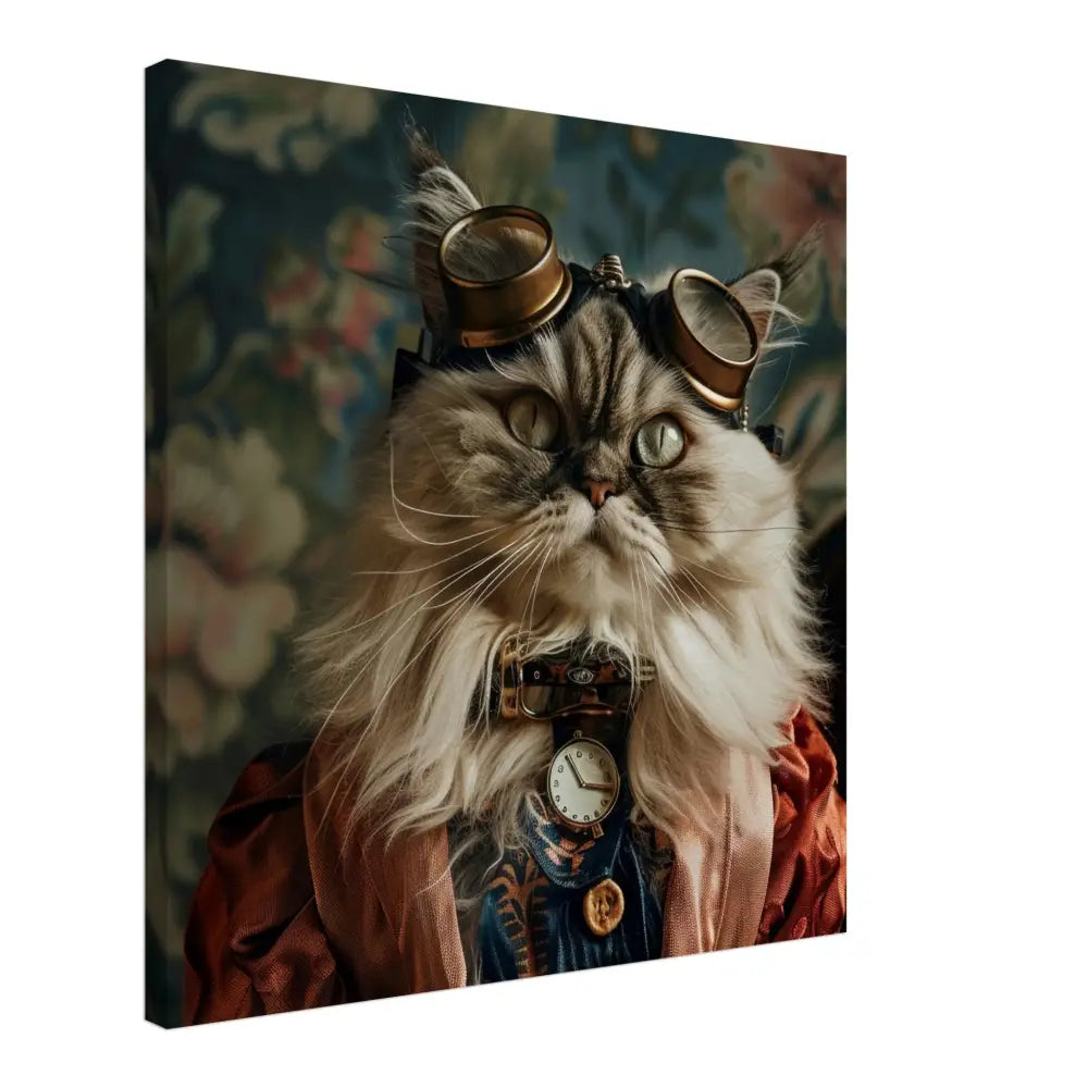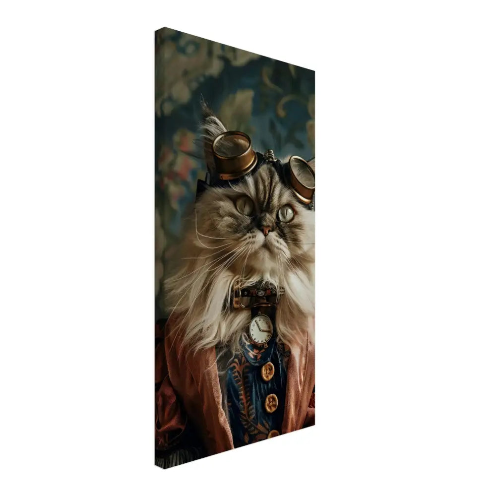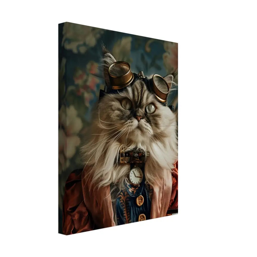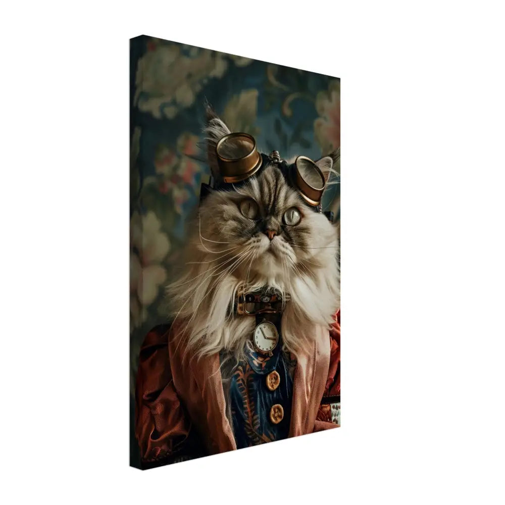 Dit schilderij toont een imposante kat, gekleed in een prachtige vintage steampunk outfit. Hij draagt een sierlijke, koperkleurige jas met ingewikkelde patronen en fluwelen accenten. Om zijn nek hangt een antieke zilverkleurige klok, die zijn aristocratische uitstraling versterkt. Zijn kop wordt gesierd door een paar grote, retro-futuristische brillen met metalen details in bronskleur, waardoor hij eruitziet als een avontuurlijke tijdreiziger. Zijn pootjes zijn voorzien van elegante, grijze bontachtige manchetjes die het geheel afmaken. De afbeelding van deze kat is romantisch door het mooie bloemenbehang op de achtergrond.