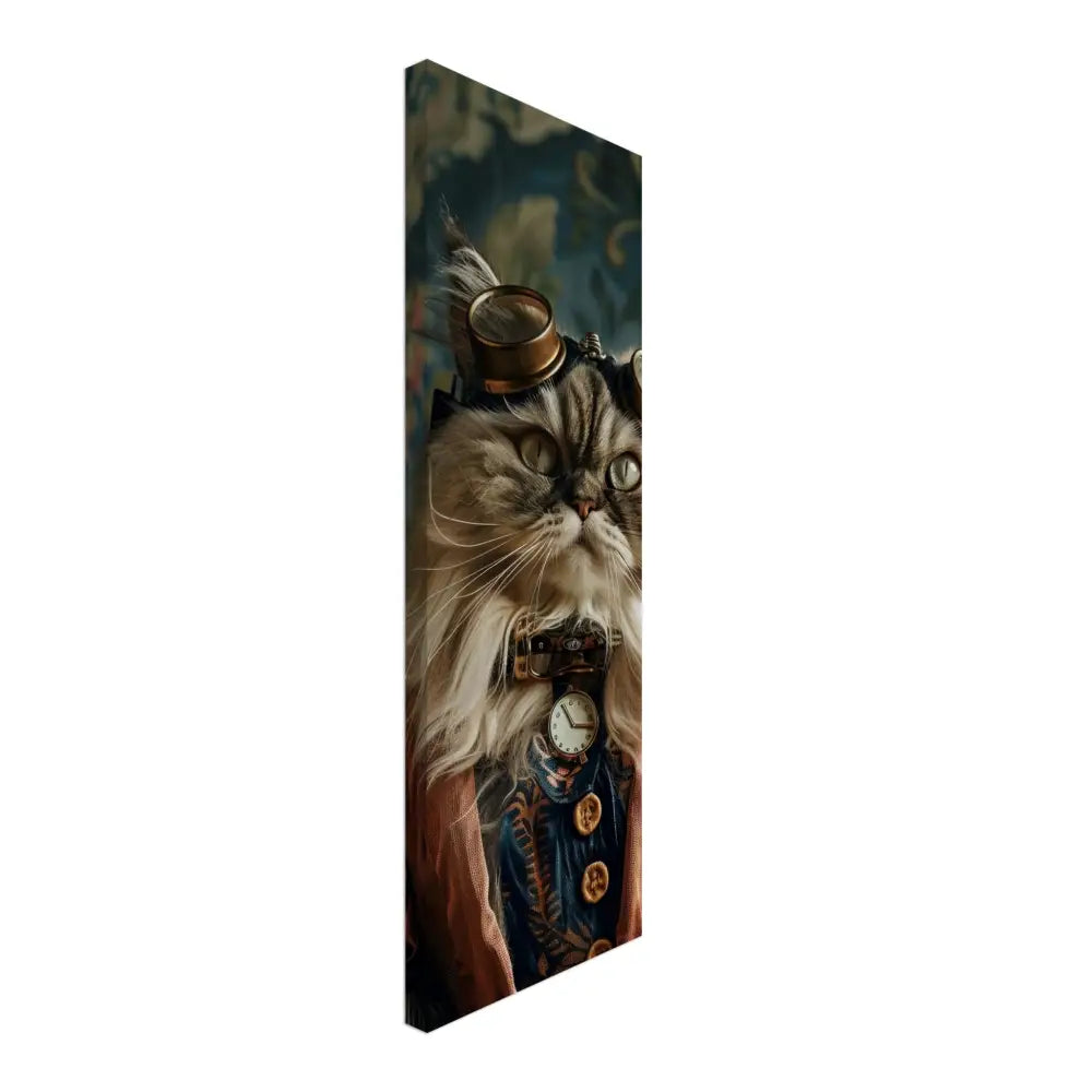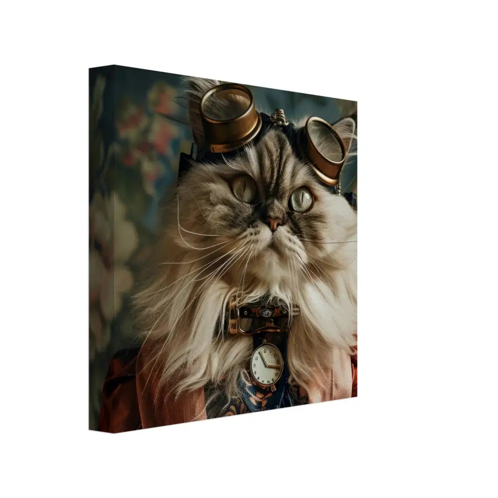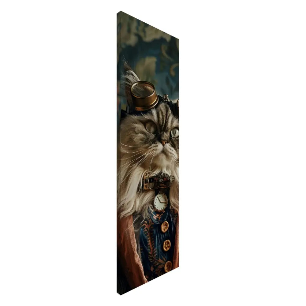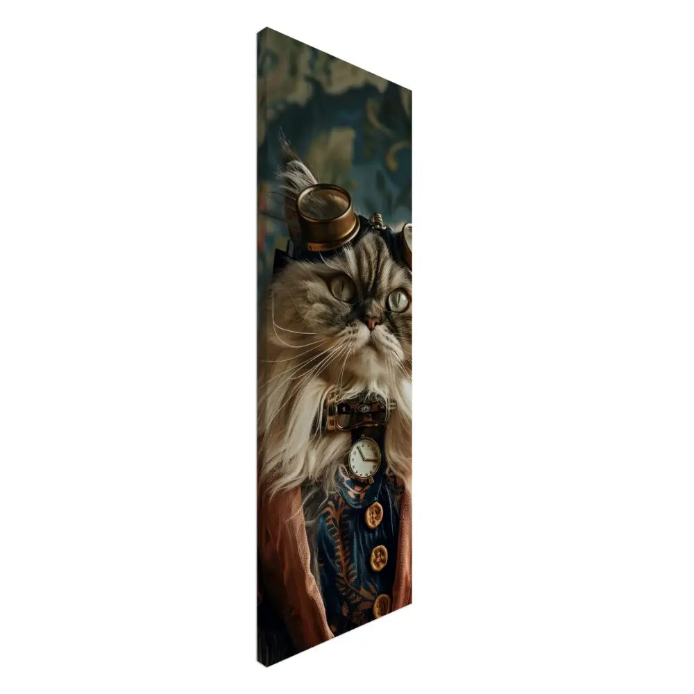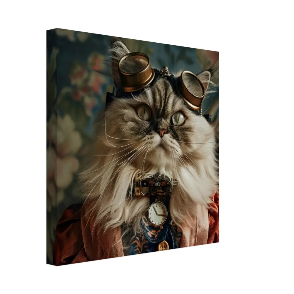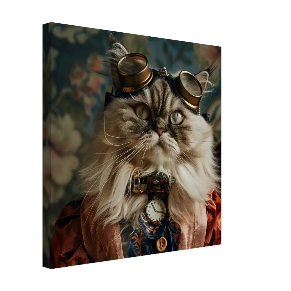 Dit schilderij toont een imposante kat, gekleed in een prachtige vintage steampunk outfit. Hij draagt een sierlijke, koperkleurige jas met ingewikkelde patronen en fluwelen accenten. Om zijn nek hangt een antieke zilverkleurige klok, die zijn aristocratische uitstraling versterkt. Zijn kop wordt gesierd door een paar grote, retro-futuristische brillen met metalen details in bronskleur, waardoor hij eruitziet als een avontuurlijke tijdreiziger. Zijn pootjes zijn voorzien van elegante, grijze bontachtige manchetjes die het geheel afmaken. De afbeelding van deze kat is romantisch door het mooie bloemenbehang op de achtergrond.
