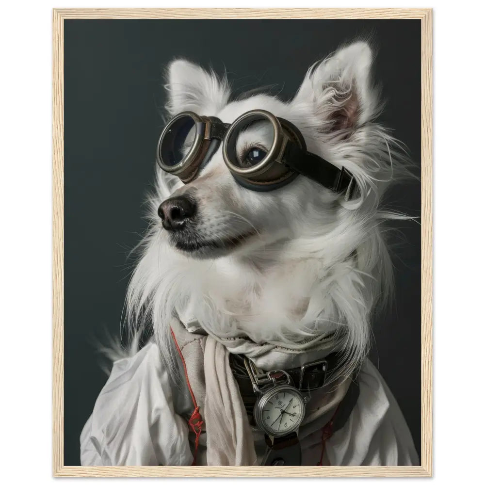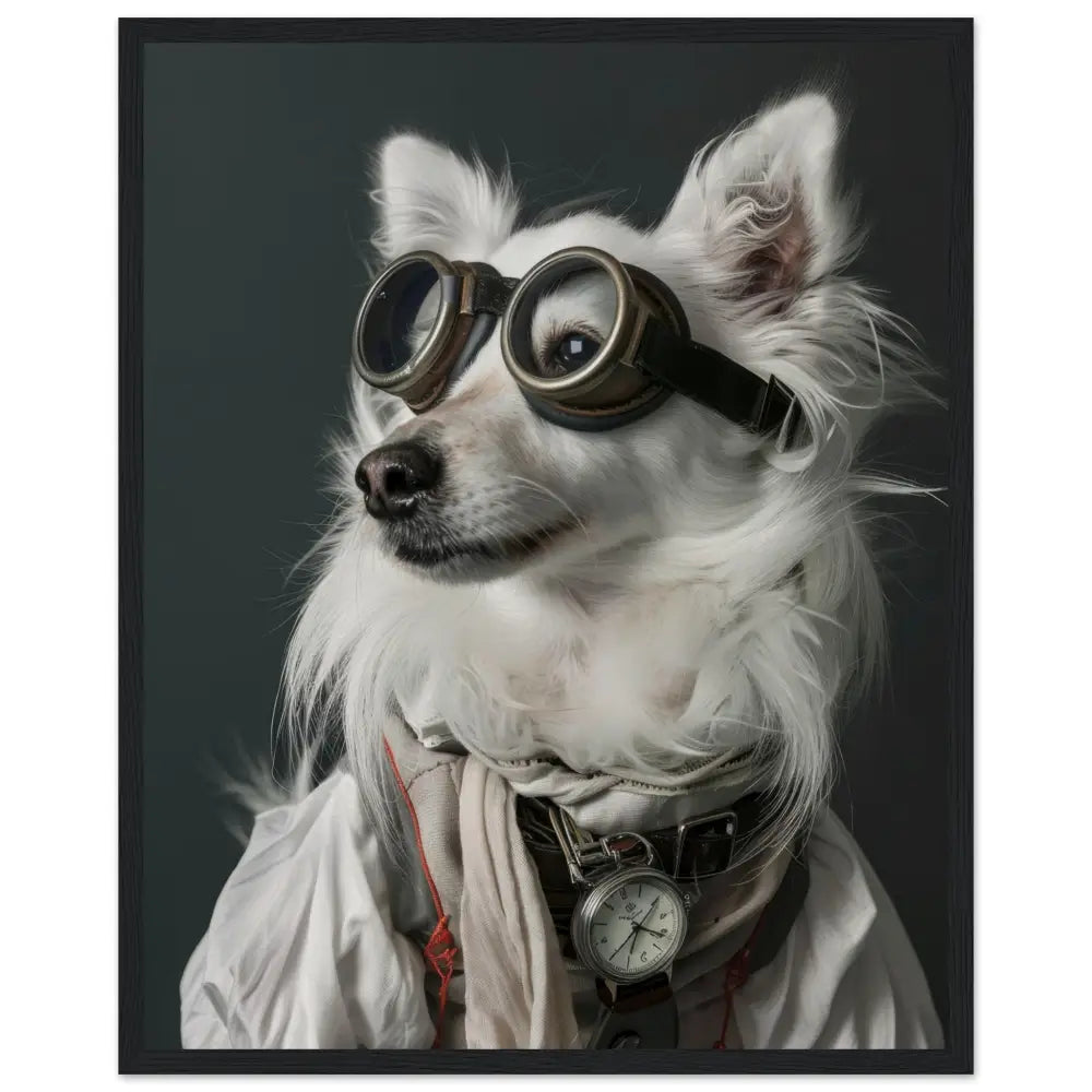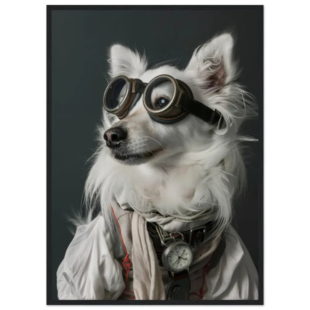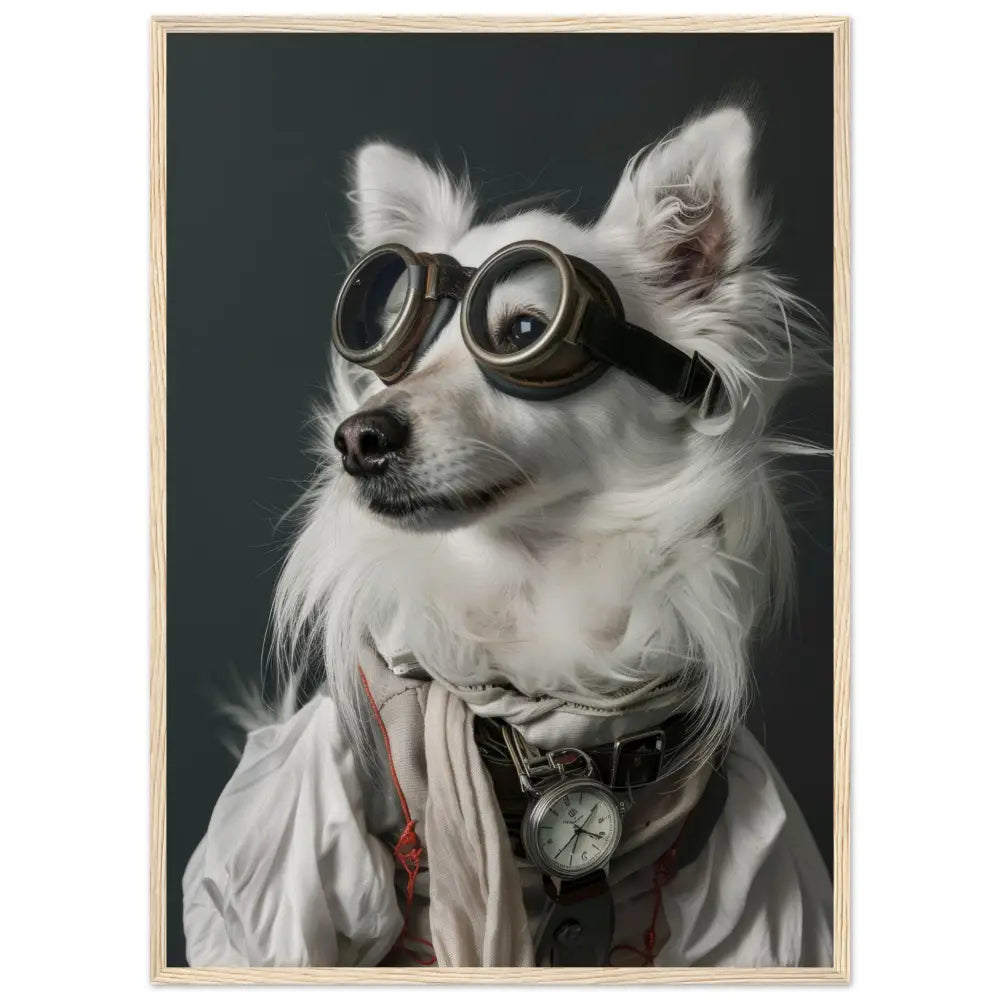 Deze afbeelding toont een dier, gekleed in een prachtige vintage steampunk outfit. Het draagt een elegante, witte jas met subtiele patronen en contrasterende stiksels in rood. Om zijn nek hangt een antieke zilverkleurige klok, die een stijlvolle flair toevoegt. De kop wordt gesierd door een retro-futuristische bril met metalen details in brons en zwart, waardoor het een avontuurlijke en mysterieuze uitstraling krijgt. De zachte, grijze sjaal en leren riem met accessoires passen perfect bij de look. De achtergrond is eenvoudig en donker, waardoor het dier en zijn gedetailleerde outfit extra opvallen.