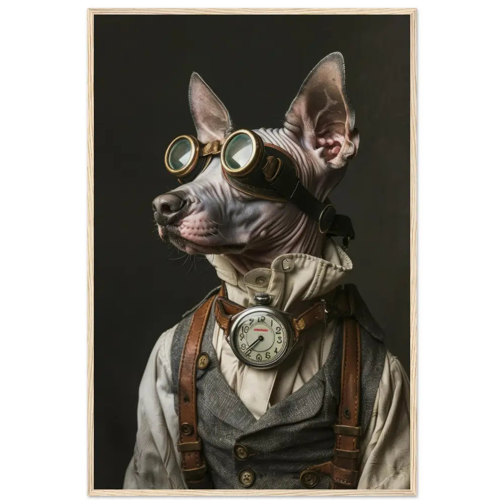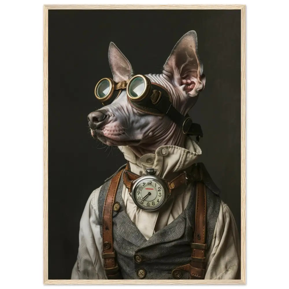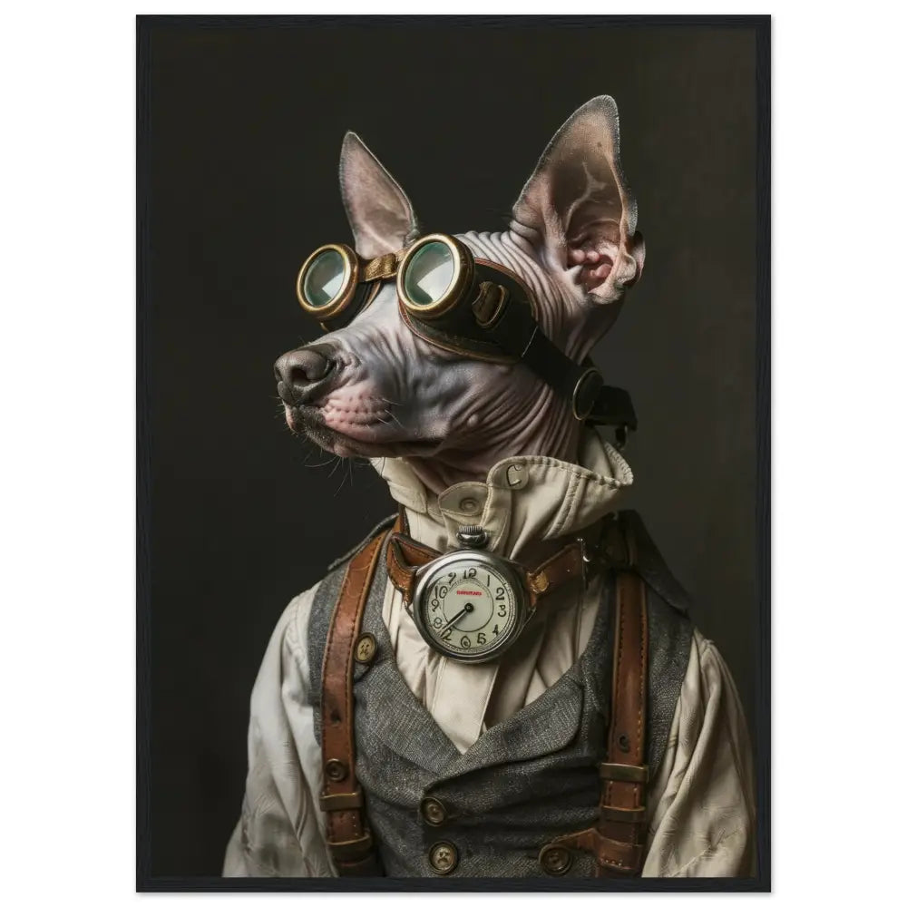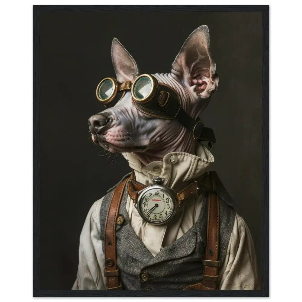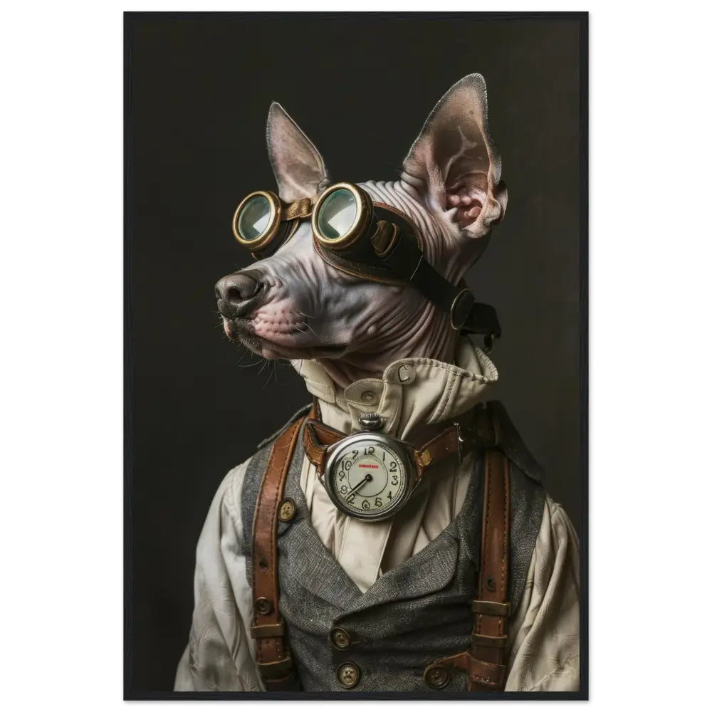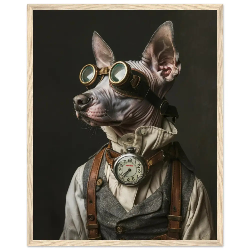 Deze afbeelding toont een hond, gekleed in een prachtige vintage steampunk outfit. Het draagt een stijlvolle, grijze jas met subtiele patronen en leren accenten. Om de nek hangt een antieke zilveren klok, die de tijdloze elegantie benadrukt. Op het hoofd prijkt een paar grote, retro-futuristische brillen met bronzen metalen details, waardoor deze hond eruitziet als een avontuurlijke tijdreiziger. De pootjes zijn voorzien van fijne leren manchetjes en contrasterende stiksels die het geheel verfijnen. De achtergrond is donker en ingetogen, wat de focus volledig op het majestueuze portret van de hond legt.