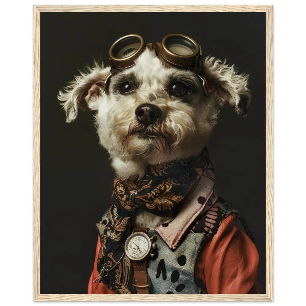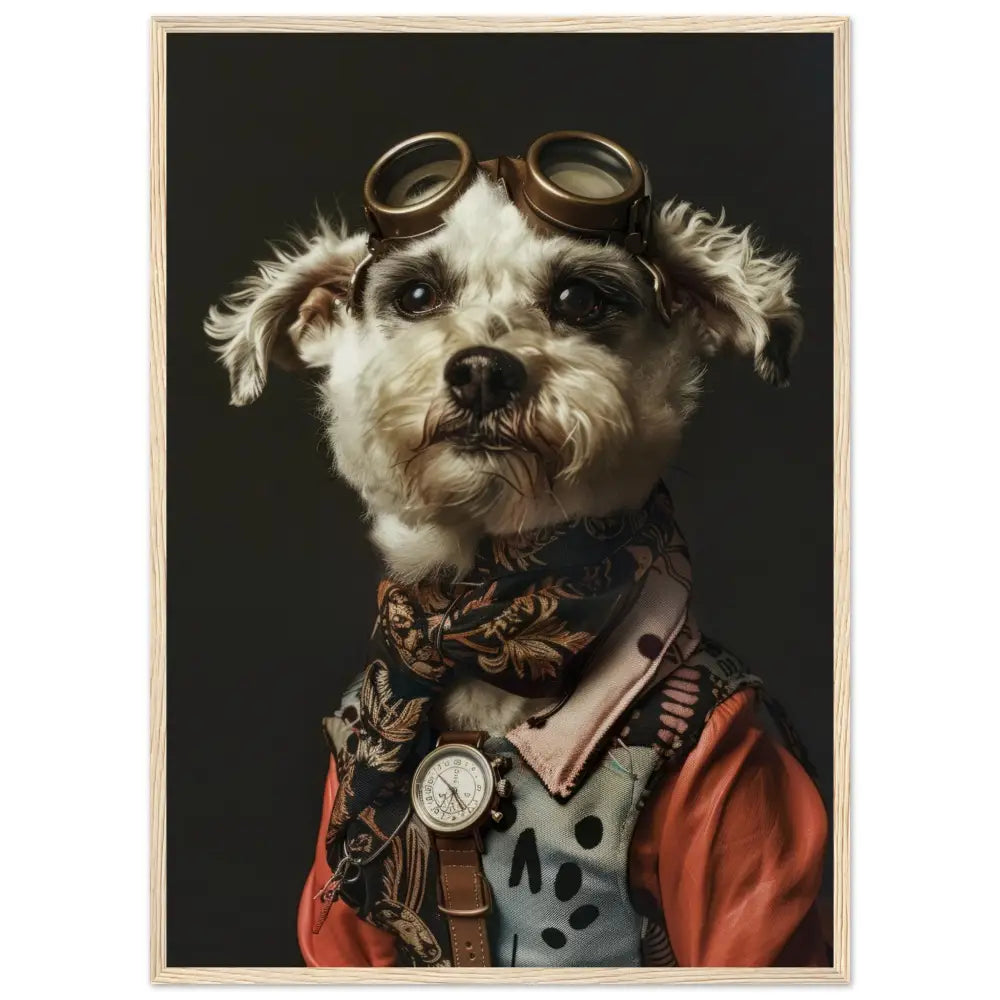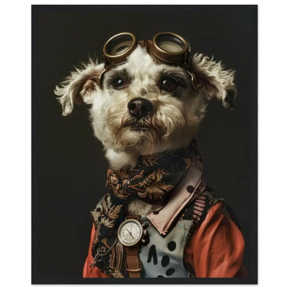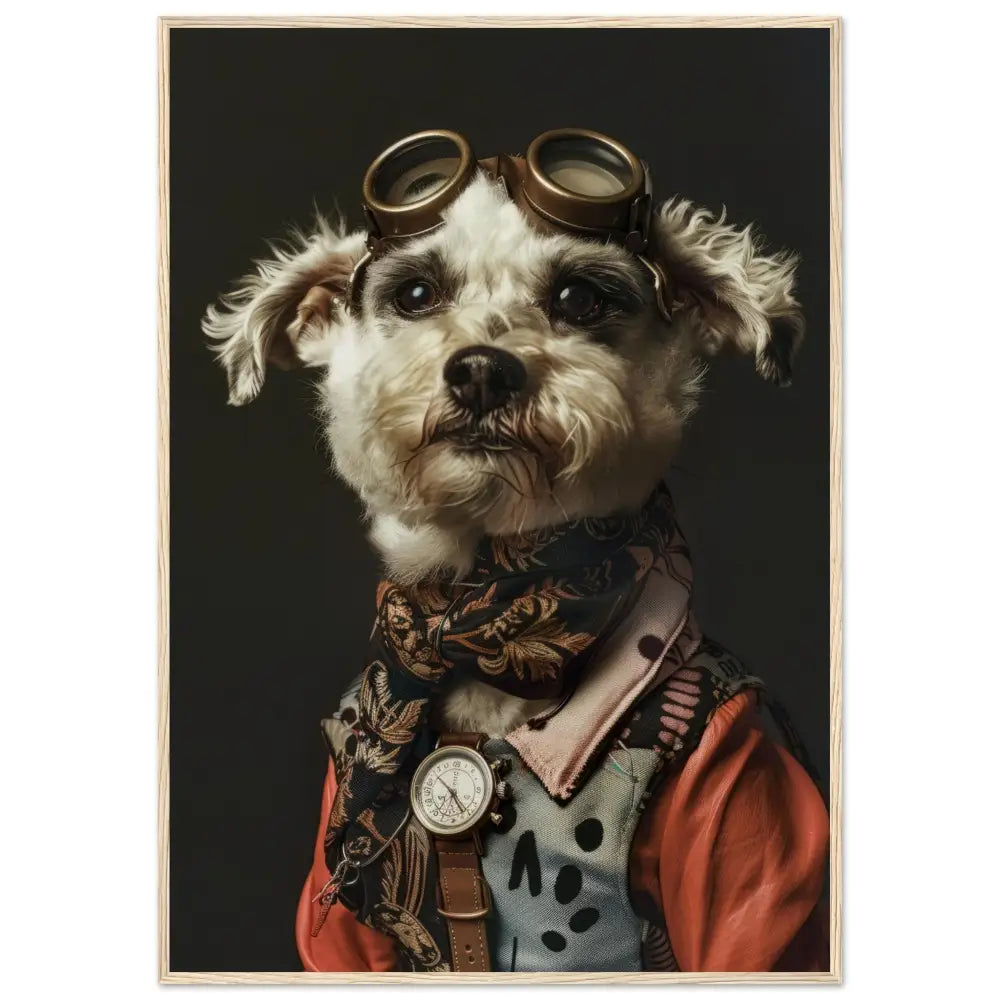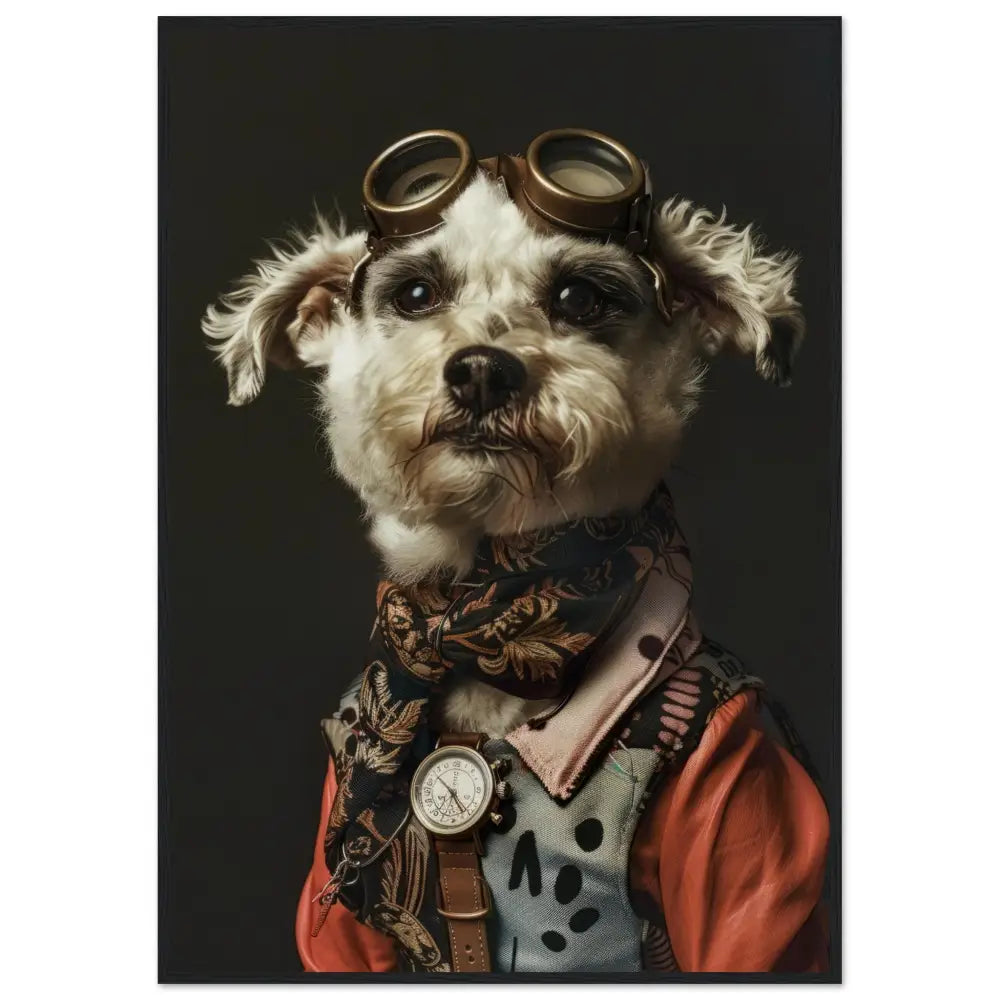 Deze afbeelding toont een hond, gekleed in een prachtige vintage steampunk outfit. De hond draagt een elegante, roestkleurige jas met ingewikkelde patronen en verfijnde stiksels, waardoor het een authentieke ouderwetse uitstraling krijgt. Om de nek hangt een antieke gouden klok, die schittert tegen de donkere vacht van de hond. Het hoofd wordt gesierd door een paar grote, bronzen retro-futuristische brillen met gedetailleerde metalen accenten, wat de avontuurlijke en tijdreizende sfeer benadrukt. De poten zijn omhuld in fijn geweven, zwarte bontachtige manchetjes en de jas is voorzien van leren accenten en contrasterende stiksels. De achtergrond is eenvoudig en donker, wat de focus op de