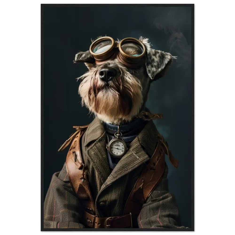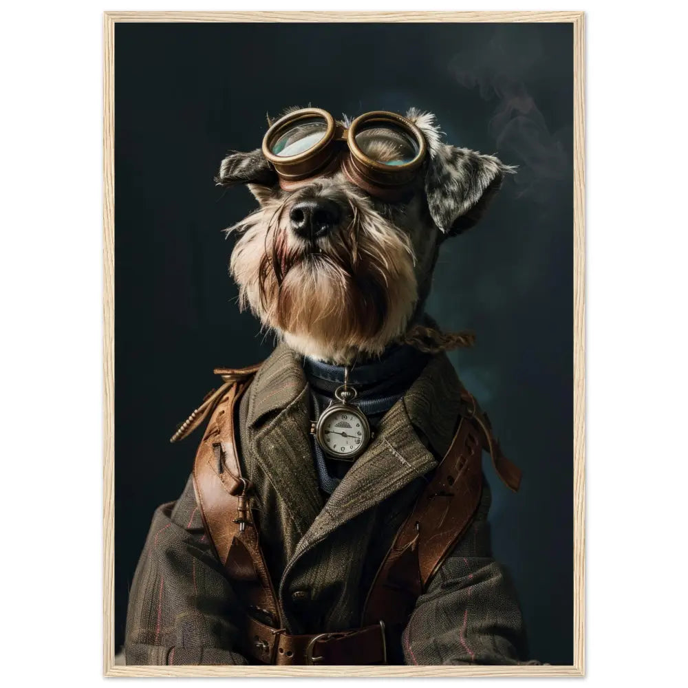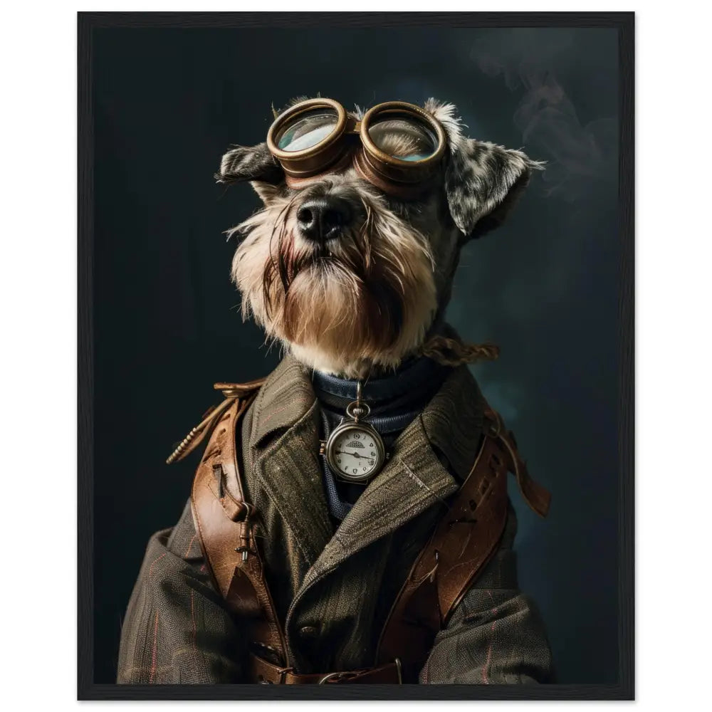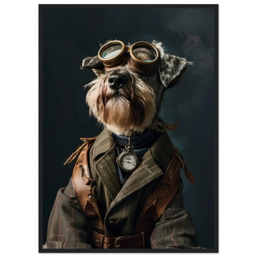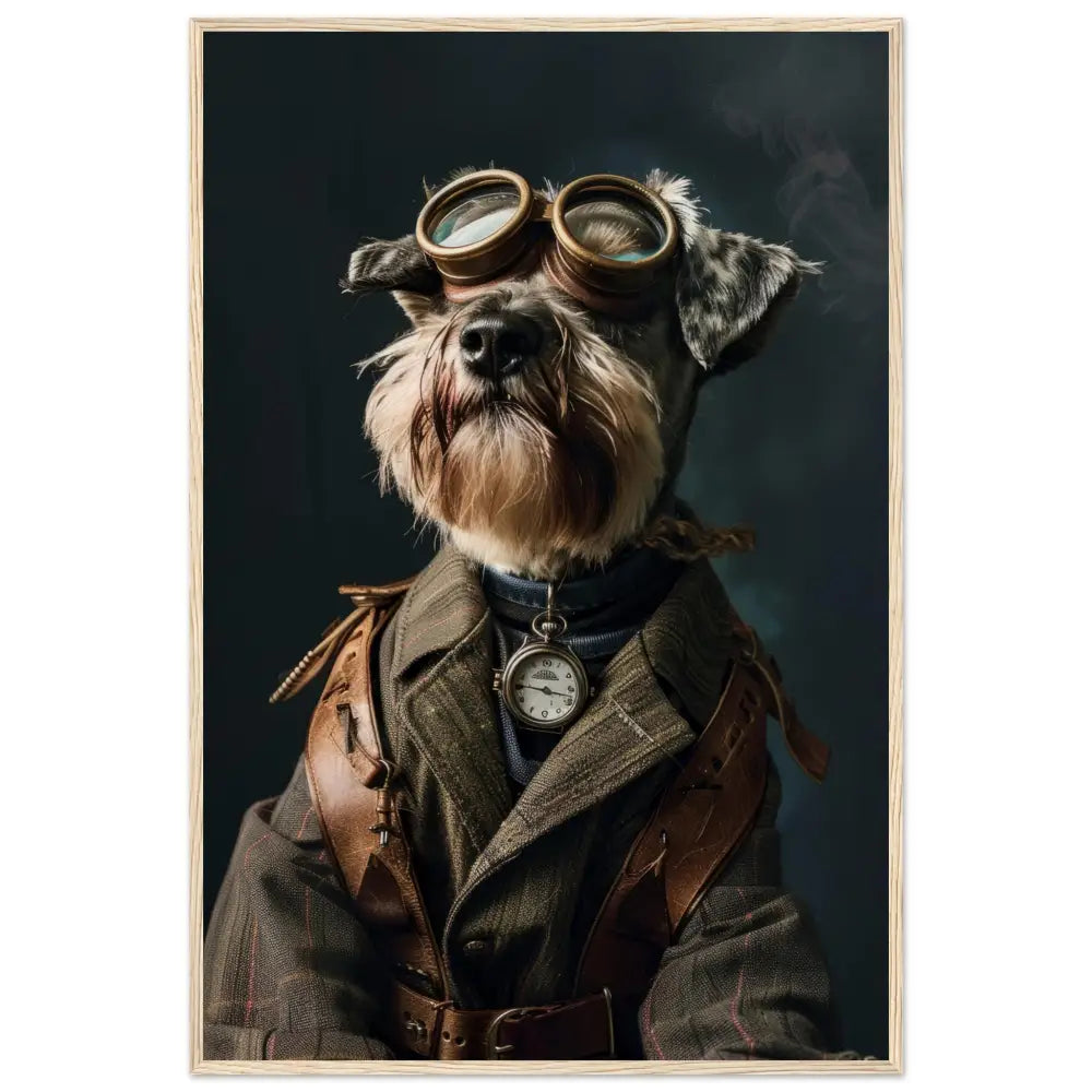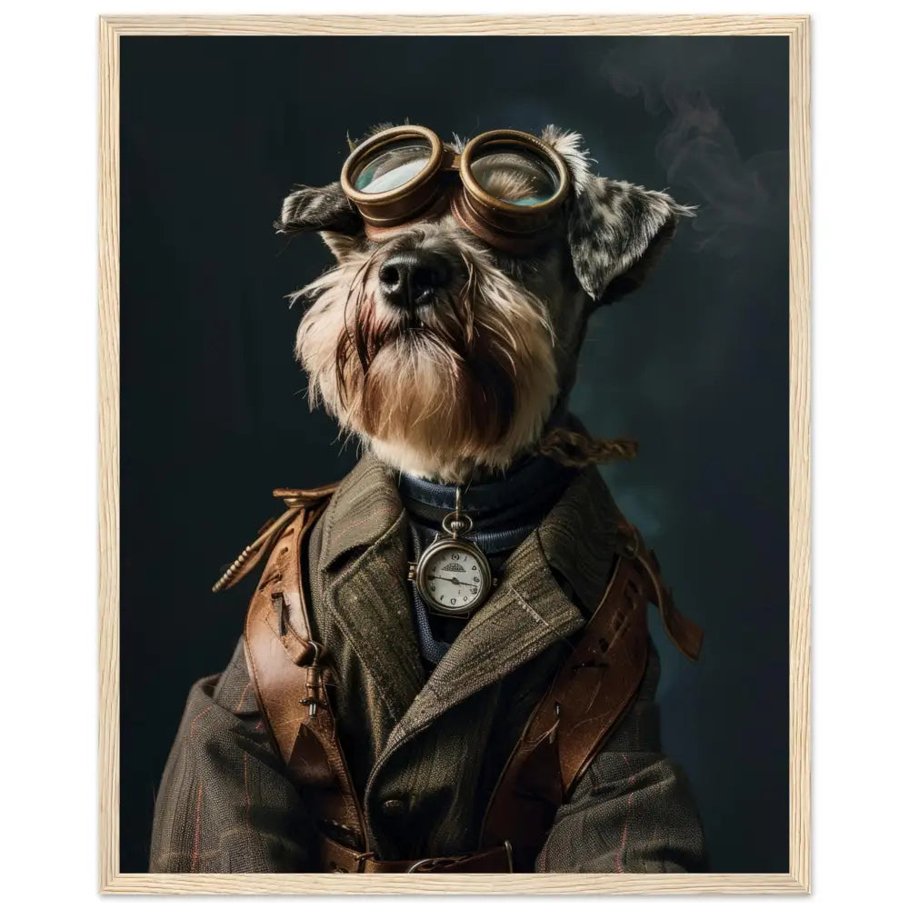 Deze afbeelding toont een dier, gekleed in een prachtige vintage steampunk outfit. Het draagt een elegante, olijfgroene jas met subtiele strepen en leren schouderdetails. Om de nek hangt een antieke zakhorloge in zilverkleur, die de klassieke uitstraling versterkt. De kop wordt gesierd door een paar grote, retro-futuristische brillen met metalen details in een bronzen tint, wat een avontuurlijke uitstraling verleent. De pootjes zijn voorzien van leren riemen en gesp accenten die het geheel afmaken. De donkere, mysterieuze achtergrond met lichte rookpluimen benadrukt de steampunk sfeer prachtig.