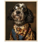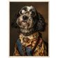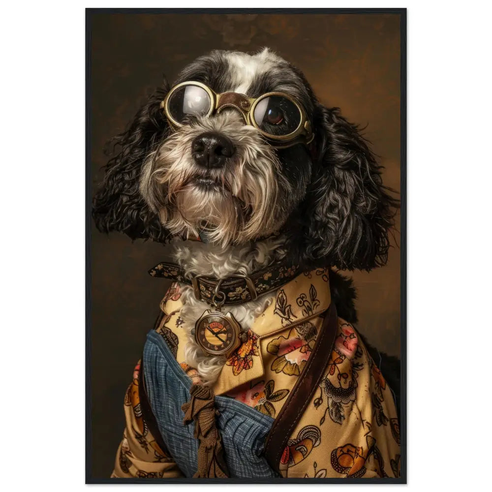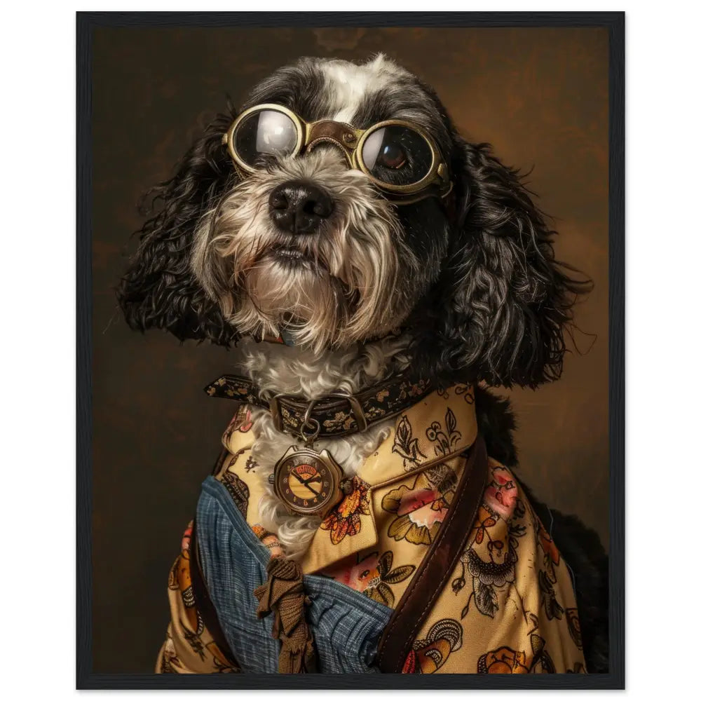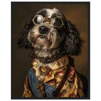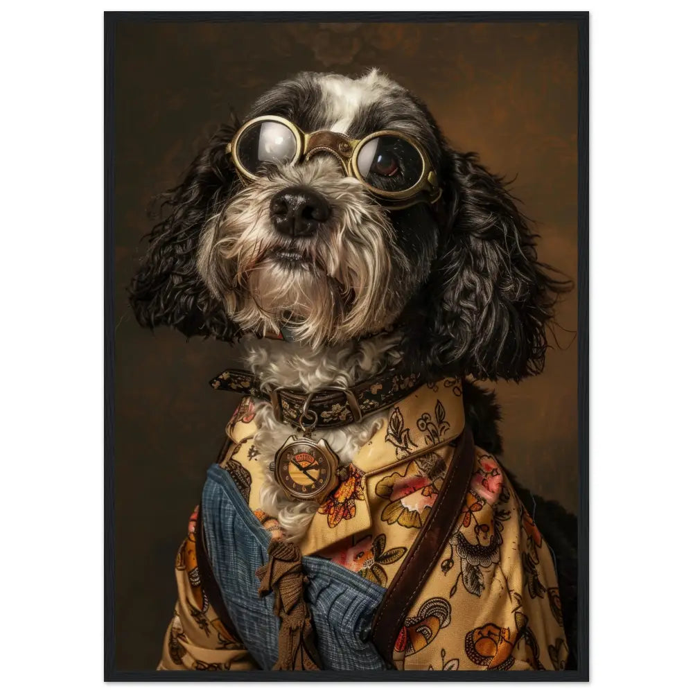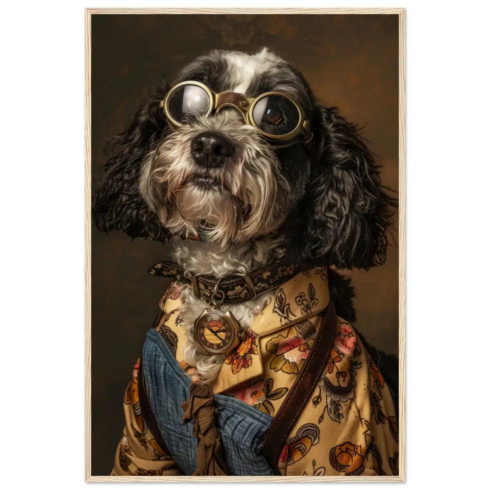 Deze afbeelding toont een hond, gekleed in een prachtige vintage steampunk outfit. Het draagt een sierlijke, mosterdgele jas met ingewikkelde bloemenpatronen en fluwelen accenten. Om de nek hangt een antieke zilveren klok, die de aristocratische uitstraling versterkt. De kop wordt gesierd door een paar grote, retro-futuristische brillen met metalen details in bronzen kleur, waardoor deze eruitziet als een avontuurlijke tijdreiziger. De pootjes zijn voorzien van elegante, grijsachtige bontachtige manchetjes die het geheel afmaken. De achtergrond is verzacht met warme, gedetailleerde patronen voor een nostalgische sfeer.