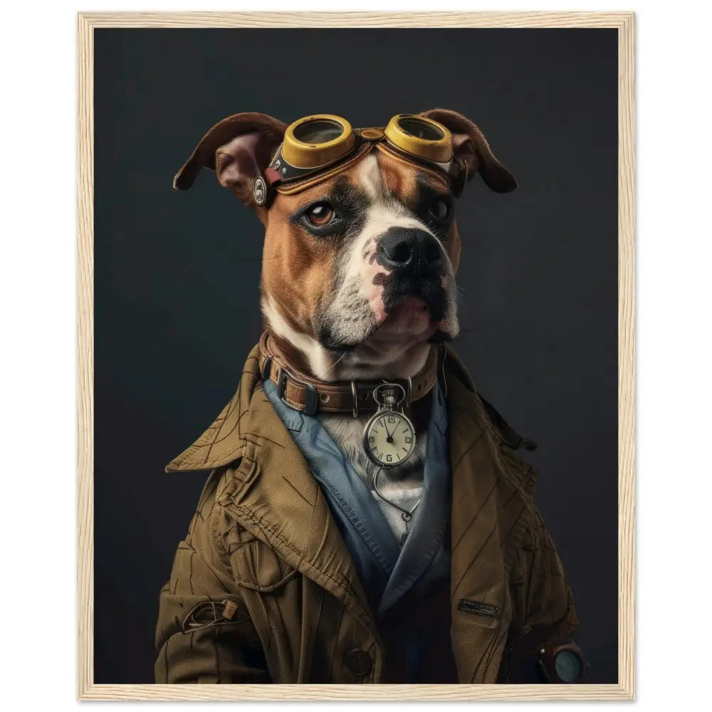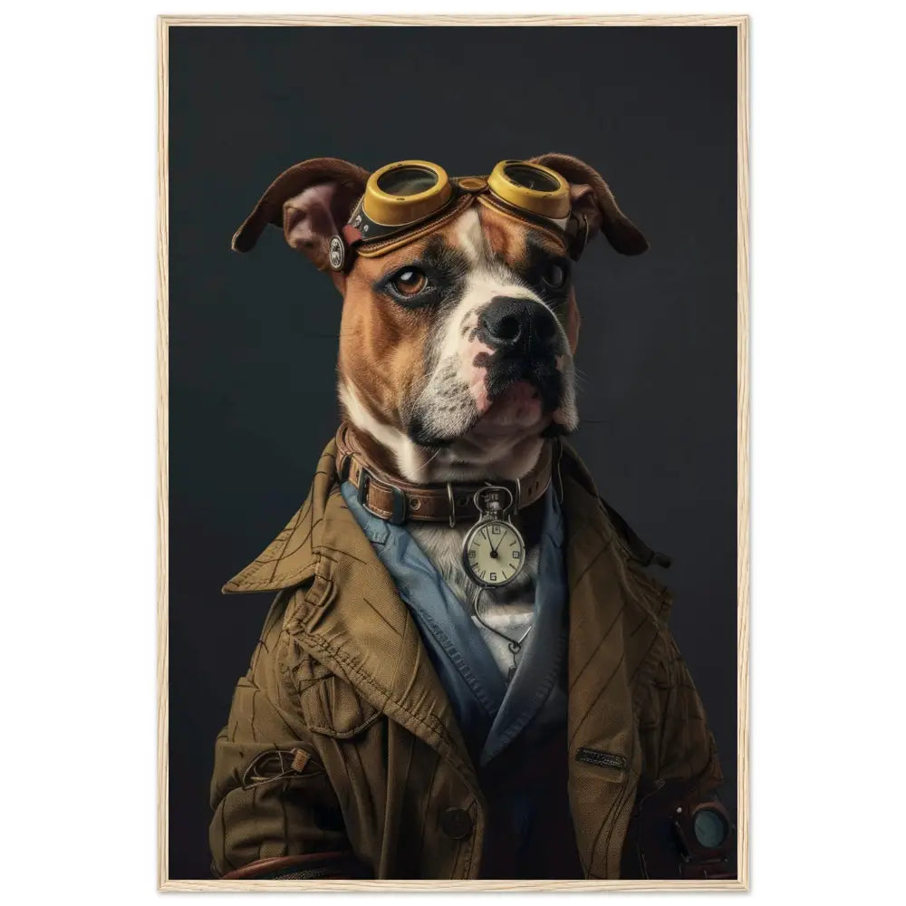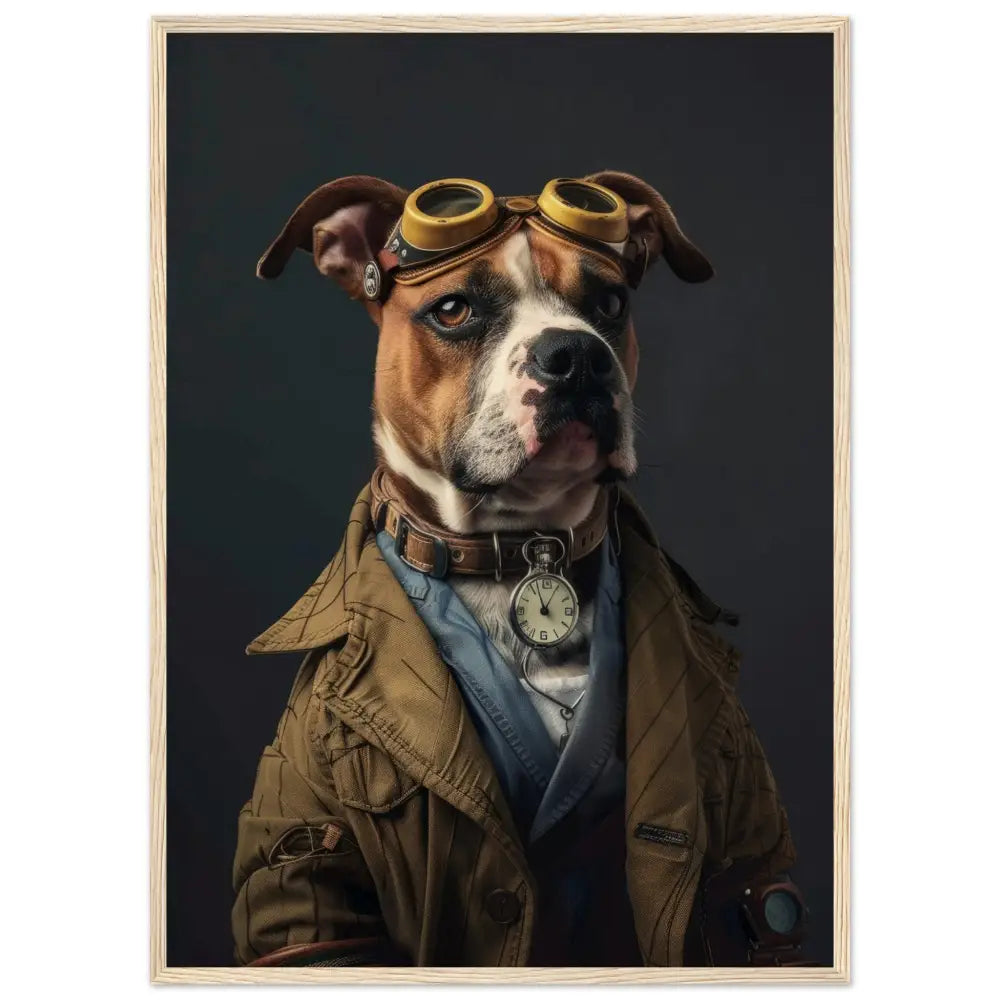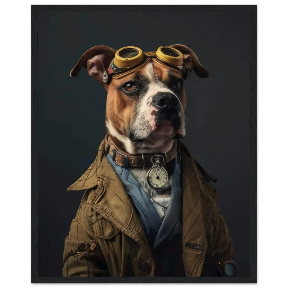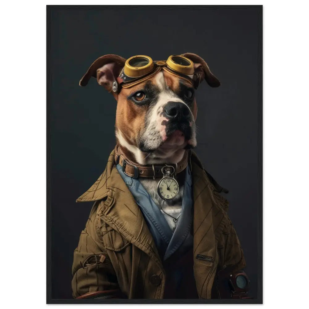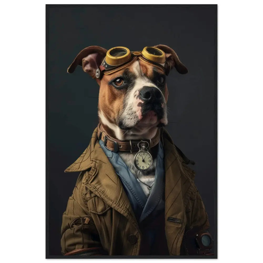 Deze afbeelding toont een dier, gekleed in een prachtige vintage steampunk outfit. Het draagt een elegante, bruinleren jas met gedetailleerde stiksels en vintage accenten. Om de nek hangt een antieke bronzen klok, die de tijdloze charme van dit portret versterkt. De kop wordt gesierd door een paar robuuste, goudkleurige brillen met metalen details, die een gevoel van avontuur en mysterie uitstralen. De pootjes zijn afgewerkt met luxueuze, grijze bontachtige manchetjes en leren accenten. De achtergrond is een donkere, mysterieuze tint, waardoor het dier nog meer opvalt en een intrigerende sfeer