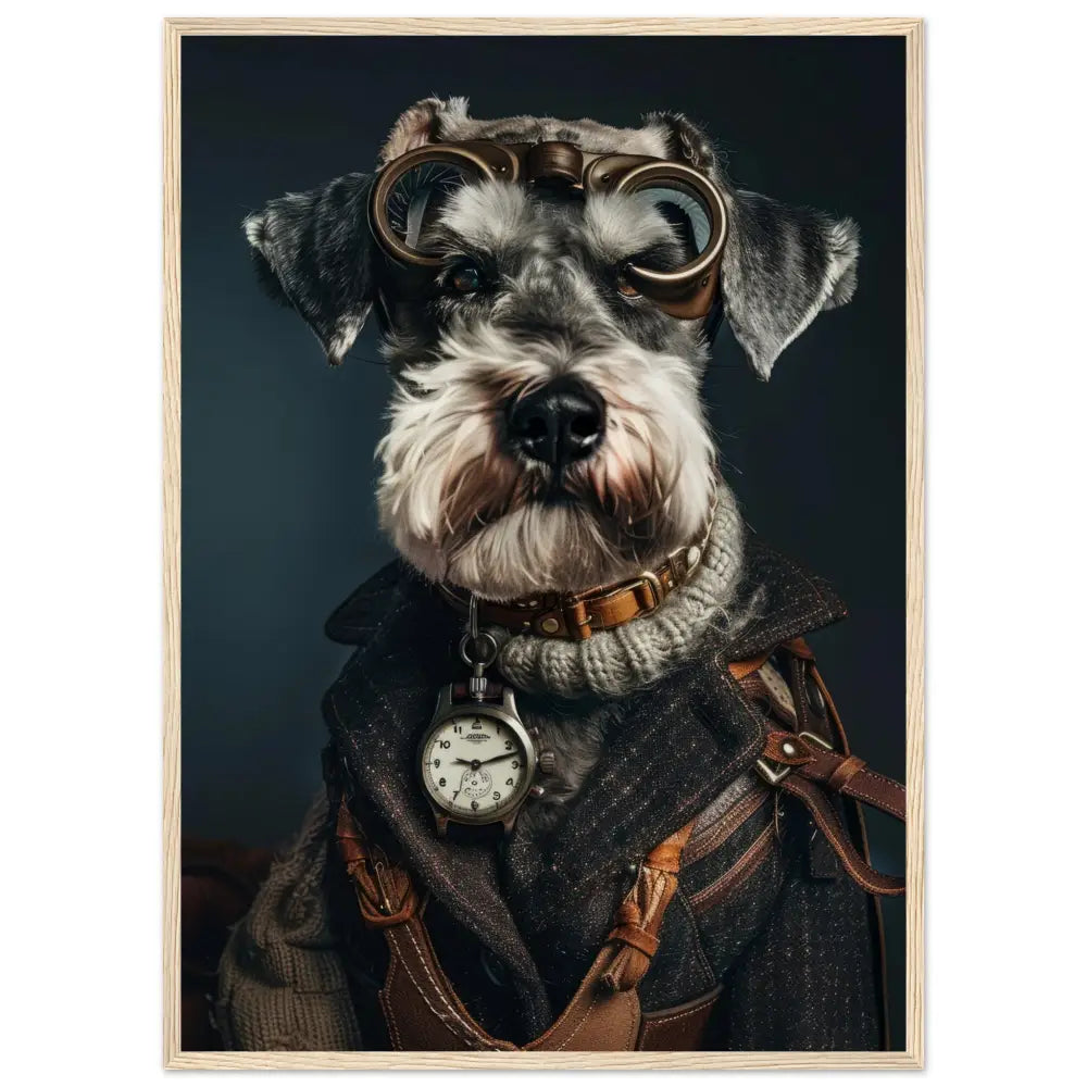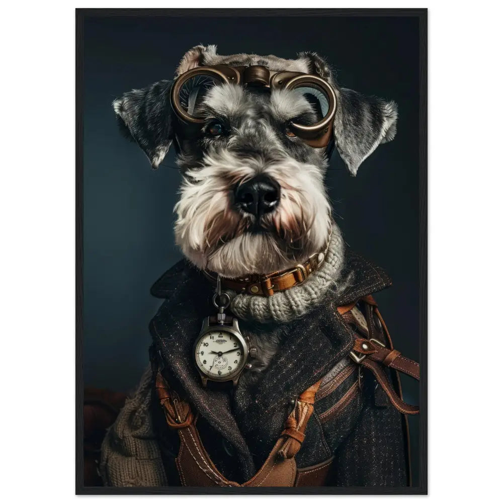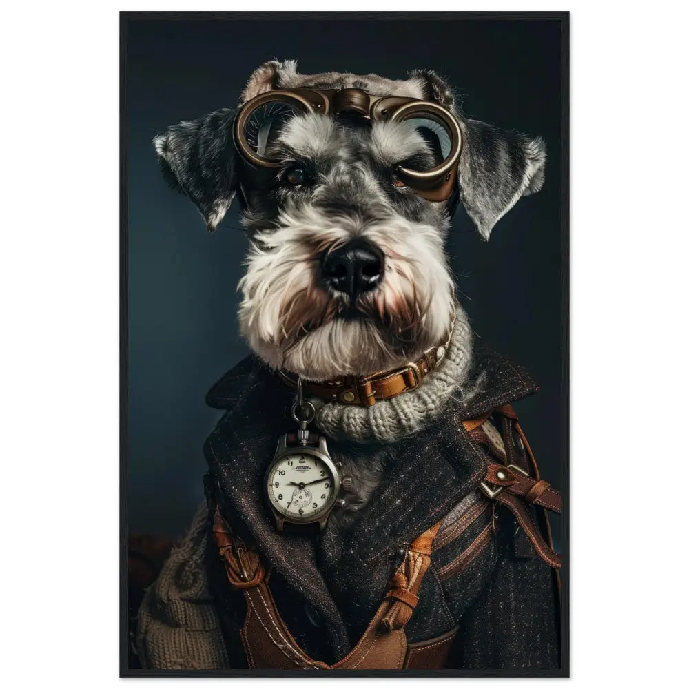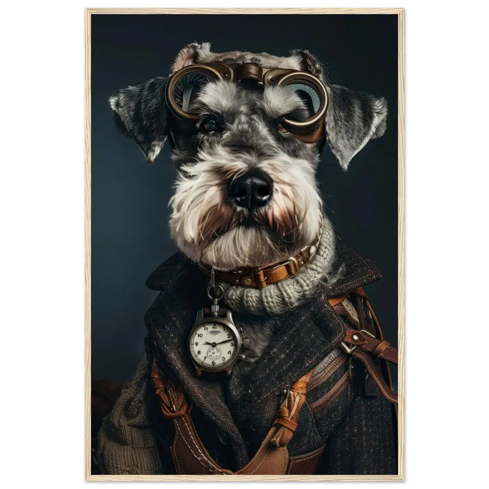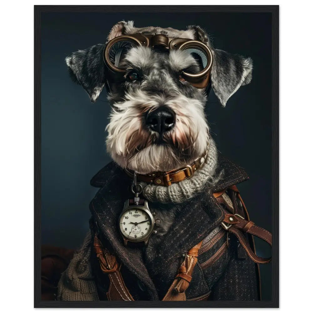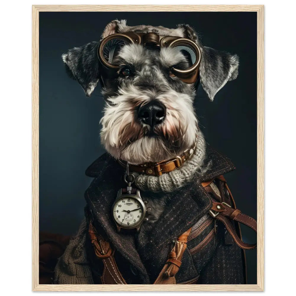 Deze afbeelding toont een dier, gekleed in een prachtige vintage steampunk outfit. Het draagt een verfijnde, antracietkleurige jas met subtiele glinsterende stippen en lederen riemaccenten. Om de nek hangt een antieke, zilverkleurige klok die de stijlvolle uitstraling versterkt. Op het hoofd prijkt een paar robuuste steampunk-brillen met bronzen metalen details, wat de futuristische charme benadrukt. De poten zijn versierd met grofgebreide manchetjes in een neutrale tint, terwijl contrasterende leren stiksels en riempjes het geheel compleet maken. De achtergrond is een diepblau