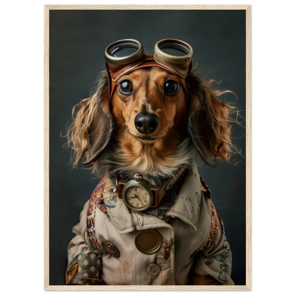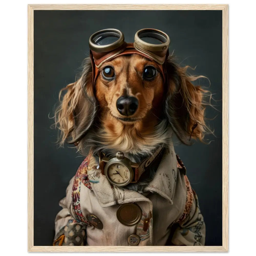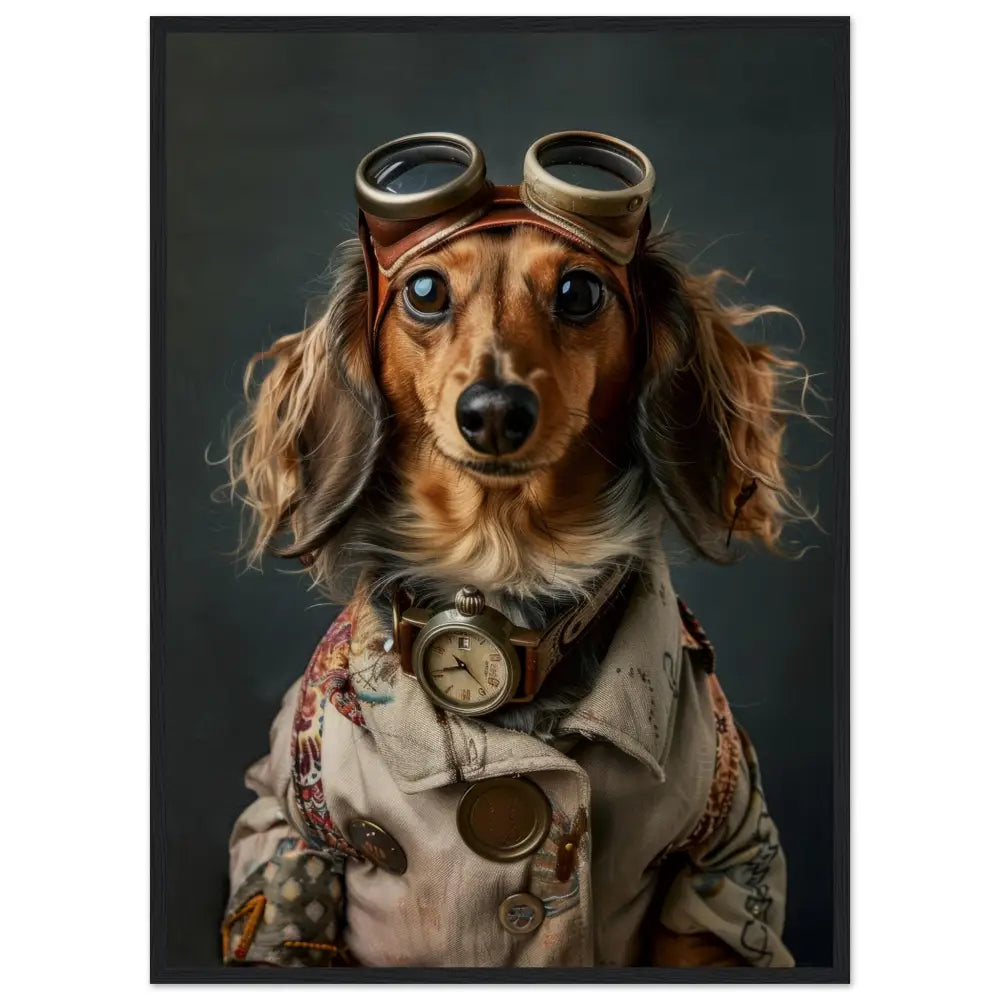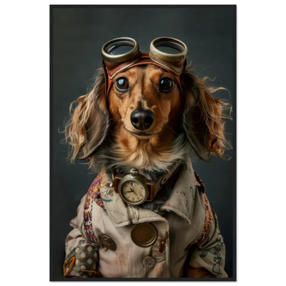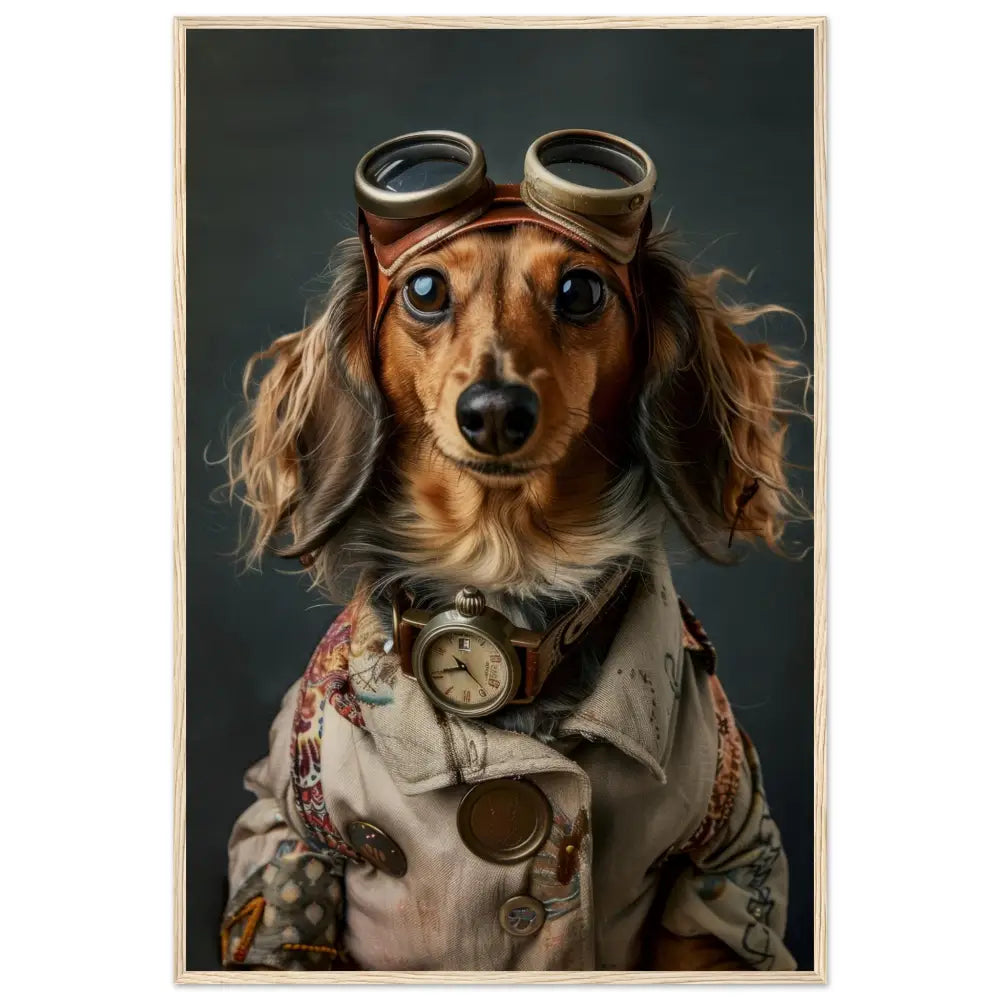 Deze afbeelding toont een dier, gekleed in een prachtige vintage steampunk outfit. Het draagt een sierlijke, beige jas met ingewikkelde patronen en koperen accenten. Om de nek hangt een antieke bronzen klok, die de nostalgische sfeer versterkt. De kop wordt gesierd door een paar grote, retro-futuristische brillen met metalen details in bronskleur, wat het dier een avontuurlijke uitstraling geeft. De pootjes zijn voorzien van stijlvolle, bontachtig manchetjes die het geheel afmaken. De achtergrond heeft een verweerde, industriële look met donkere, grijze tinten, waardoor de steampunk-stijl eruit springt.