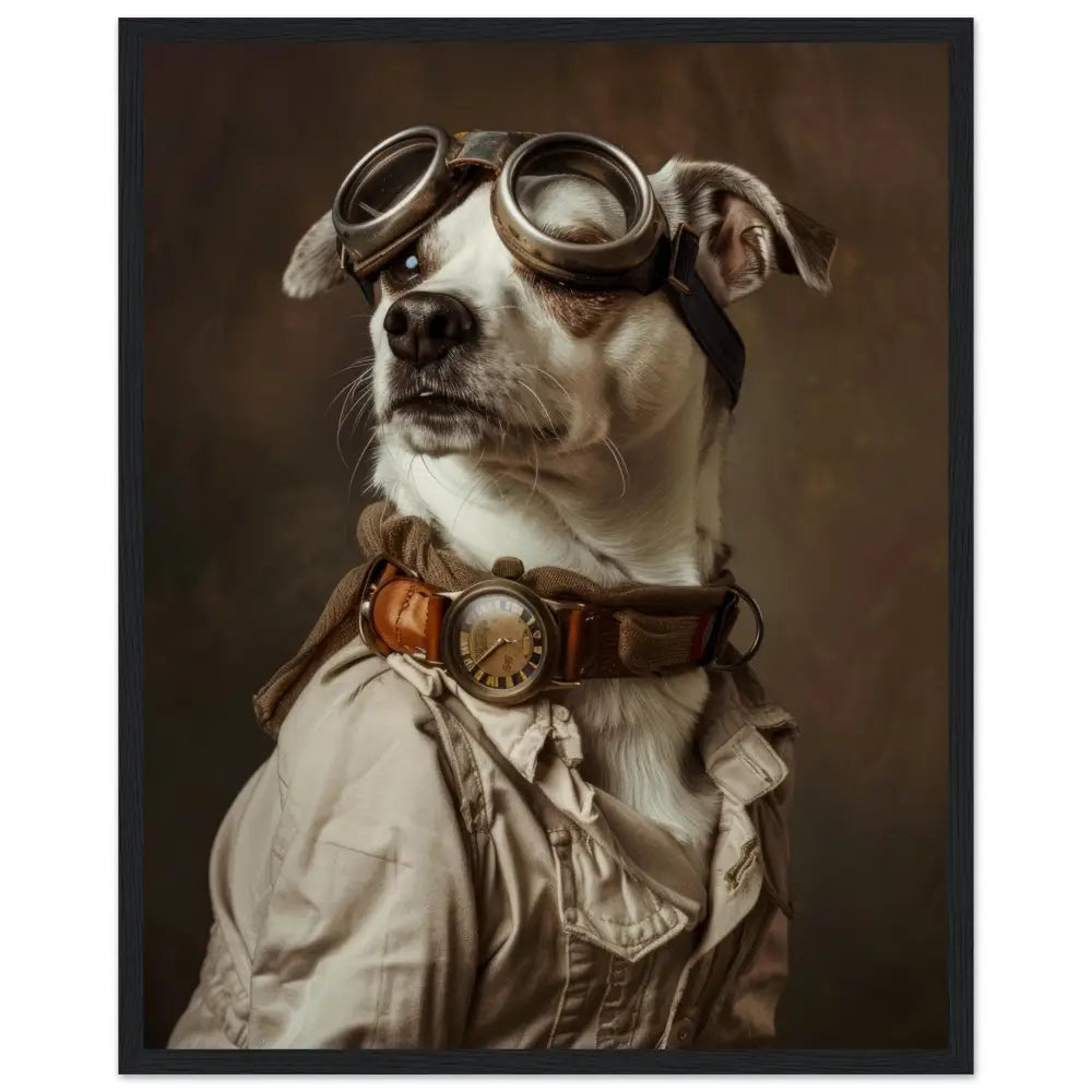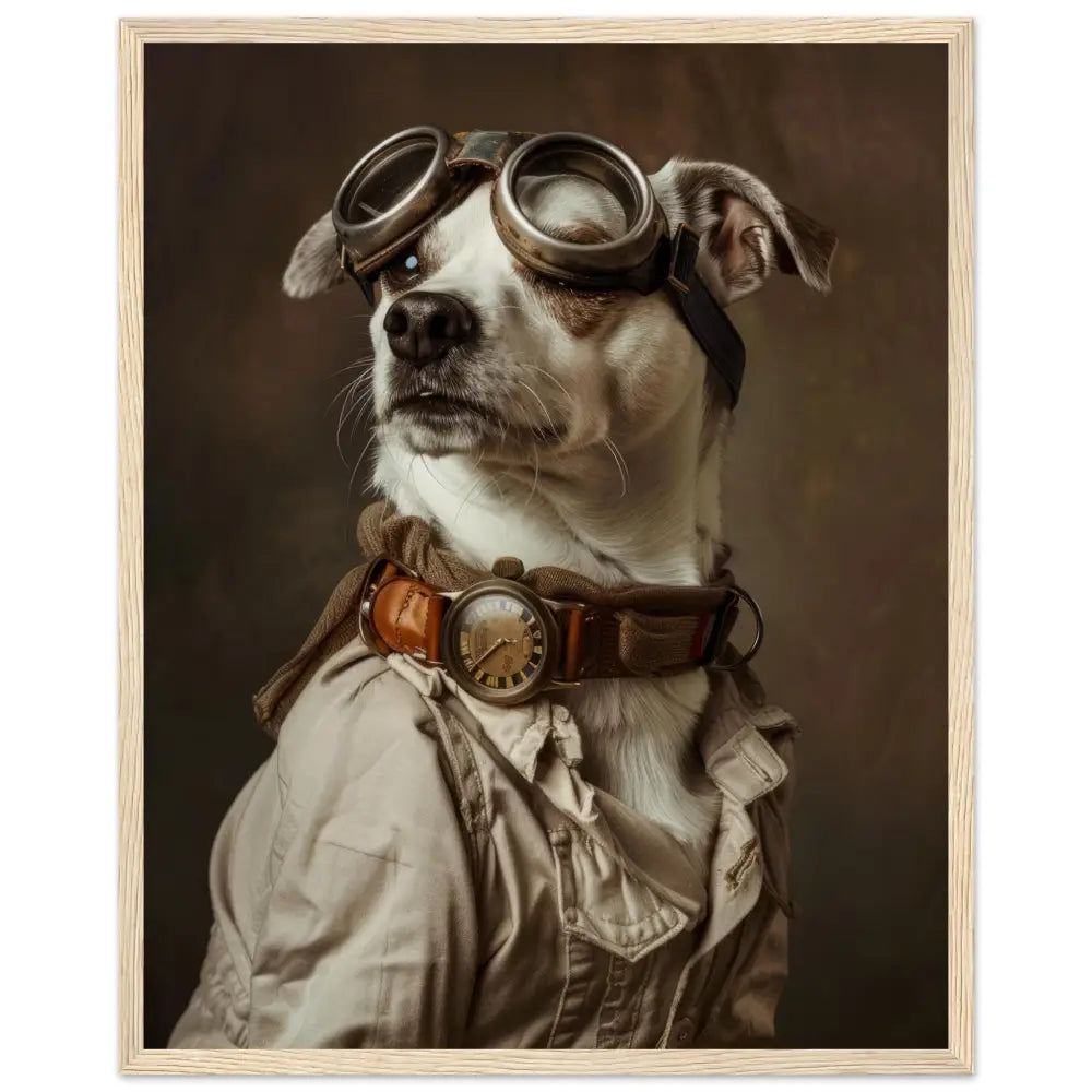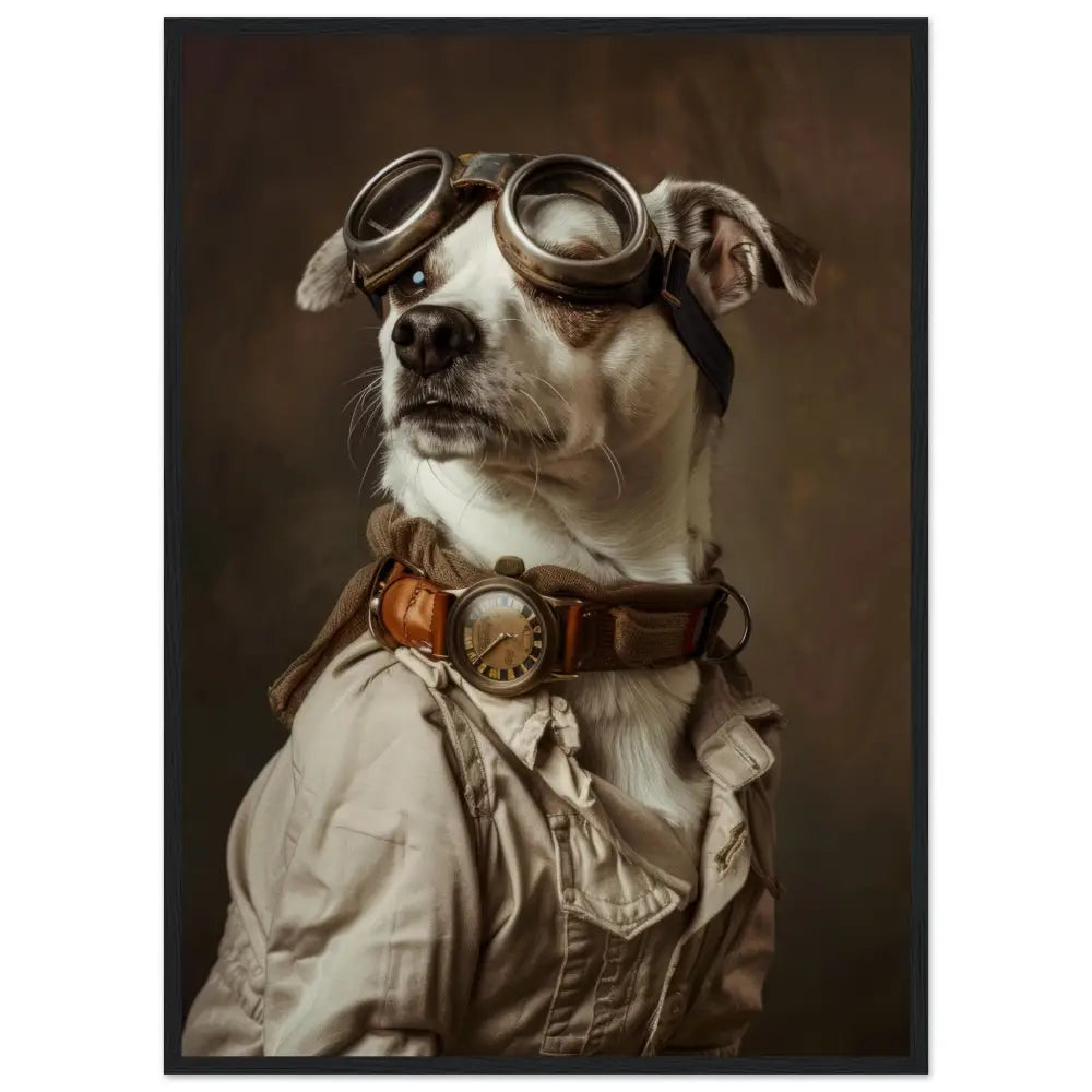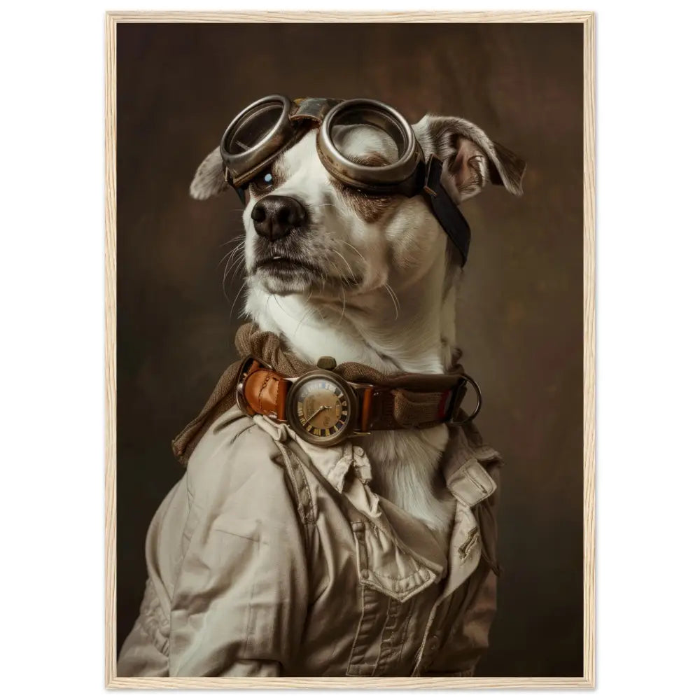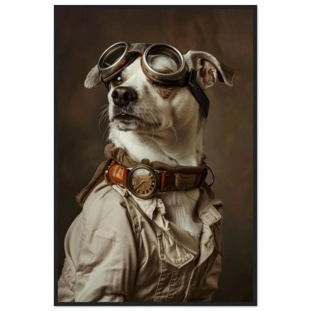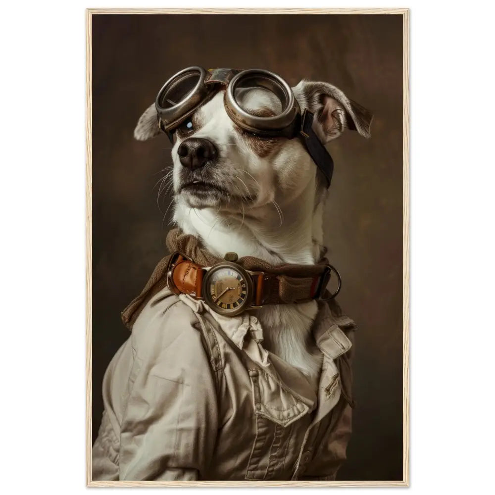 Deze afbeelding toont een hond, gekleed in een prachtige vintage steampunk outfit. Het draagt een elegante, beige jas met subtiele, fraaie plooien en accenten. Om de nek hangt een antieke klok met een bruin leren band, wat de retro stijl versterkt. De kop is gesierd met een paar grotereilige, bronzen brillen met zware metalen details en glazen lenzen in grijs, waardoor deze hond er als een moedige luchtvaartpionier uitziet. Extra details zoals leren riempjes en gedetailleerde stiksels dragen bij aan de authentieke uitstraling. De achtergrond is een rustieke muur in warme tinten, wat de steampunk sfeer compleet maakt.