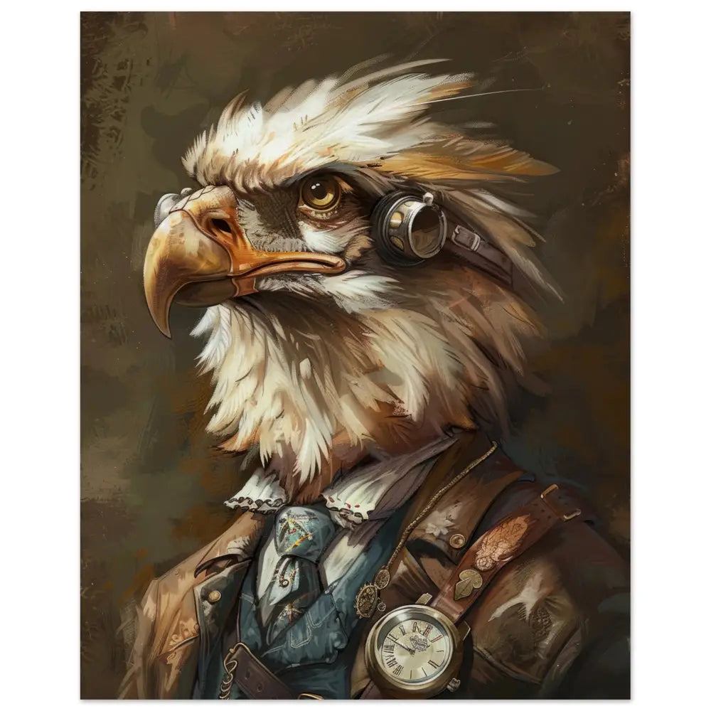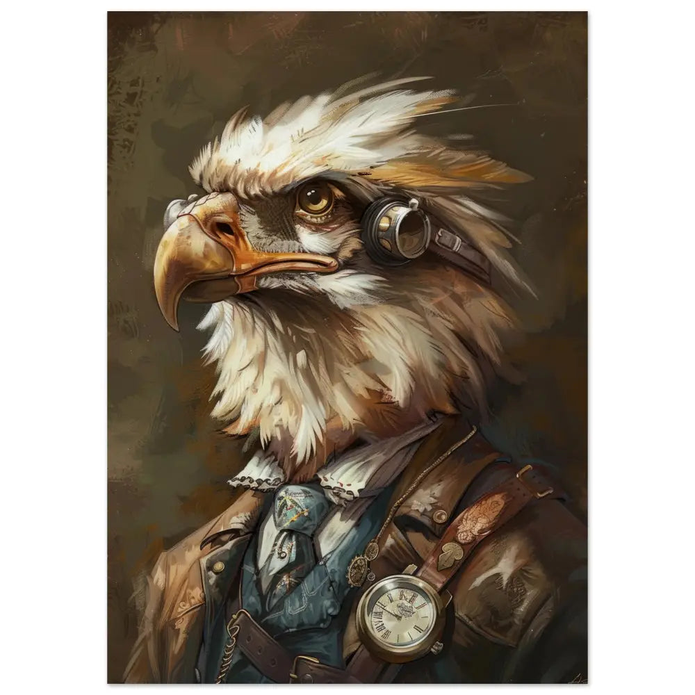 Deze afbeelding toont een dier, gekleed in een prachtige vintage steampunk outfit. Het draagt een stijlvolle, bruine jas versierd met delicate gouden patronen en leren accenten. Om de nek hangt een antieke zilveren klok die elegantie uitstraalt. Het hoofd is gesierd met een paar steampunk-brillen voorzien van gedetailleerde metalen afwerkingen in zwart en zilver, die een mysterieus en onderzoekend karakter toevoegen. De kraag van de jas is versierd met witte, bontachtige manchetjes en subtiele stiksels, die de outfit compleet maken. De achtergrond is een mix van aardetinten en abstracte vormen, die de tijdloze sfeer van de steampunk geven.