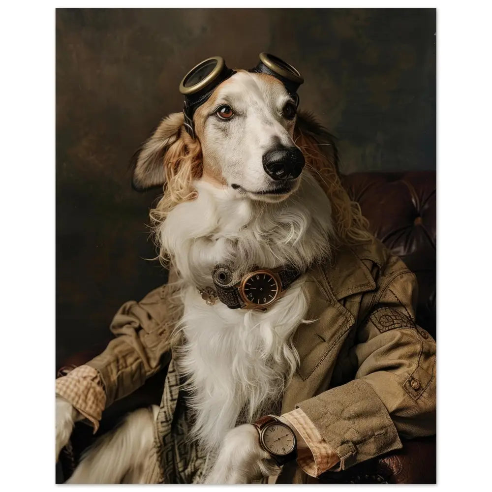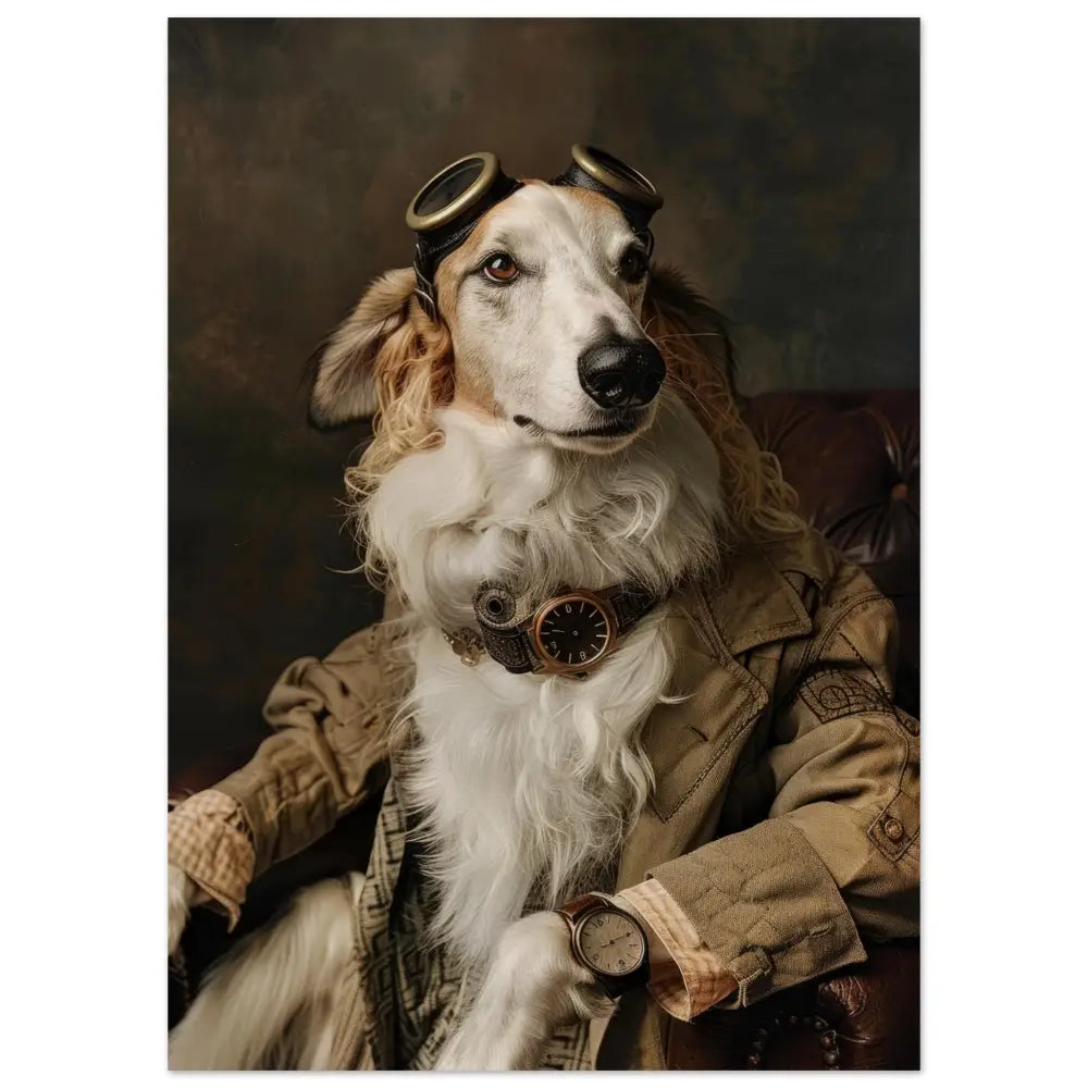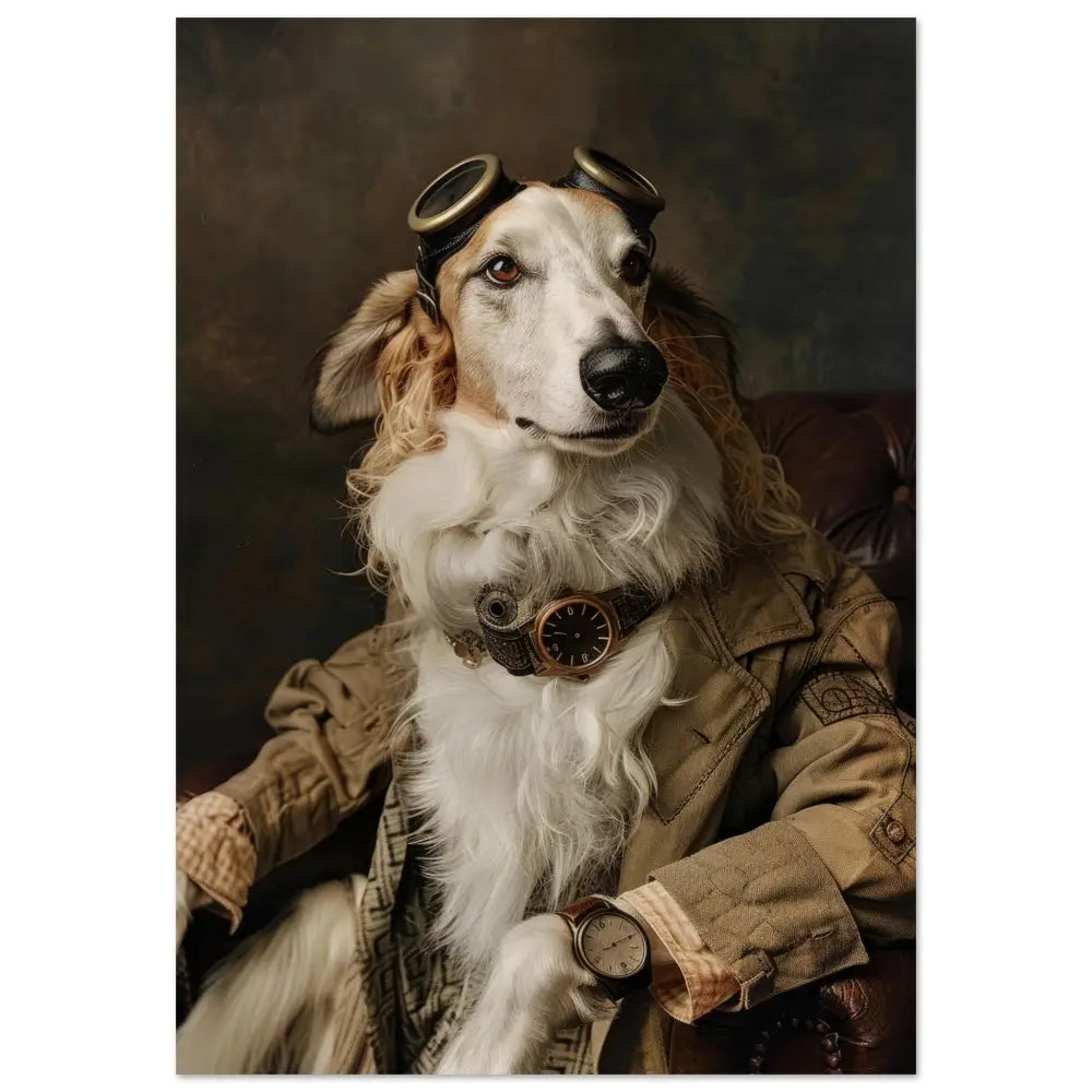 Deze afbeelding toont een hond, gekleed in een prachtige vintage steampunk outfit. Het draagt een elegante, zandkleurige jas met subtiele patronen en gedetailleerde stiksels. Om de nek hangt een antieke klok in een bronzen tint, die de klassieke uitstraling benadrukt. De kop wordt gesierd door een paar massieve, retro-futuristische brillen met metalen details in een gouden kleur, wat de hond een avontuurlijke tijdreiziger maakt. De pootjes zijn voorzien van chique, crèmekleurige manchetjes, leren accenten, en verfijnde contrasterende stiksels. De achtergrond bestaat uit een sfeervol, donker historisch patroon, wat de charme van de afbeelding versterkt.