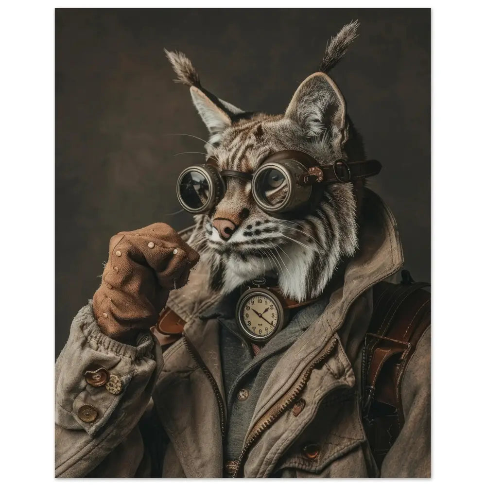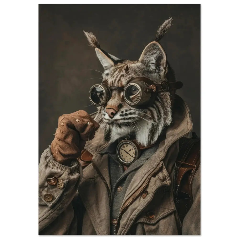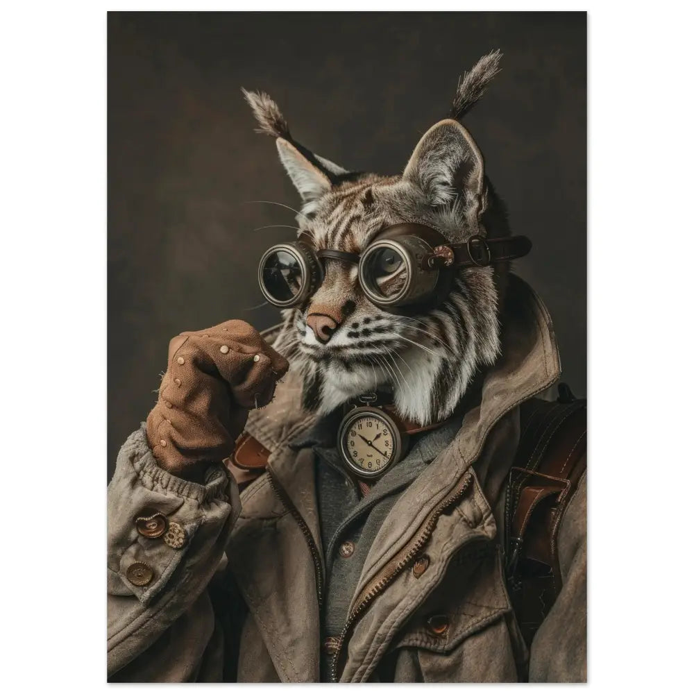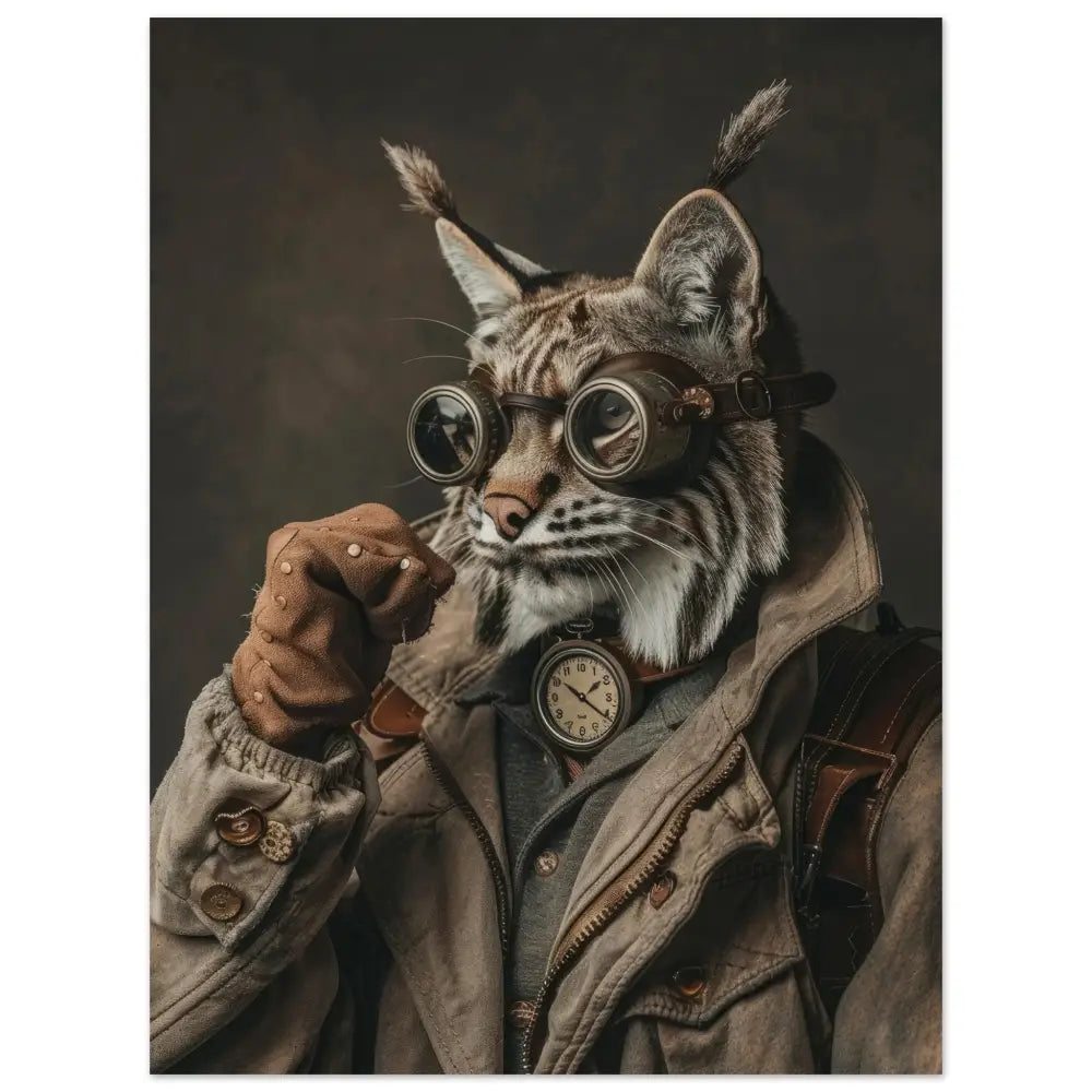 Deze afbeelding toont een dier, gekleed in een prachtige vintage steampunk outfit. De dier draag een elegante, grijze jas met subtiele knopen en fijne stiksels langs de randen. Om zijn nek hangt een antieke gouden klok, die een vleugje nostalgie toevoegt aan het geheel. Op het hoofd rust een paar indrukwekkende, bronzen brillen met gedetailleerde metalen onderdelen, die het een ingenieuze uitstraling geven. De pootjes zijn gehuld in stijlvolle, bruine handschoenen met decoratieve knopen en leren accenten. De achtergrond is donker en mysterieus, waardoor het dier naar voren springt als een avontuurlijke tijdreiziger.