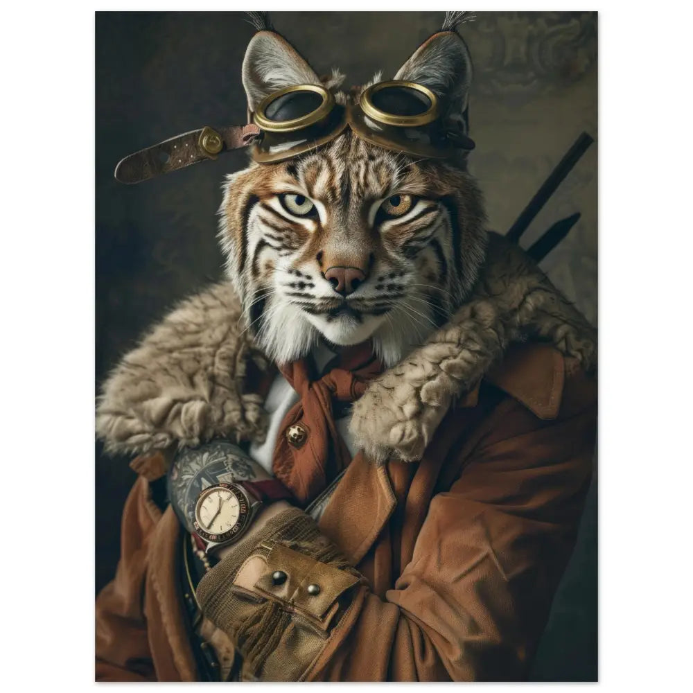 Deze afbeelding toont een dier, gekleed in een prachtige steampunk outfit. Het draagt een imposante, bruinleren jas zonder al te veel patronen, maar verrijkt met robuuste, metalen accenten. Om de nek hangt een antieke, zilveren klok met een dergelijk elegante uitstraling om de avontuurlijke tijdreiziger te benadrukken. De kop wordt geaccentueerd door een stel grote, vintage bril met messing metalen details, wat bijdraagt aan zijn intrigerende look. De voorpoten zijn versierd met stijlvolle, beige bontachtige manchetjes en leren accenten. De achtergrond is verrijkt met subtiele patronen die de mystieke sfeer van deze steampunk-wereld mooi weergeven.