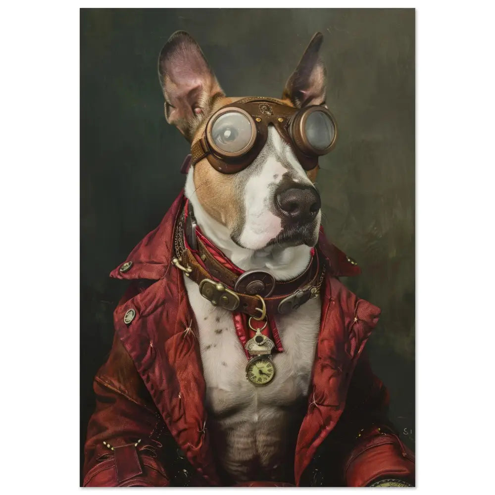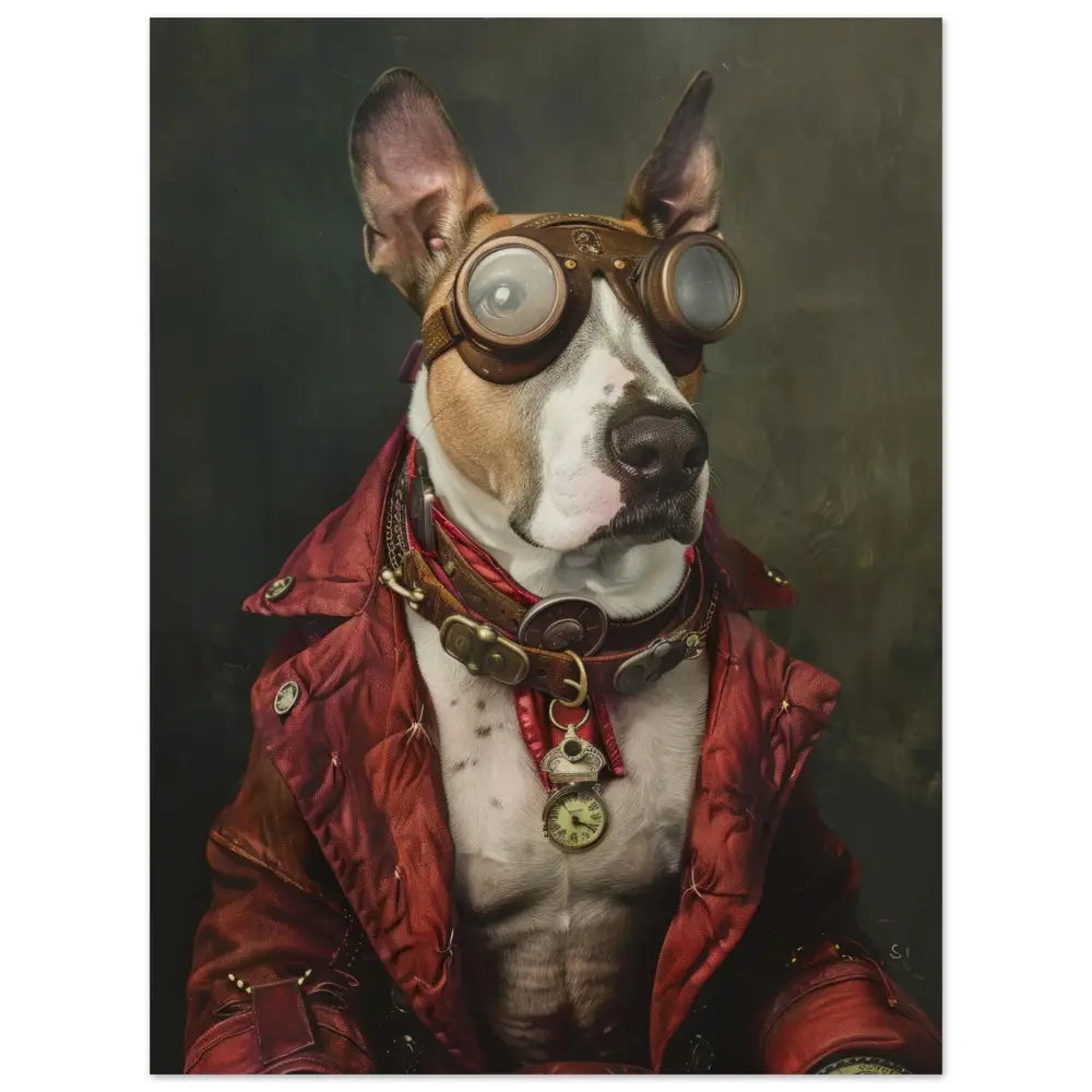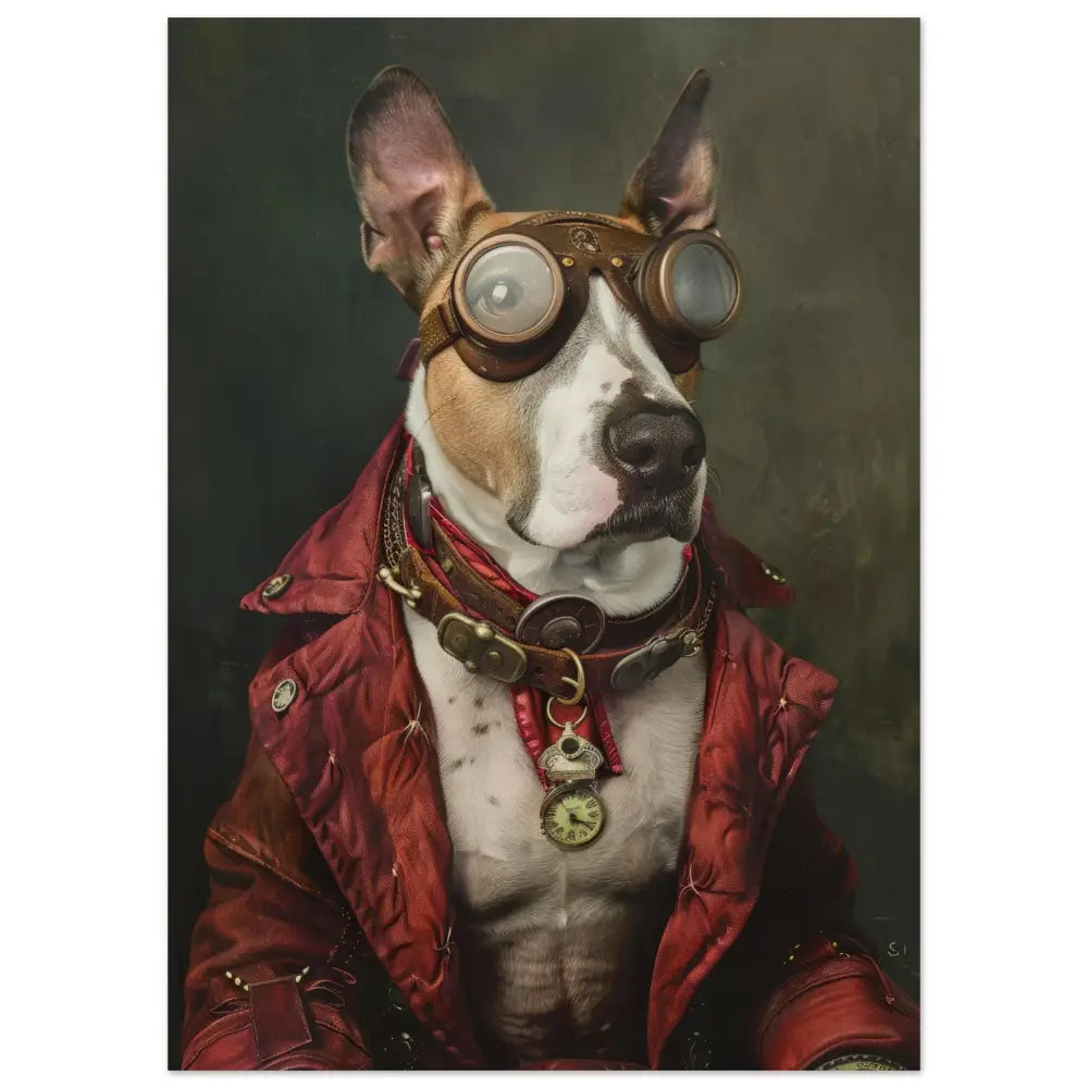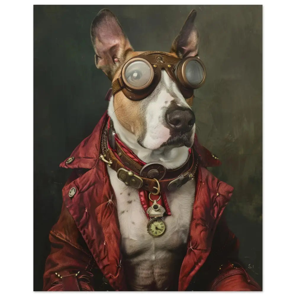 Deze afbeelding toont een dier, gekleed in een prachtige vintage steampunk outfit. Het draagt een rijk gedetailleerde, bordeauxrode jas met verfijnde patronen en metalen knopen op de schouders. Om de nek hangt een antieke koperen klok, die het traditionele en rustieke gevoel versterkt. De kop wordt geaccentueerd door een paar grote, bronzen retro-futuristische brillen, waardoor deze de charme van een tijdreiziger uitstraalt. De pootjes zijn gehuld in stijlvolle, bruinleren accessoires met stijlvolle stiksels. De achtergrond is abstract en donker, waardoor de details van de outfit nog prominenter naar voren komen.