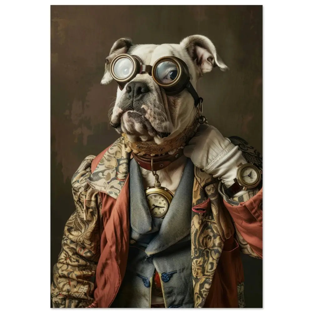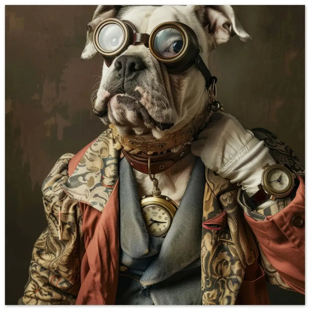Deze afbeelding toont een dier, gekleed in een prachtige vintage steampunk outfit. Het draagt een verfijnde jas in een rustieke mix van beige en rood, versierd met ingewikkelde bloemmotieven en robuuste naden. Om de nek hangt een antieke gouden klok, perfect passend bij de stijl. Het hoofd wordt gesierd door een paar imposante, retro-futuristische brillen met bronzen metalen accenten, wat een gevoel van mysterie en avontuur geeft. De voorpootjes zijn afgewerkt met elegante leren manchetjes en contrasterende stiksels. De achtergrond, een gestructureerde mix van donkere tinten, accentueert de charme van het geheel volledig.
