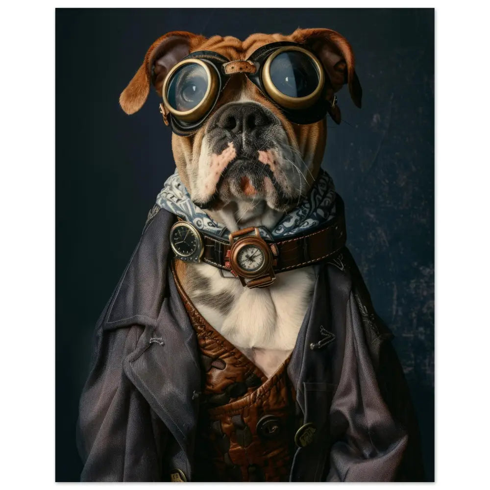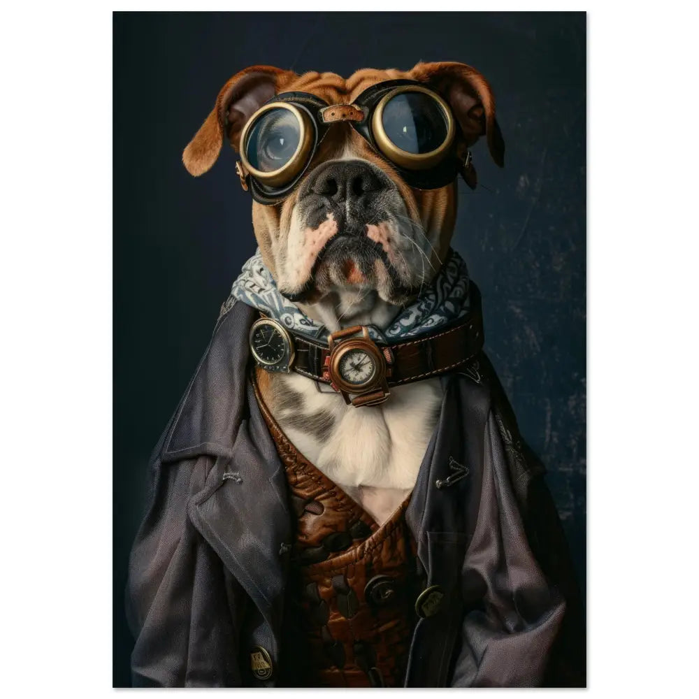 Deze afbeelding toont een dier, gekleed in een prachtige vintage steampunk outfit. Het draagt een verfijnde, donkergrijze jas met subtiele zilveren accenten en sierlijke patronen. Om de nek van de hond hangt een antieke bronzen klok, die prachtig afsteekt tegen de donkere tinten van de outfit. De kop is voorzien van retro-futuristische brillen met massieve metalen details in gouden kleur, wat het geheel een avontuurlijke uitstraling geeft. De poten zijn afgewerkt met elegante leren manchetjes, en leren accenten en contrasterende stiksels completeren de stoere look. De donkere achtergrond zorgt voor een mystieke sfeer die perfect bij de steampunk-stijl past.