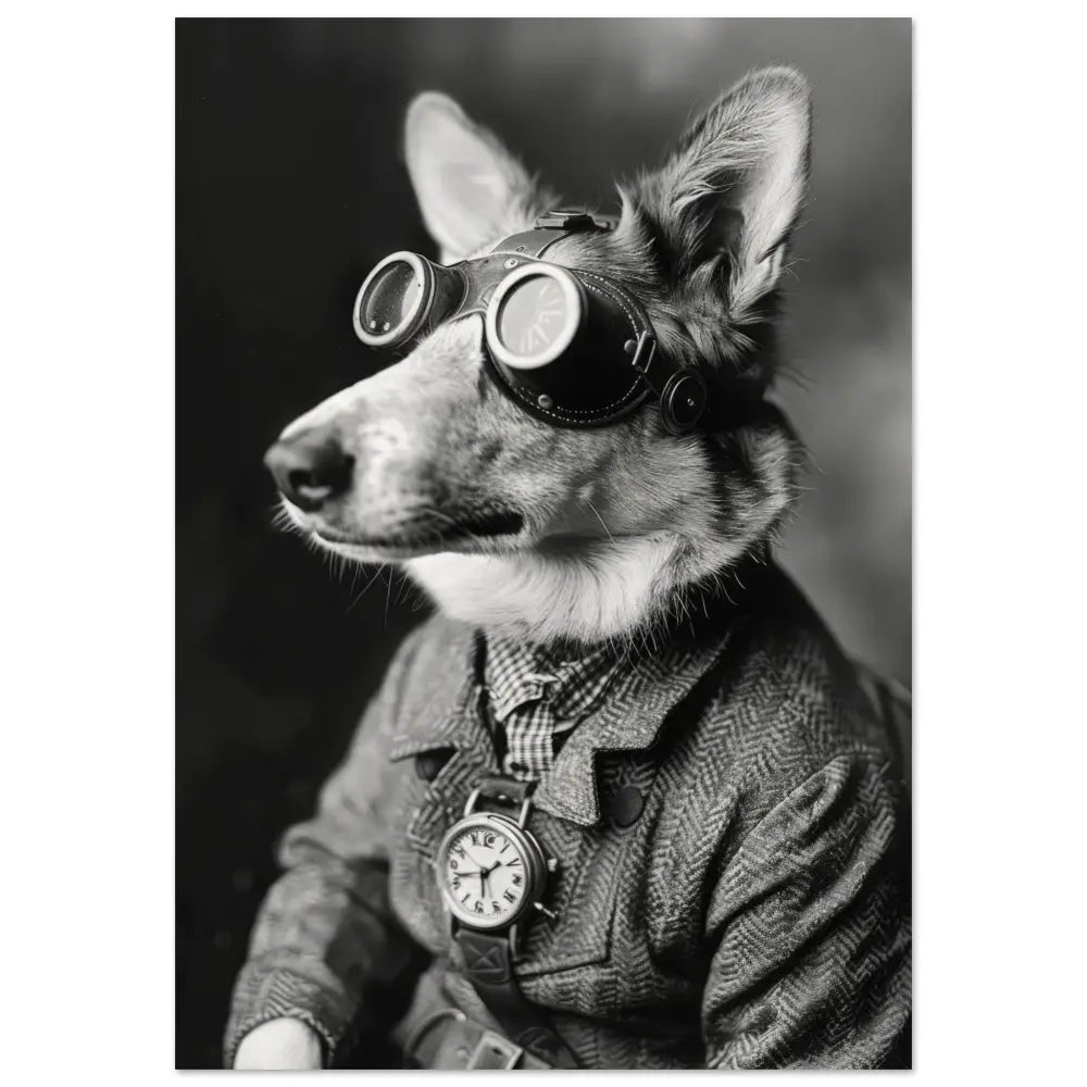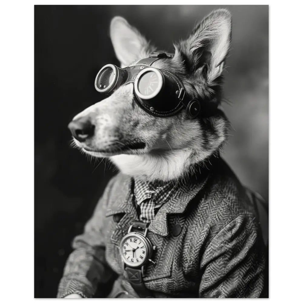 Deze afbeelding toont een dier, gekleed in een prachtige vintage steampunk outfit. Het draagt een elegante, grijze jas met een visgraatpatroon en subtiele leren accenten. Om de nek hangt een antieke zilveren klok, die de aristocratische uitstraling versterkt. De kop wordt gesierd door een paar indrukwekkende retro-futuristische brillen met metalen details in een donkere bronskleur, waardoor deze eruitziet als een avontuurlijke tijdreiziger. De pootjes zijn voorzien van stijlvolle, donkere leren bandjes die het geheel afmaken. De achtergrond is mysterieuze, wazige tinten, die perfect passen bij de steampunk sfeer.