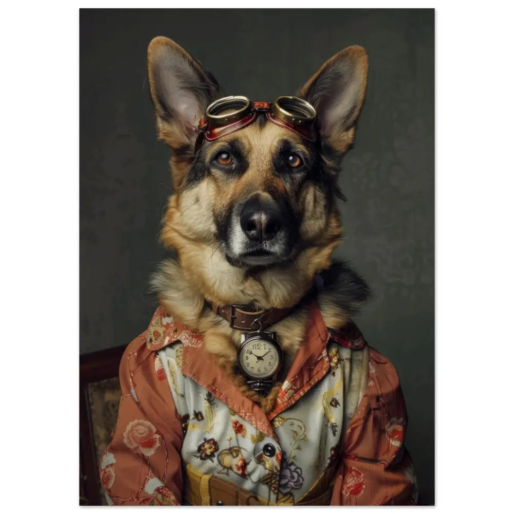 Deze afbeelding toont een dier, gekleed in een prachtige vintage steampunk outfit. Het draagt een elegante, roestkleurige jas met delicate bloemmotieven en subtiele fluwelen accenten. Om de nek hangt een antieke, zilveren klok die de verfijnde uitstraling benadrukt. Op het hoofd rust een paar grote, bronzen retro-futuristische brillen met verfijnde metalen details, wat het geheel een avontuurlijke ambiance geeft. De poten zijn voorzien van schattige, beige bontachtige manchetjes en leren riemen met contrasterende stiksels. De achtergrond is bedekt met een vintage bloemenbehang, wat de romantische sfeer van het portret versterkt.