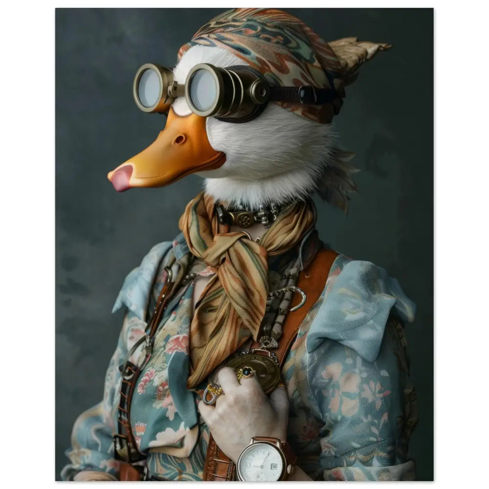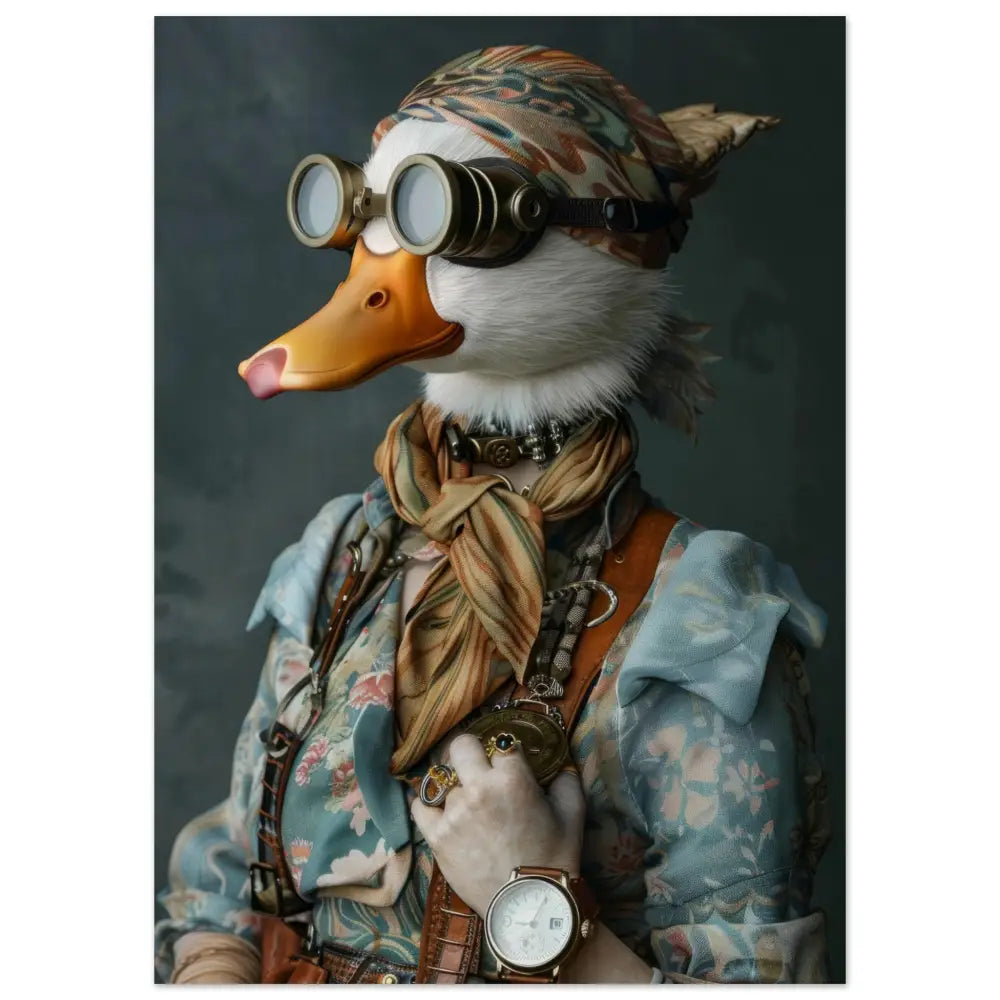 Deze afbeelding toont een dier, gekleed in een prachtige vintage steampunk outfit. Het draagt een elegante, lichtblauwe jas met bloemmotieven en delicate patronen. Om de nek hangt een antieke gouden klok, die de verfijnde esthetiek versterkt. De kop wordt gesierd door een set robuuste, koperen brillen met metalen details, waardoor deze eruitziet als een ondeugende ontdekkingsreiziger. De vleugels zijn versierd met kleurrijke, sjaalachtige accenten die de steampunk vibe versterken. Het geheel is afgewerkt met leren banden en contrasterende stiksels. De achtergrond toont een gedempte, grijsblauwe wand, wat bijdraagt aan de mystieke sfeer van het portret.