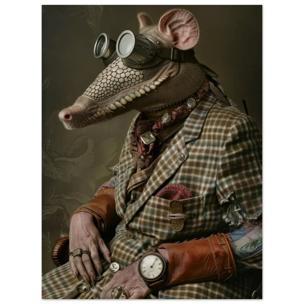 Deze afbeelding toont een dier, gekleed in een prachtige vintage steampunk outfit. Het draagt een elegante ruitjas in tinten bruin en groen, met subtiele rafels en patronen die de verfijning accentueren. Om de nek van het dier hangt een antieke zilveren klok, die een vleugje klassieke stijl toevoegt. De kop is uitgerust met een paar grote, retro-futuristische brillen met metalen details in een donkere bronstint, wat een avontuurlijke uitstraling geeft. De voorpoten zijn versierd met leren accenten en zijn voorzien van bontachtige manchetjes. De achtergrond toont een mooie, gedetailleerde patroon die het steampunk-thema perfect aanvult.