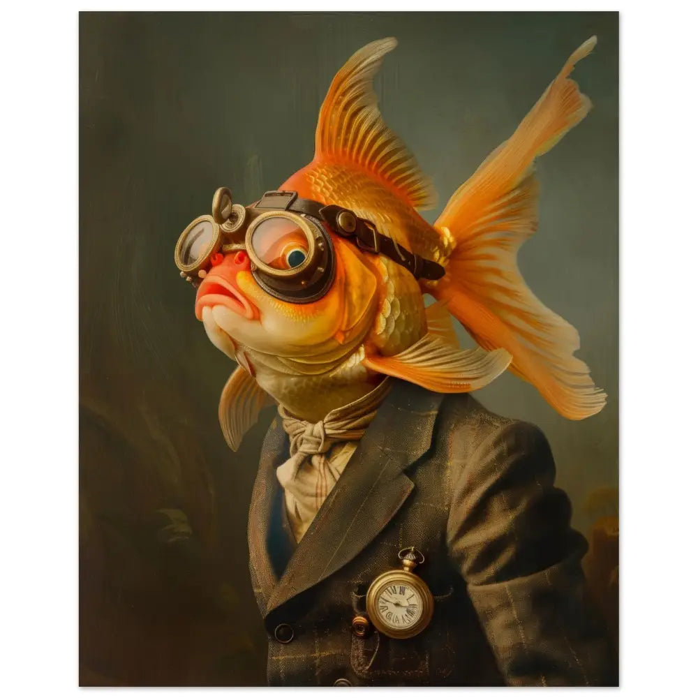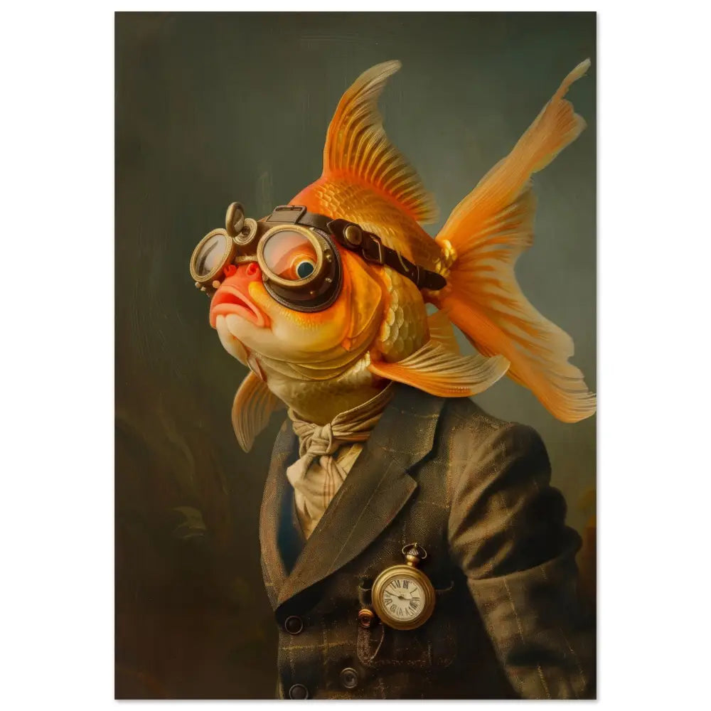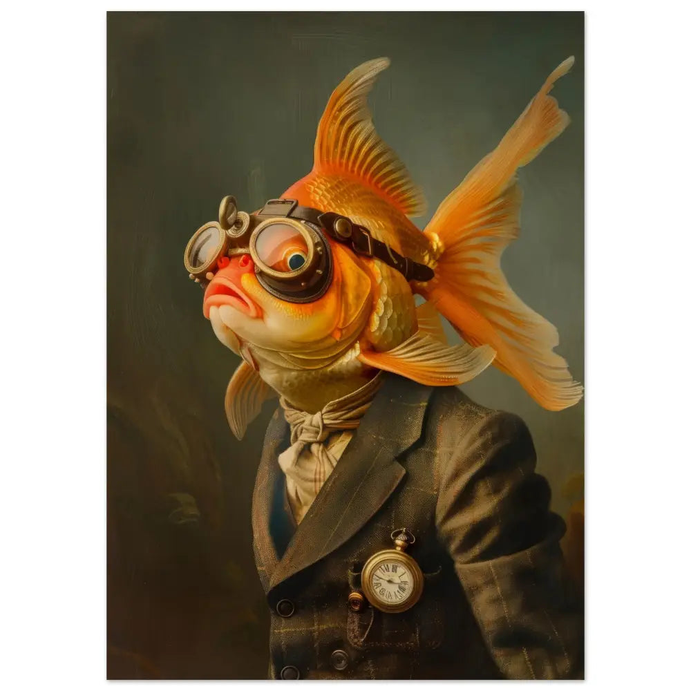 Deze afbeelding toont een dier, gekleed in een prachtige vintage steampunk outfit. Het draagt een stijlvolle, donkergrijze jas met subtiele goudkleurige lijnen en klassieke knopen. Om de nek hangt een antieke gouden klok, die de elegantie versterkt. De kop is uitgerust met een paar grote, retro-futuristische brillen met bronzen metalen details, wat een spannende tijdreizigerslook geeft. De vinnen van het dier zijn vrij van accessoires, maar de nette crèmekleurige sjaal om de nek voegt een vleugje verfijning toe. De achtergrond heeft een mysterieuze, donkere tint die de aandacht naar het imposante portret van de vis trekt.