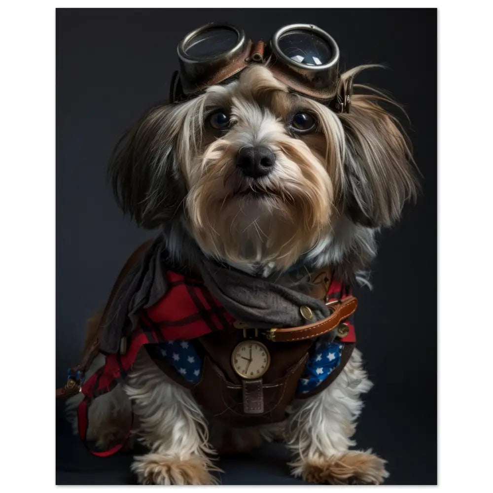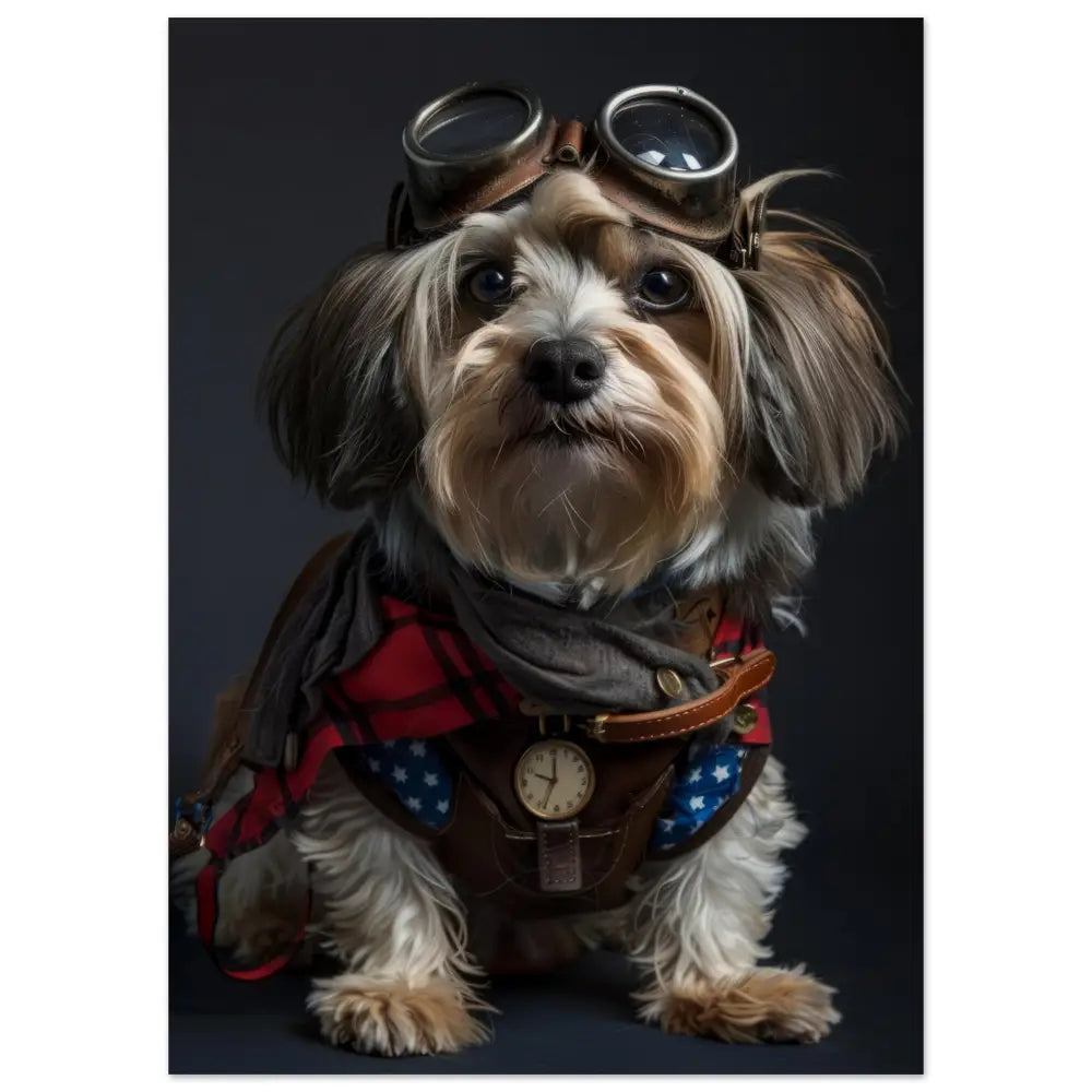 Deze afbeelding toont een hond, gekleed in een prachtige vintage steampunk outfit. Het draagt een rijk versierde, rode jas met tartan patronen en leren accenten. Om de nek hangt een antieke gouden klok, die prachtig afsteekt tegen de donkere vacht. De kop wordt gesierd door een paar grote, retro-futuristische brillen met metalen details in bronzen tinten, wat de hond een avontuurlijk tintje geeft. De pootjes zijn afgewerkt met stijlvolle, bontachtige manchetjes en kleine leren riemen, die de outfit compleet maken. De achtergrond is eenvoudig en donker, waardoor de levendige details van de steampunk-kleding nog meer opvallen.