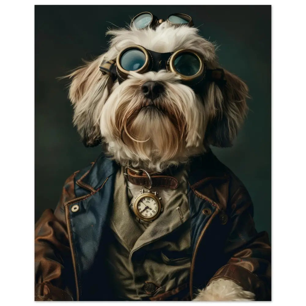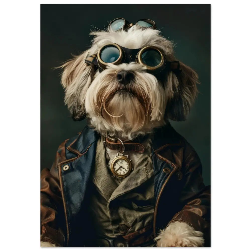 Deze afbeelding toont een hond, gekleed in een prachtige vintage steampunk outfit. De hond draagt een statige, donkerblauwe jas met bruin leren accenten en verfijnde stiksels. Om de nek hangt een antieke zilveren klok, die subtiel glanst tegen de achtergrond van de jas. De kop is voorzien van een paar grote, retro-futuristische brillen met bronzen metalen details, wat het een avontuurlijke uitstraling geeft. De pootjes zijn afgewerkt met elegante, witte bontachtige manchetjes die een luxueuze toets toevoegen. De achtergrond is eenvoudig en donker, waardoor de hond en zijn outfit nog meer in het oog springen.