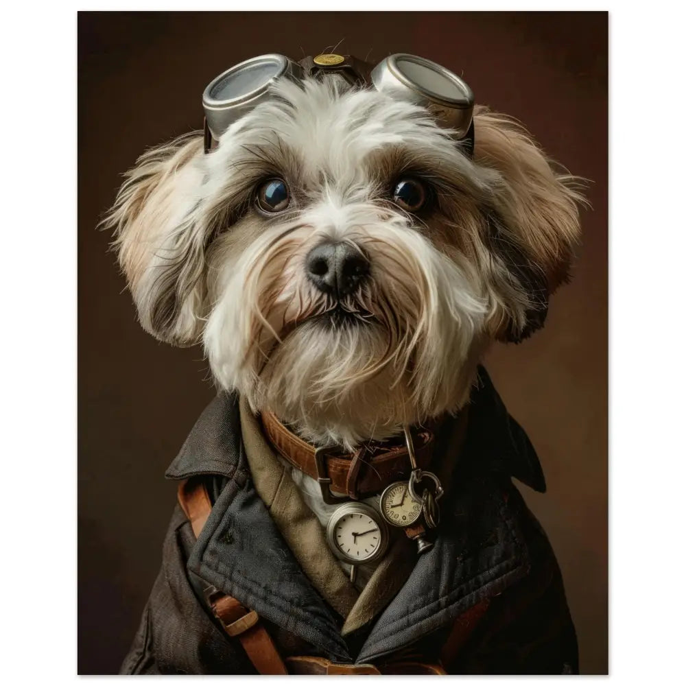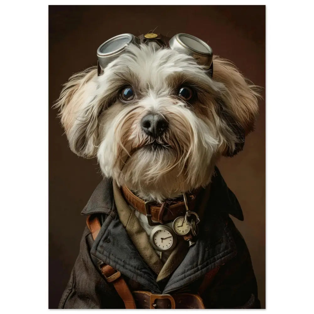 Deze afbeelding toont een hond, gekleed in een prachtige vintage steampunk outfit. Het draagt een elegante, diepzwarte jas met subtiele zilverachtige stiksels en leren accenten. Om de nek hangt een antieke bronzen klok, die schittert tegen de lichte vacht. Het hoofd wordt gesierd door een paar imposante, retro-futuristische brillen met zilveren metalen details, wat de hond een avontuurlijke uitstraling geeft. De nek is versierd met een leren band met extra zakhorloges, wat de tijdreis-thema versterkt. De achtergrond is een warme, bruine tint die de vintage sfeer compleet maakt en de aandacht naar de hond trekt.