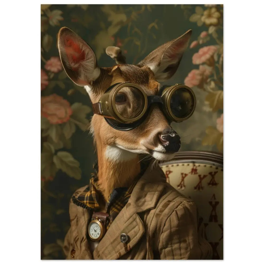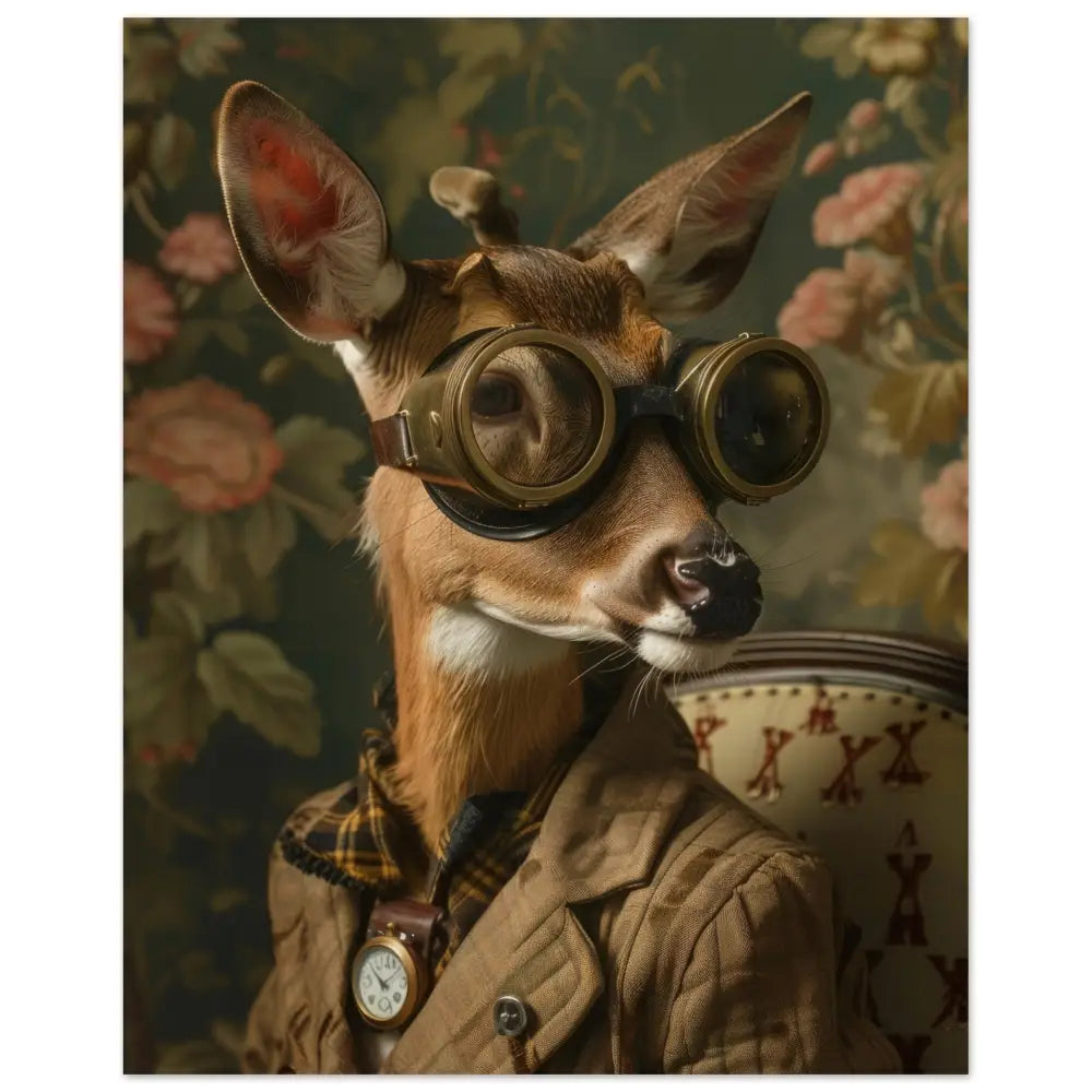 Deze afbeelding toont een dier, gekleed in een prachtige vintage steampunk outfit. Het draagt een stijlvolle, bruine geruite jas met subtiele patronen en elegante accenten. Om de nek hangt een antieke bronzen klok, die de klassieke uitstraling versterkt. De kop wordt gesierd door een paar grote, retro-futuristische brillen met metalen details in goudkleur, waardoor dit dier een mysterieus en avontuurlijk uiterlijk krijgt. De pootjes zijn voorzien van verfijnde, leren manchetjes die het geheel professioneel afmaken. De afbeelding is verder verfraaid met een nostalgische achtergrond vol bloeiende bloemen, die een charmante en romantische sfeer creëren.