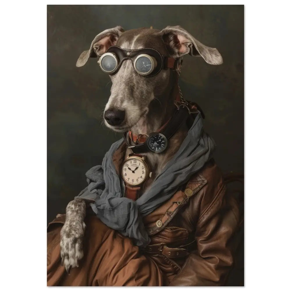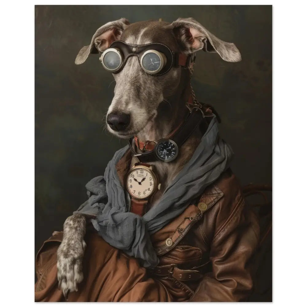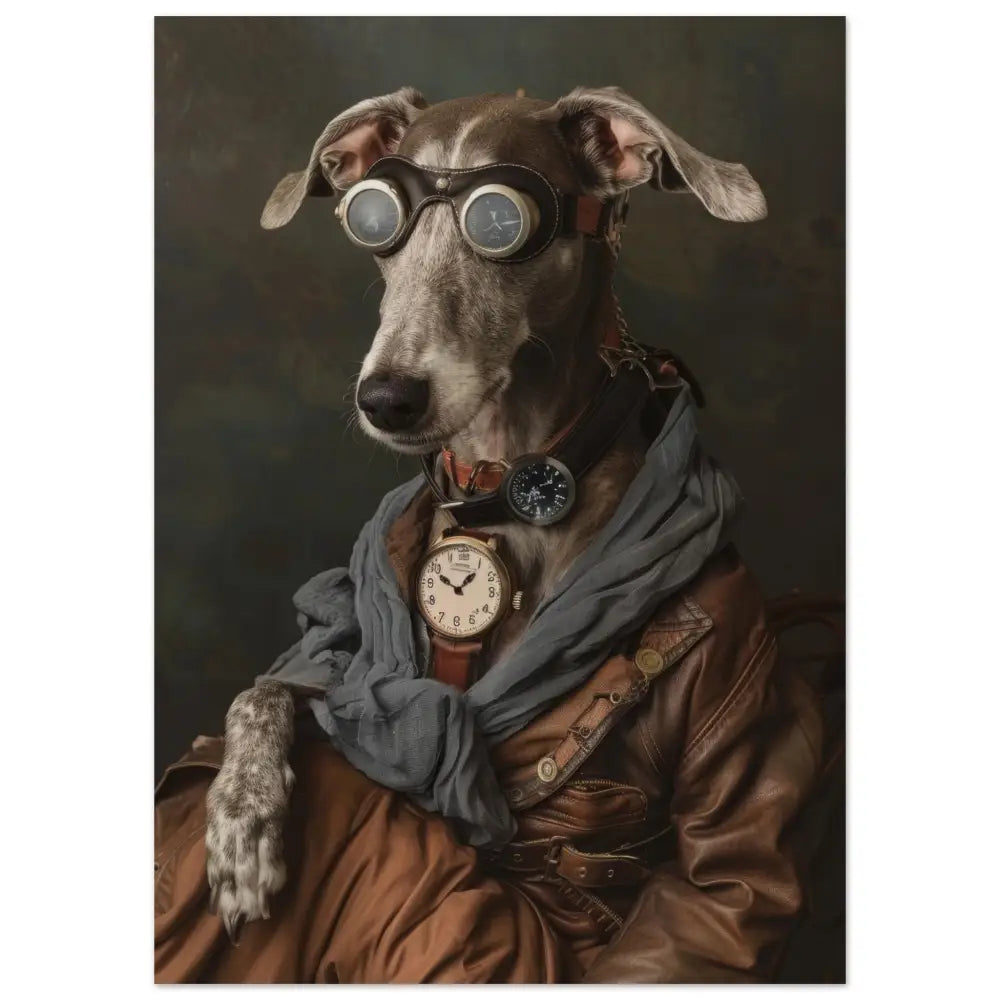 Deze afbeelding toont een dier, gekleed in een prachtige steampunk outfit. Het draagt een elegante, bruine leren jas met subtiele stiksels en knopen van messing, die nauwsluitend om het lichaam gewikkeld is. Om zijn nek hangt een antieke gouden klok, die een vleugje nostalgie toevoegt aan de vorstelijke uitstraling. De kop wordt gesierd door een paar imposante, ronde brillen met donkere metalen details, waardoor het een mysterieuze uitstraling krijgt. Zijn poot is voorzien van een zachte, lichtgrijze sjaal die het geheel verfijnt. De achtergrond vormt een dof, abstract patroon dat de nadruk op het stijlvolle wezen benadrukt.