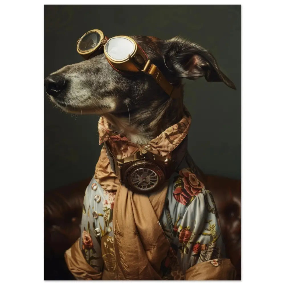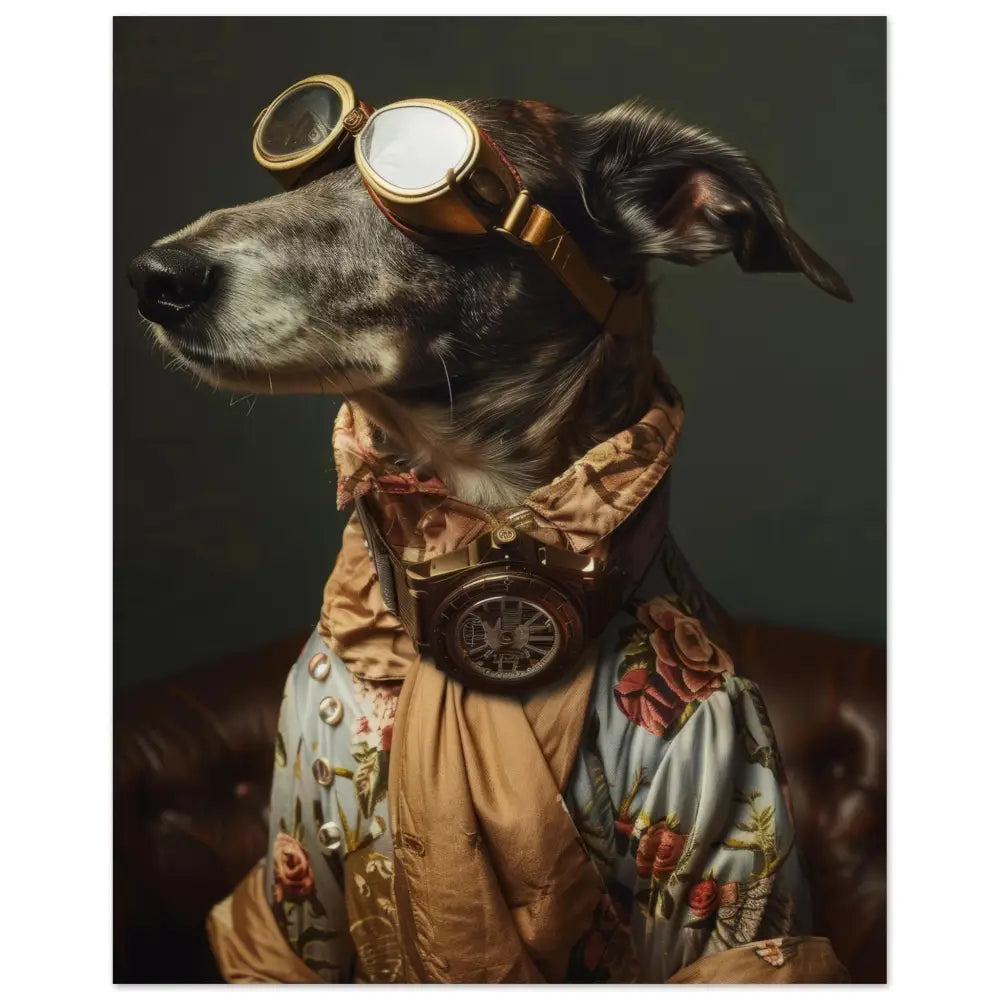 Deze afbeelding toont een dier, gekleed in een prachtige vintage steampunk outfit. Het draagt een sierlijke, lichtblauwe jas met rijke florale patronen en gouden accenten. Om de nek hangt een imposante antieke bronzen klok, die de verfijnde uitstraling versterkt. De kop wordt gesierd door een paar grote, retro-futuristische brillen met robuuste metalen details in een warme goudkleur, waardoor deze eruitziet als een avontuurlijke tijdreiziger. De pootjes zijn voorzien van elegante, zijdeachtige manchetjes die het geheel afmaken. De achtergrond is ingetogen met een leerachtige bank, waardoor het schilderij een klassiek en tijdloos gevoel krijgt.
