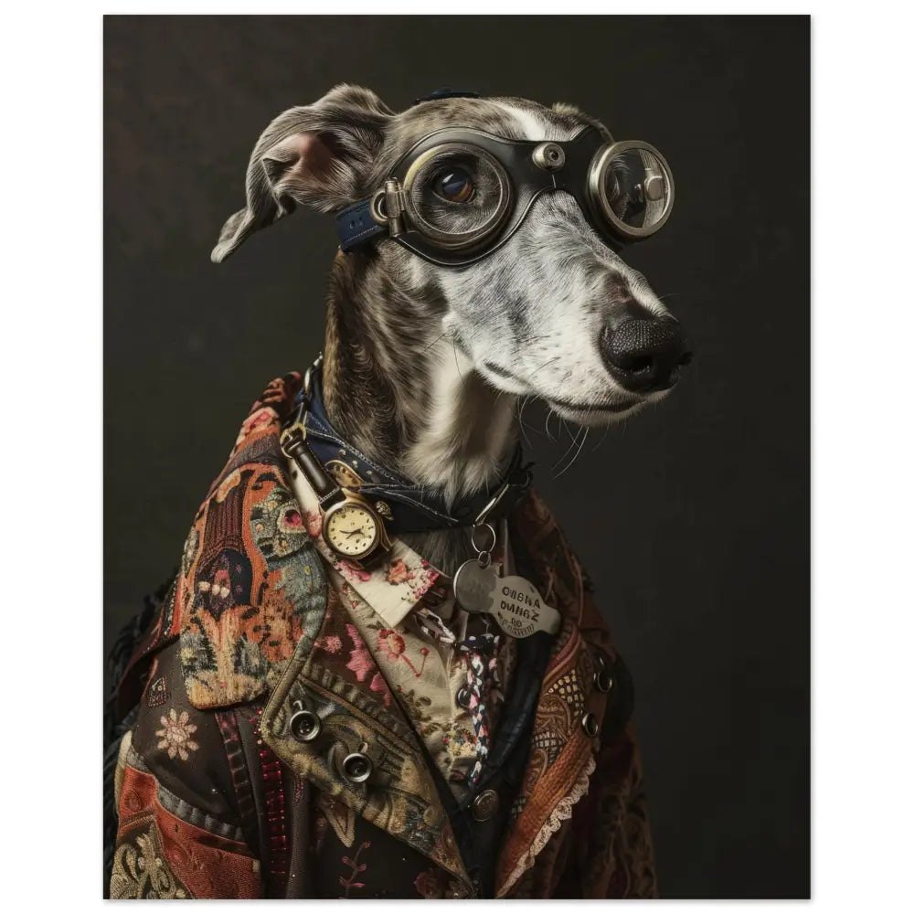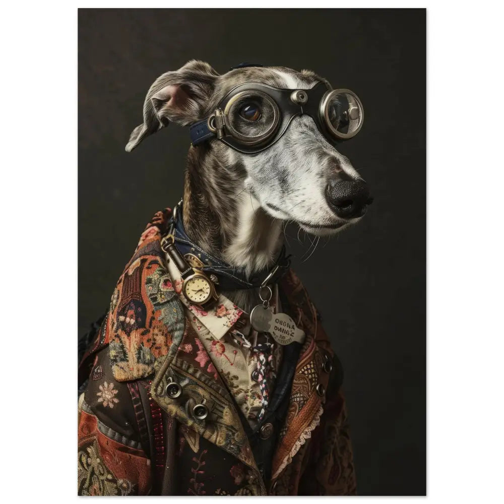 Deze afbeelding toont een dier, gekleed in een prachtige vintage steampunk outfit. Het draagt een stijlvolle jas met een rijk palet van warmbruine en roesttinten, versierd met ingewikkelde bloemenpatronen en accenten. Om de nek van het dier hangt een antieke gouden klok, wat de elegante uitstraling verder accentueert. De kop is uitgerust met een paar grote, retro-futuristische brillen met robuuste metalen details in zilverkleur, die een avontuurlijke geest suggereren. De poten zijn versierd met sierlijke, met bont gevoerde manchetjes en leren accenten, passend bij het geheel. De achtergrond is donker en opvallend eenvoudig, waardoor het dier als centraal middelpunt schittert.
