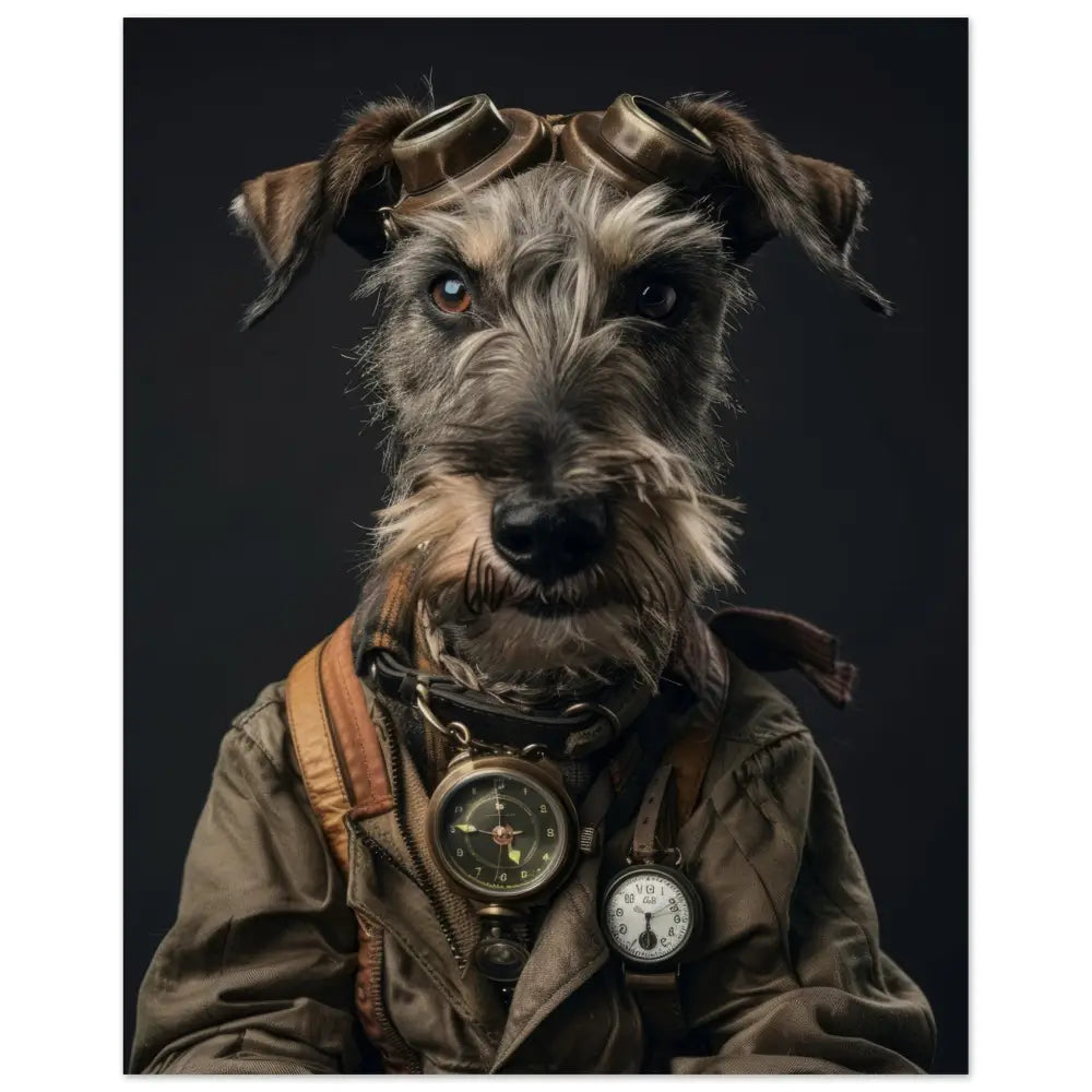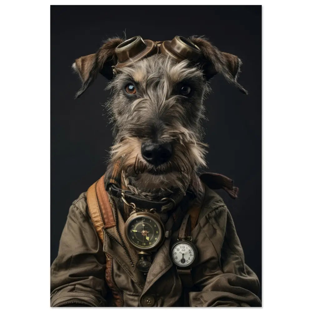 Deze afbeelding toont een dier, gekleed in een prachtige vintage steampunk outfit. Het draagt een robuuste, olijfgroene jas met leren accenten en contrasterende, koperkleurige stiksels. Om de nek hangt een antieke bronzen klok, die perfect harmonieert met de stijlvolle uitstraling van het geheel. Op het hoofd prijkt een opvallende bril met metalen details in een donkerbrons tint, wat het avontuurlijke karakter benadrukt. De jas is verder afgewerkt met een paar leren riemen en extra accessoires zoals een tweede klok, die zorgt voor een speelse, doch elegante touch. De achtergrond is donker en minimalistisch, waardoor het dier volledig in de schijnwerpers staat.