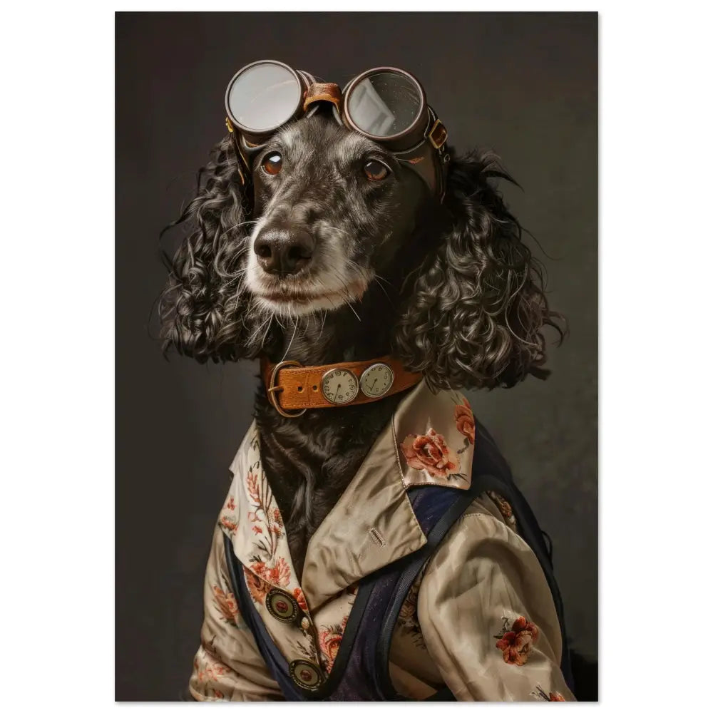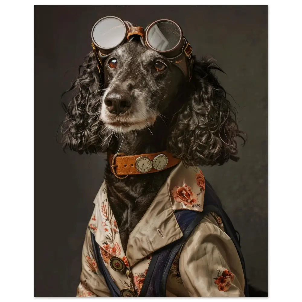 Deze afbeelding toont een hond, gekleed in een prachtige vintage steampunk outfit. Het draagt een elegante, beige jas met bloemmotieven en met koperkleurige knopen, die de klassieke charme versterkt. Om de nek hangt een antieke gouden klok, die een tijdloze eerbied uitstraalt. De kop wordt gesierd door een paar grote, retro-futuristische brillen met metalen details in bronskleur, wat het dier een avontuurlijke en onderzoekende uitstraling geeft. De mouwen zijn afgewerkt met blauwe, leren accenten en contrasterende stiksels voor een extra vleugje raffinement. De achtergrond is subtiel en donker, waardoor de aandacht volledig op het prachtig gedetailleerde portret van de hond blijft gericht.