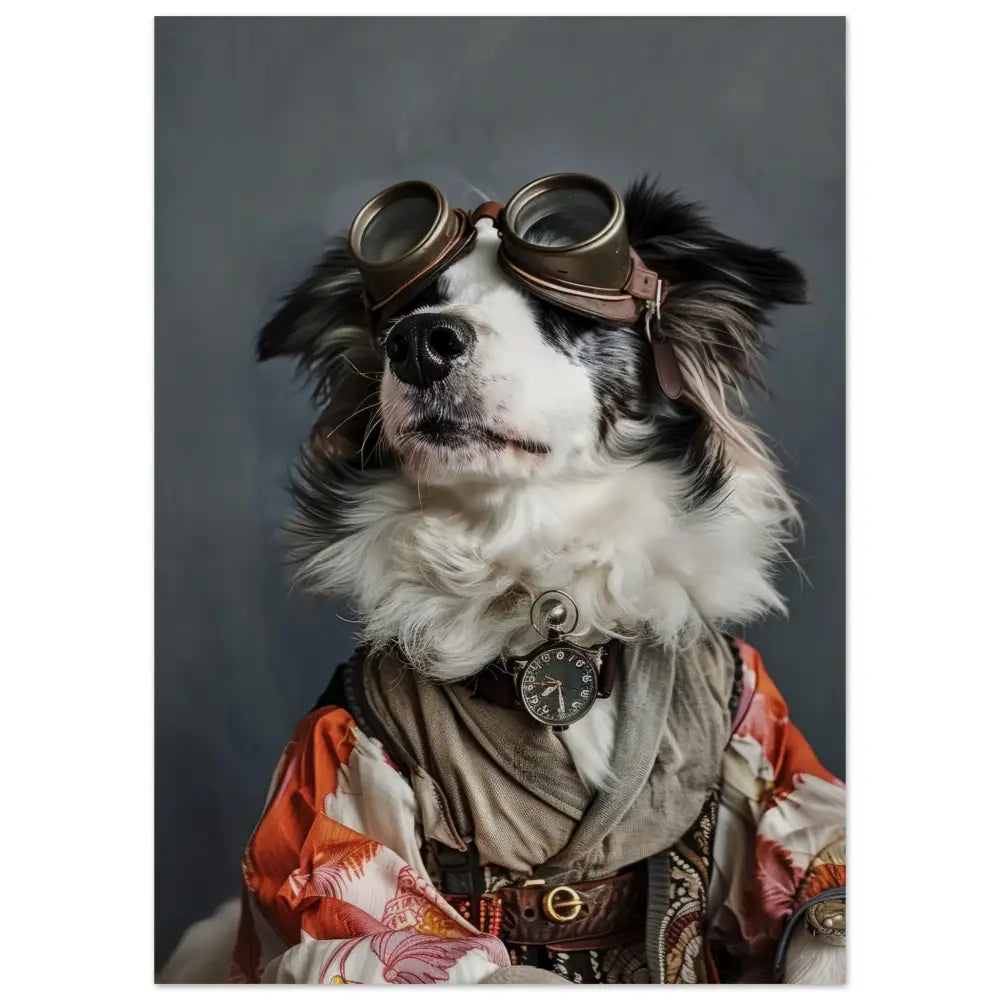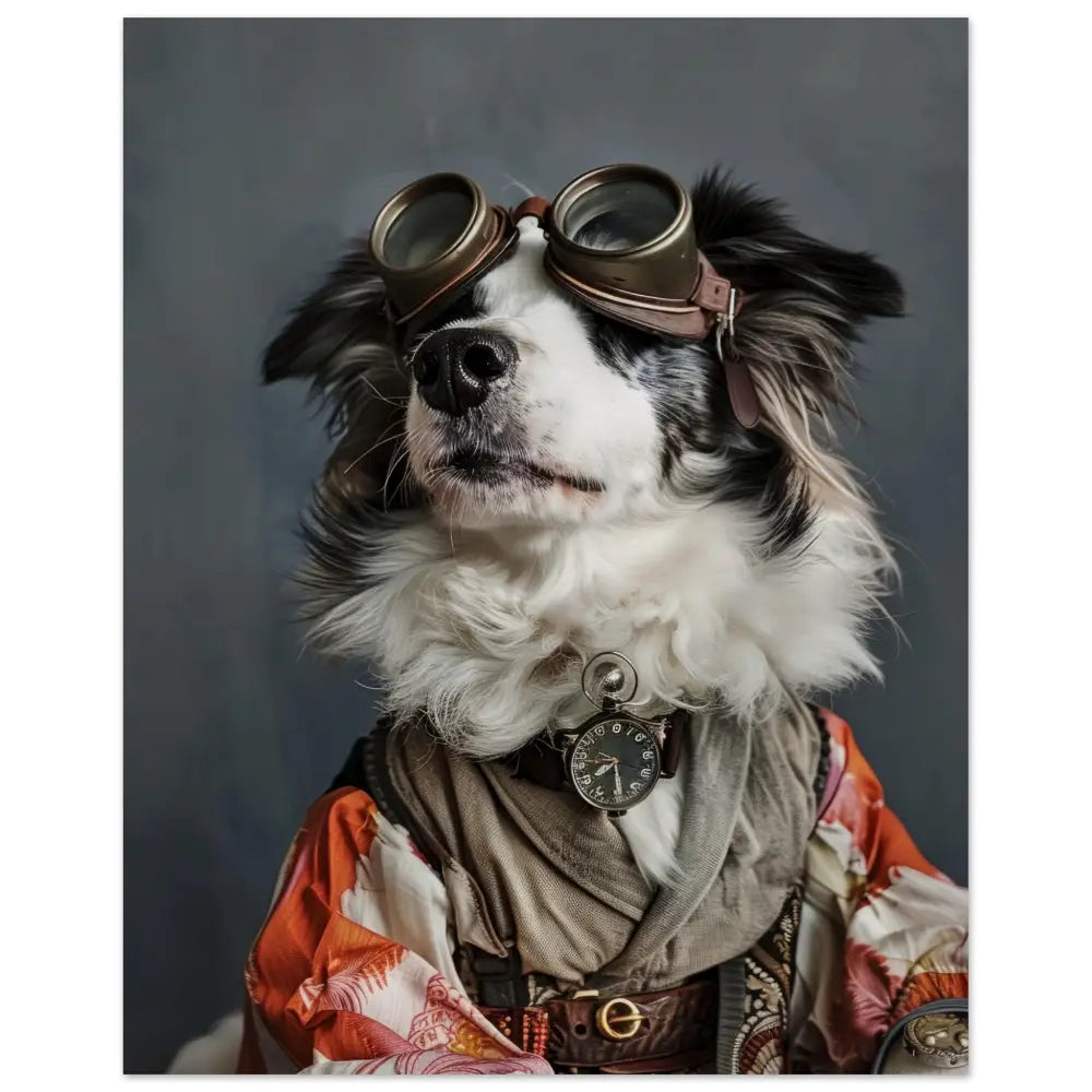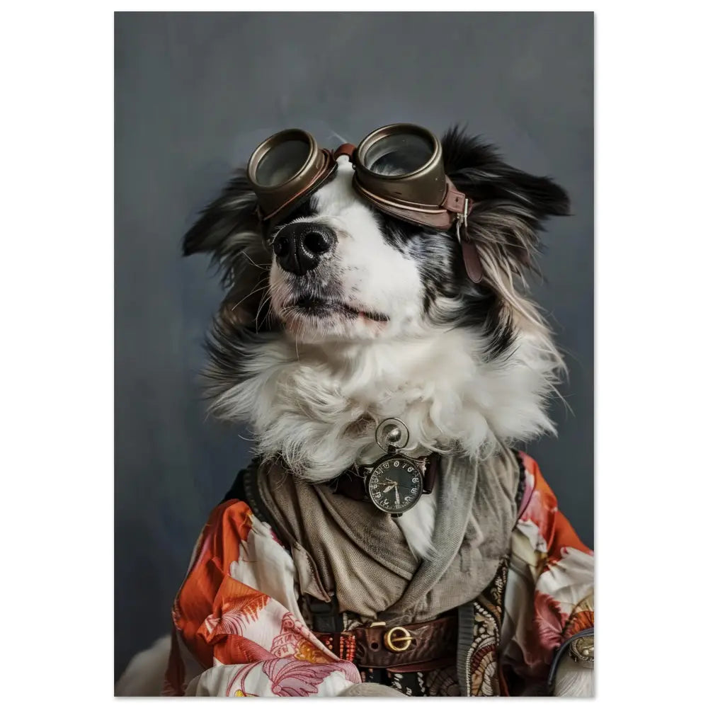 Deze afbeelding toont een dier, gekleed in een prachtige vintage steampunk outfit. Het draagt een elegante, gedetailleerde jas in warme tinten van oranje en crème, met sierlijke patronen die de stof versieren. Om de nek van het dier hangt een antieke zilveren klok, subtiel verweerd met de tijd. Op het hoofd prijkt een robuuste bril met bronzen metalen details die zijn avontuurlijk karakter benadrukken. De pootjes zijn versierd met zachte, grijze bontachtige manchetjes en leren accenten, afgewerkt met contrasterende stiksels. De achtergrond heeft een neutrale grijstint die de steampunk uitstraling van het portret versterkt.