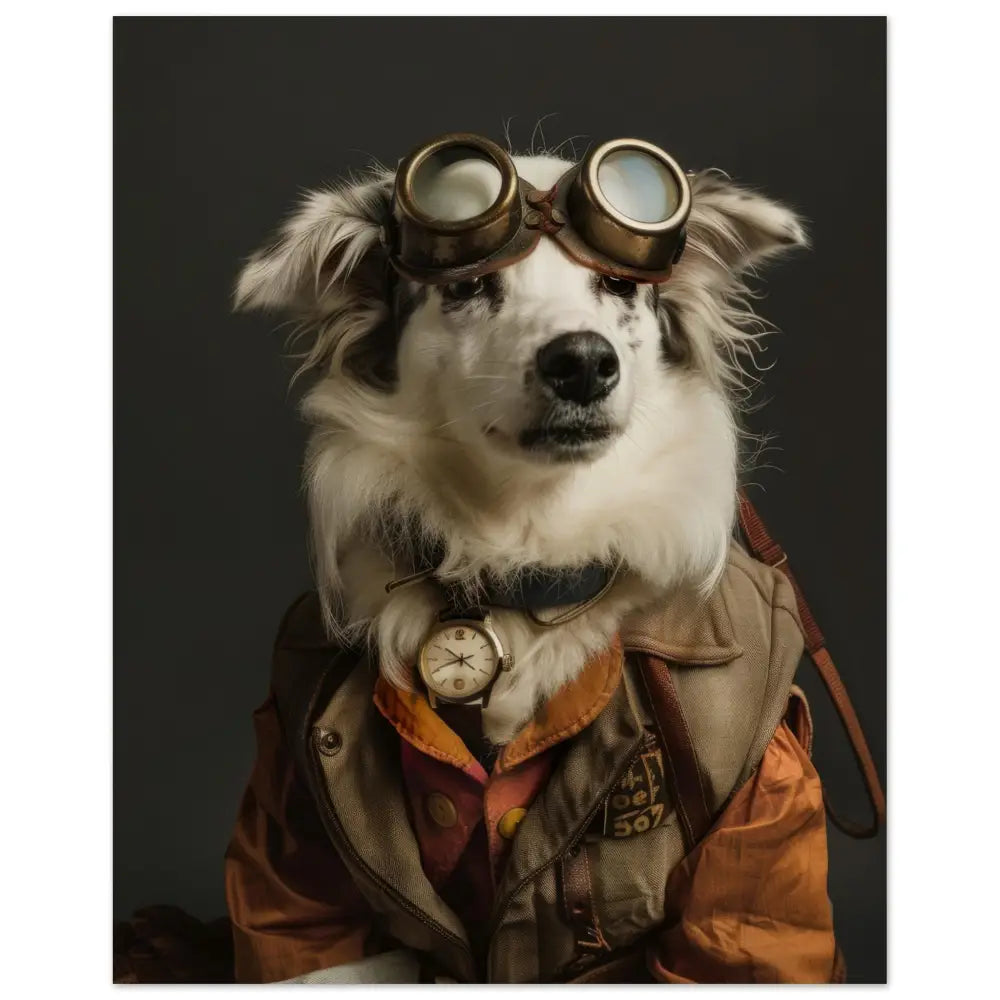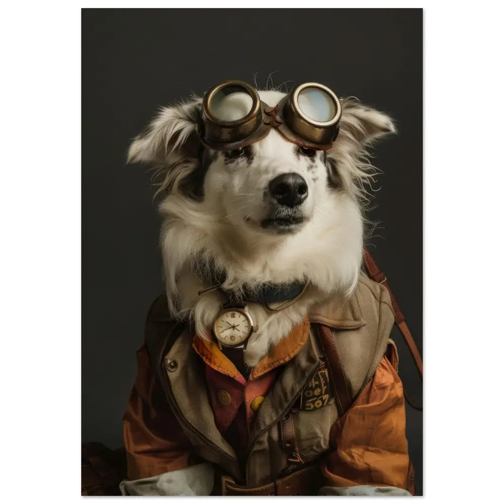 Deze afbeelding toont een dier, gekleed in een prachtige vintage steampunk outfit. Het draagt een sierlijke, bruine jas met gedetailleerde stiksels en klassieke knopen. Om de nek hangt een antieke klok, afgewerkt in glanzend goud en voorzien van een verfijnd wijzerplaatontwerp. De kop wordt gesierd door een paar indrukwekkende, metalen brillen met bronzen accenten, die een avontuurlijke tijdreiziger-look creëren. De voorpootjes zijn versierd met elegante, grijsachtige wollen manchetjes, die het geheel een luxe uitstraling geven. De achtergrond is sober gehouden in effen, donkere tinten om de focus op het imposante steampunk kostuum te leggen.