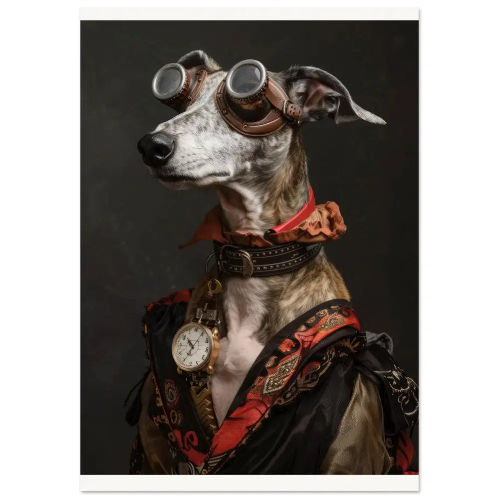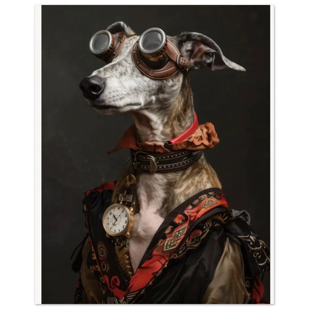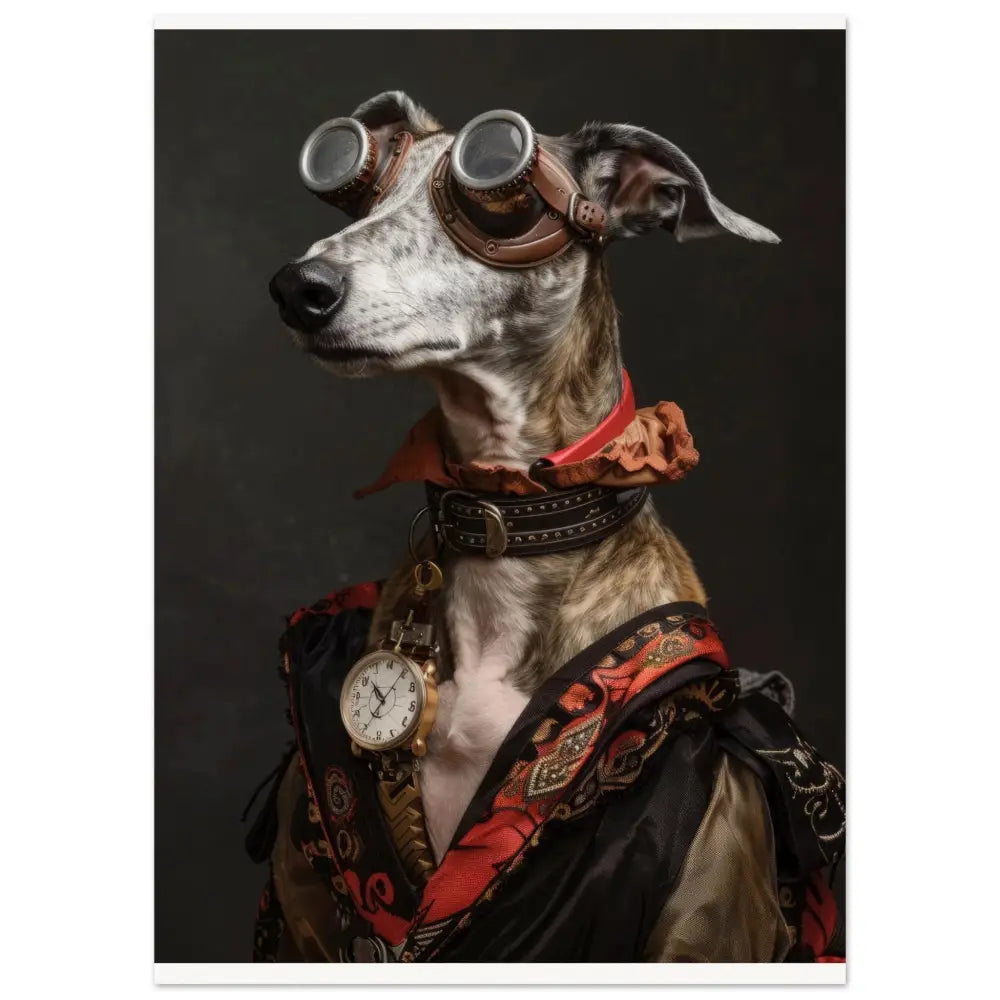 Deze afbeelding toont een dier, gekleed in een prachtige vintage steampunk outfit. Het draagt een sierlijke, zwarte jas met ingewikkelde rode en gouden patronen en fluwelen accenten. Om de nek hangt een antieke koperen klok, die de aristocratische uitstraling versterkt. De kop wordt gesierd door een paar grote, retro-futuristische brillen met metalen details in bronskleur, waardoor deze eruitziet als een avontuurlijke tijdreiziger. De pootjes zijn niet direct zichtbaar, maar zijn waarschijnlijk voorzien van elegante, bijpassende accessoires die het geheel afmaken. De afbeelding heeft een donkere, mystieke achtergrond die de steampunk sfeer benadrukt.