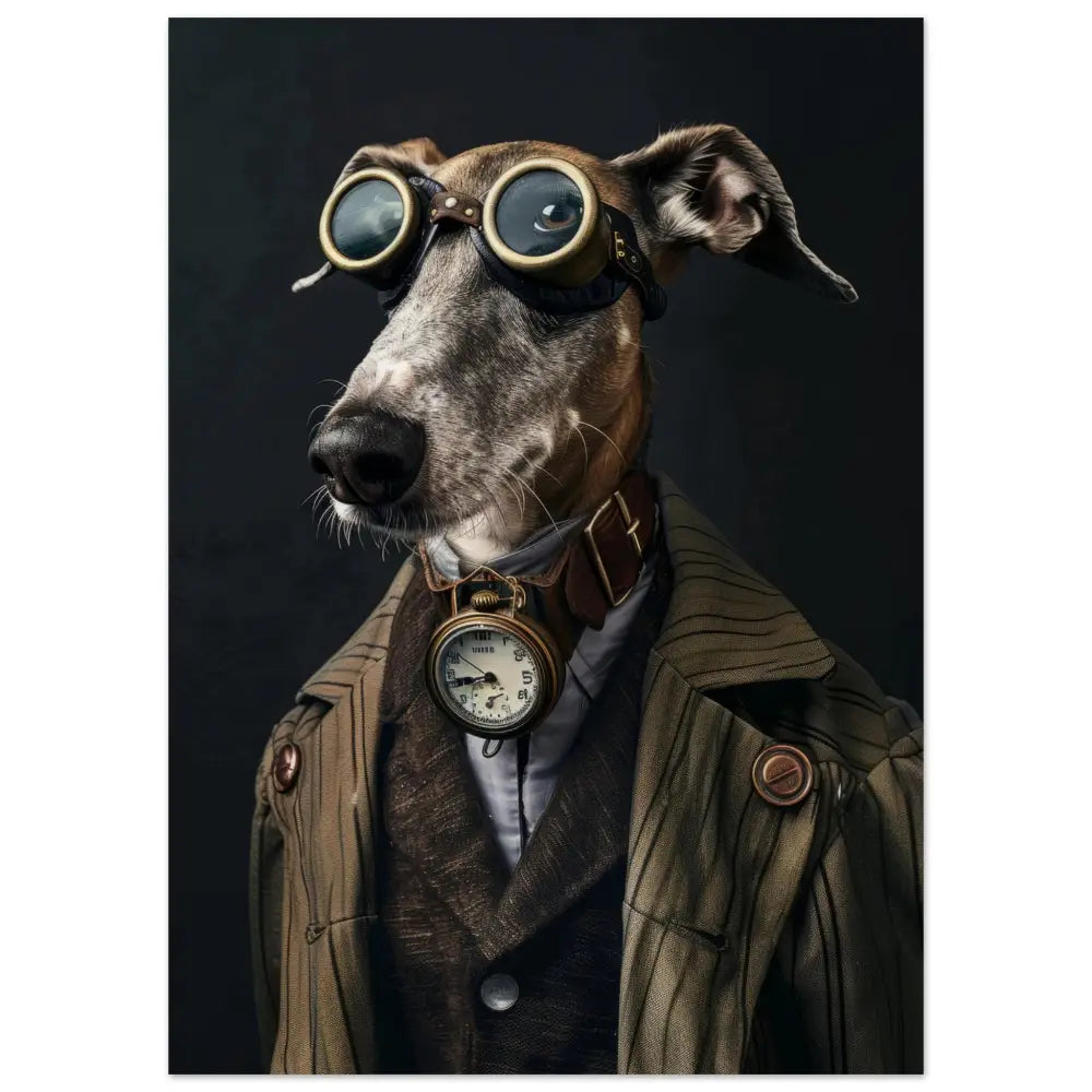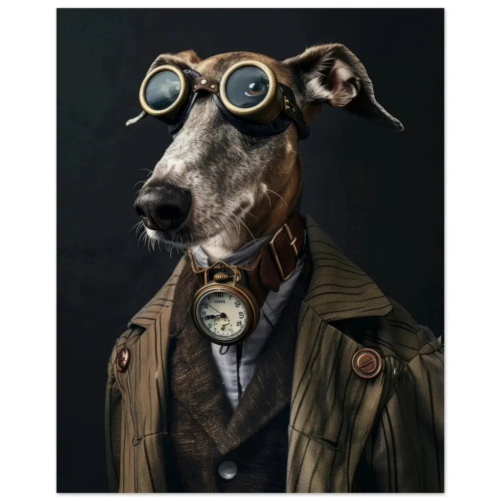 Deze afbeelding toont een dier, gekleed in een prachtige vintage steampunk outfit. Het draagt een elegante, bruin gestreepte jas met subtiele koperkleurige knopen en accenten. Om de nek hangt een antieke zakhorloge, waarvan de gouden kleur een gevoel van nostalgie en verfijning oproept. De kop is voorzien van een bril met grote lenzen en bronzen metalen details, wat doet denken aan een ontdekkingsreiziger uit vervlogen tijden. Dit is verder afgewerkt met leren accenten en contrasterende stiksels. De achtergrond is een effen donkergrijs, waardoor de verfijnde details van de stijlvolle outfit extra opvallen.